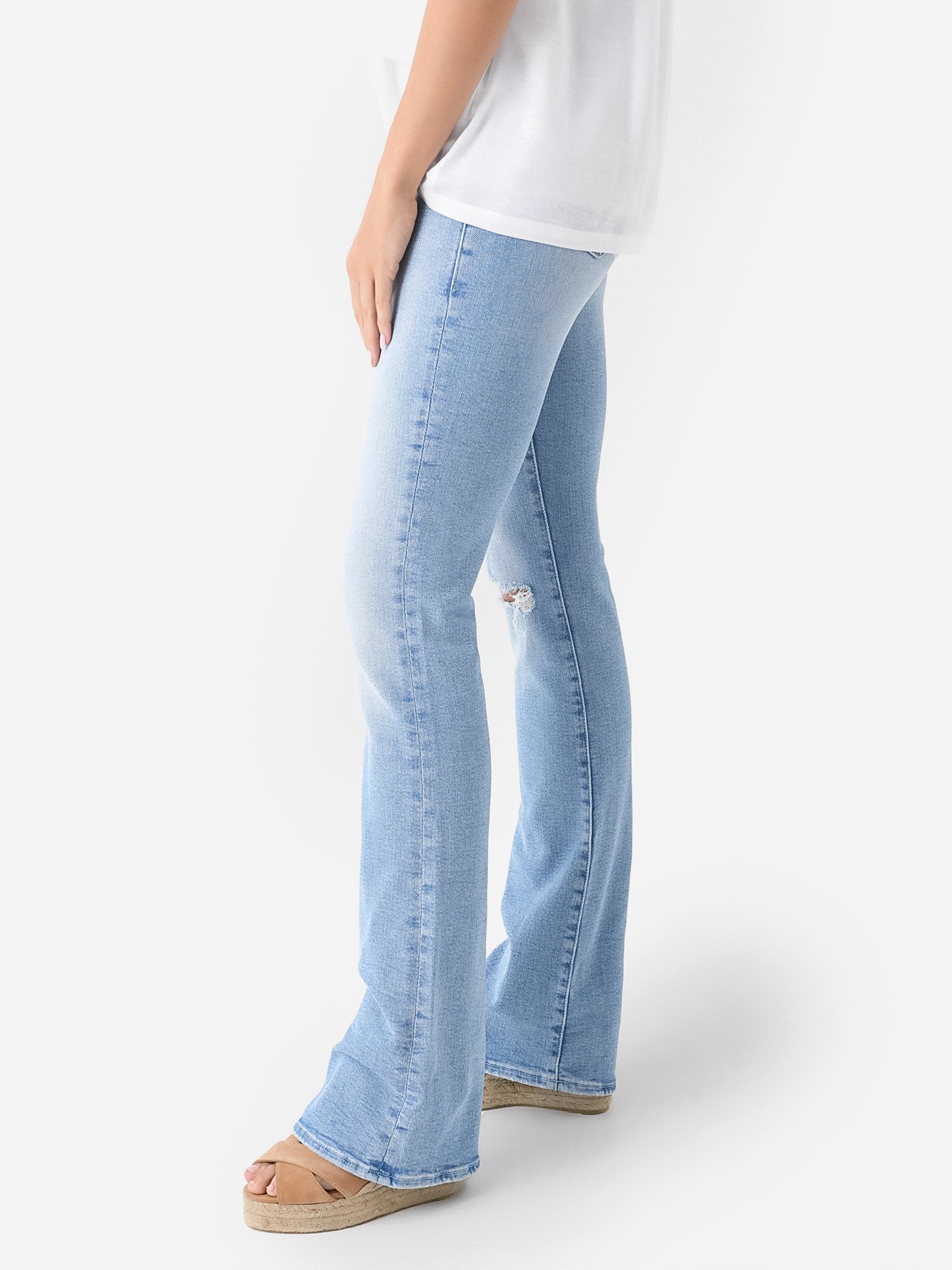 Light wash full-length flare jean with fading and distressing details.