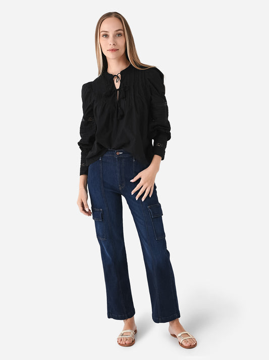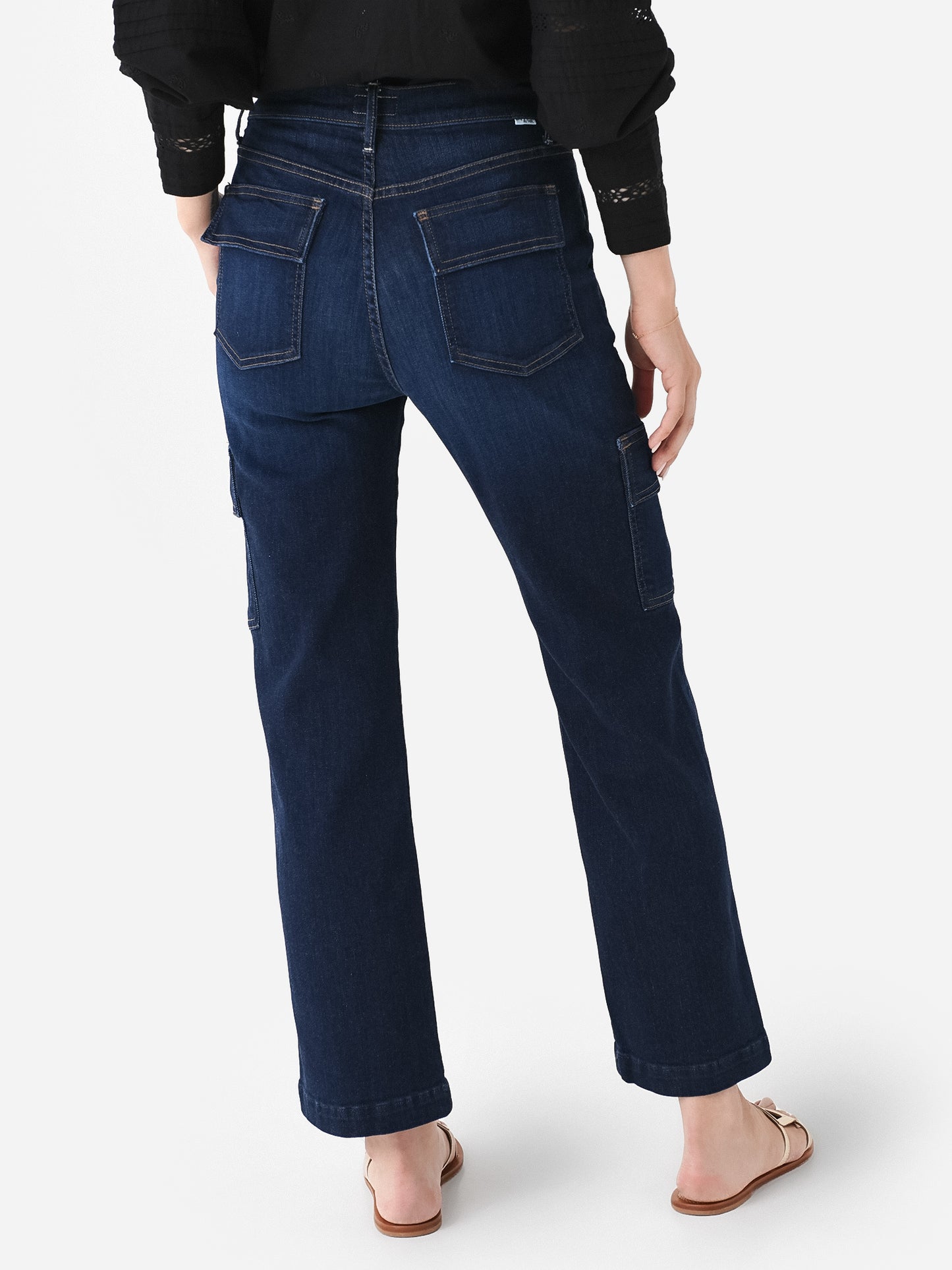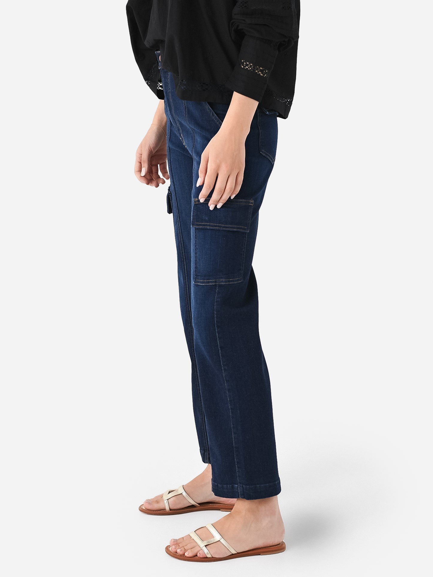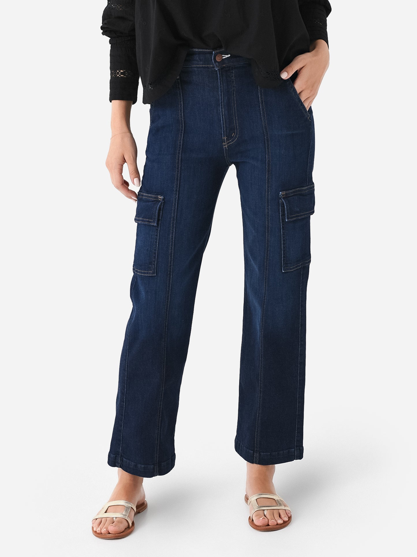 Dark wash cargo-style straight jean with a slightly cropped silhouette.