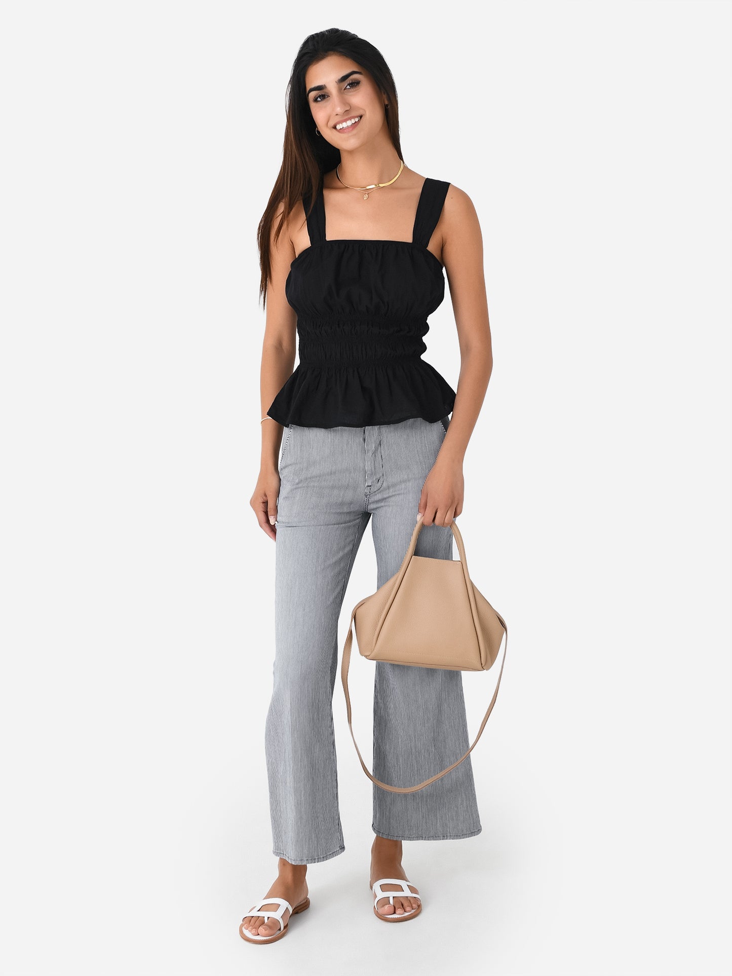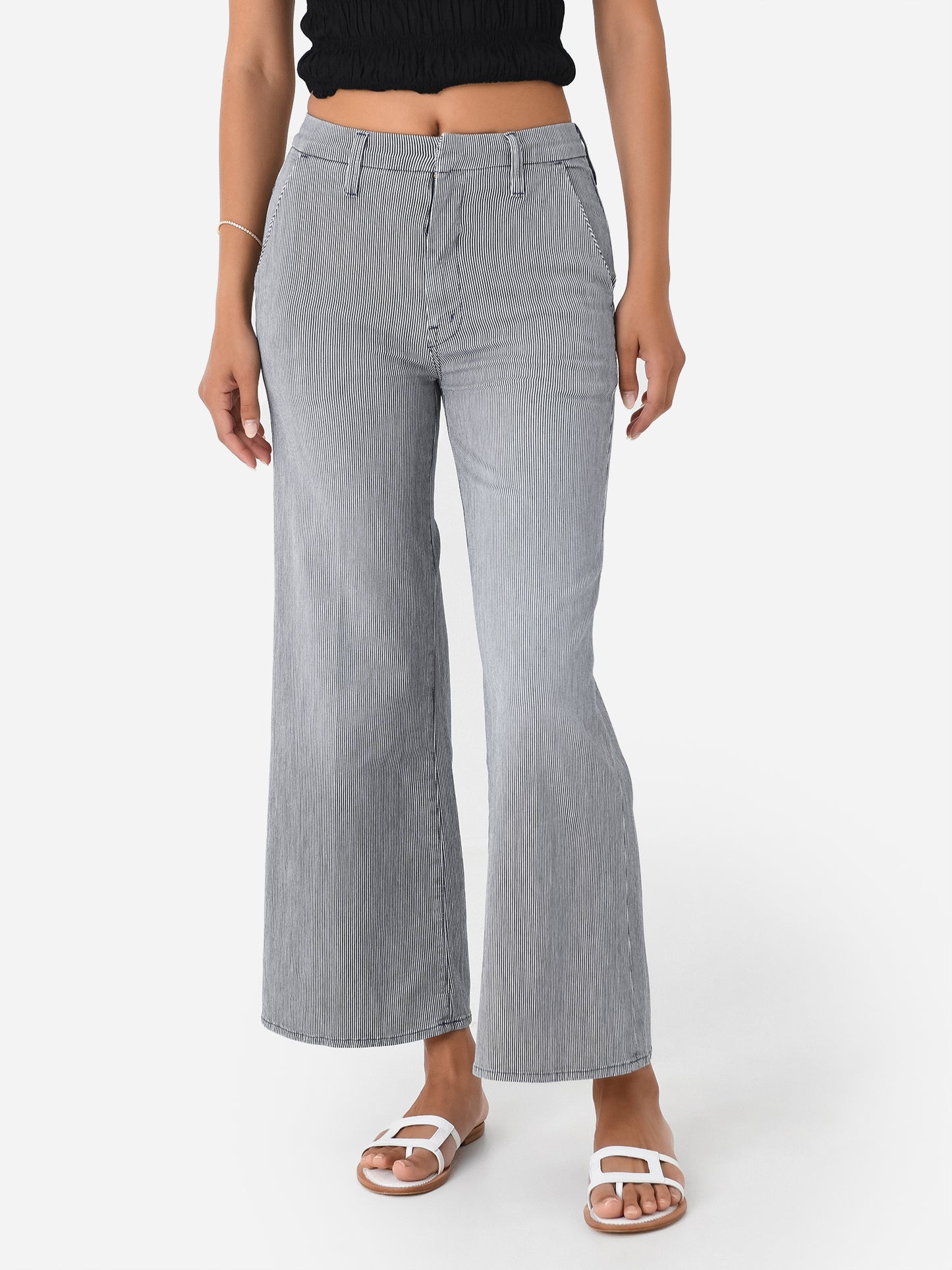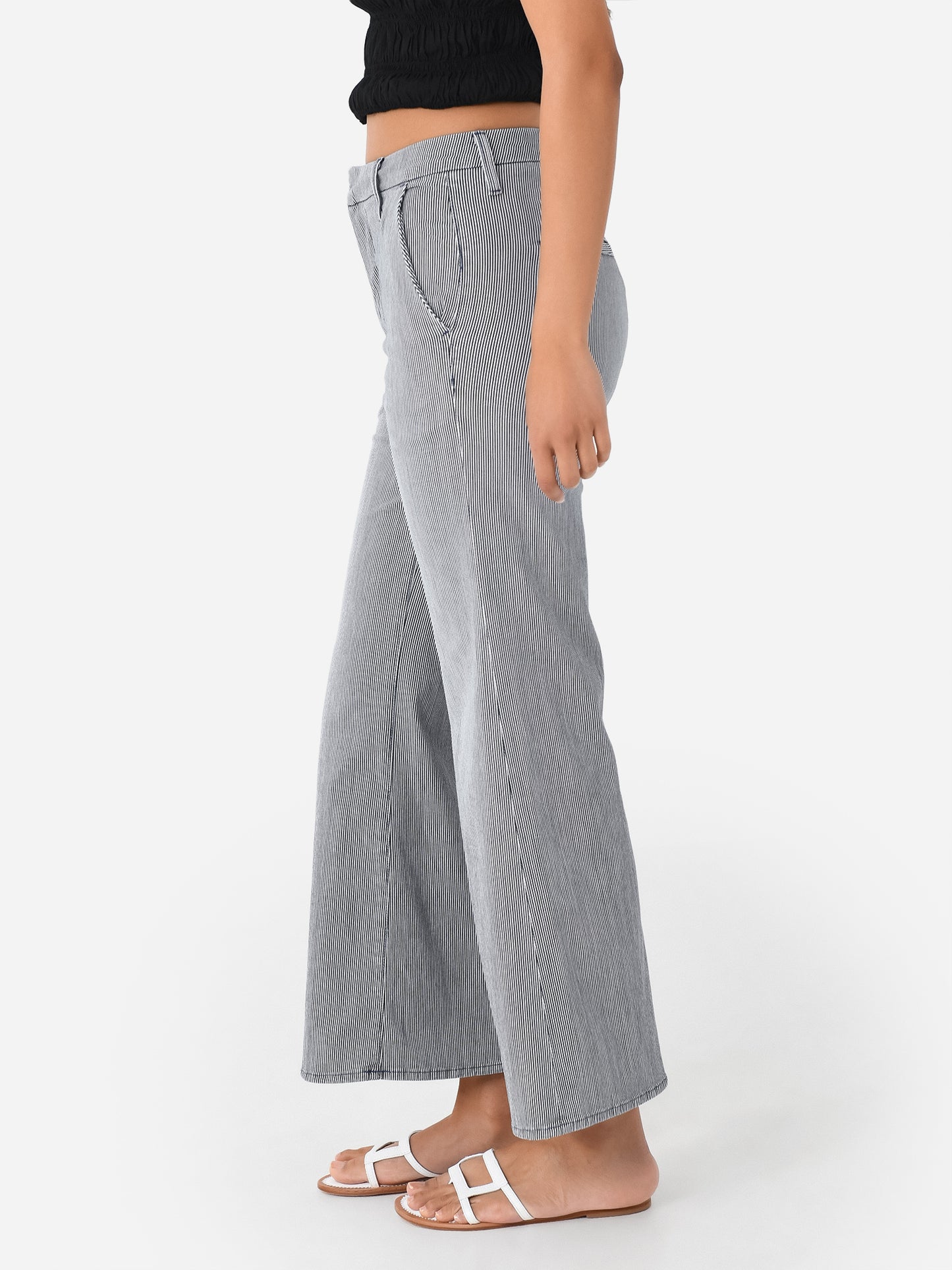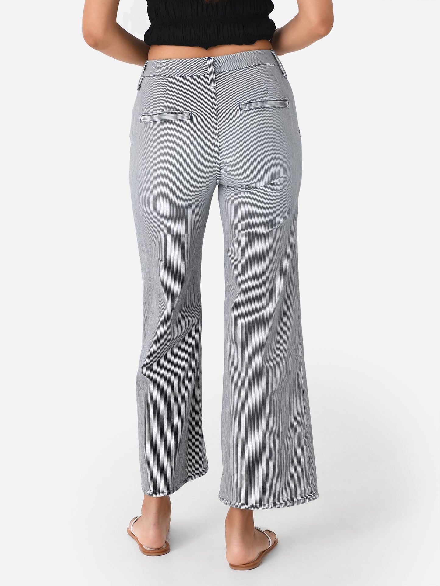 High-waisted wide-leg pant featuring back slit pockets, an ankle-length inseam, and a subtle stripe print.