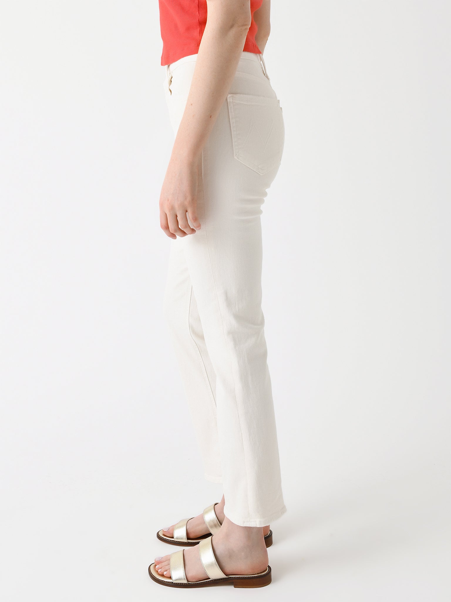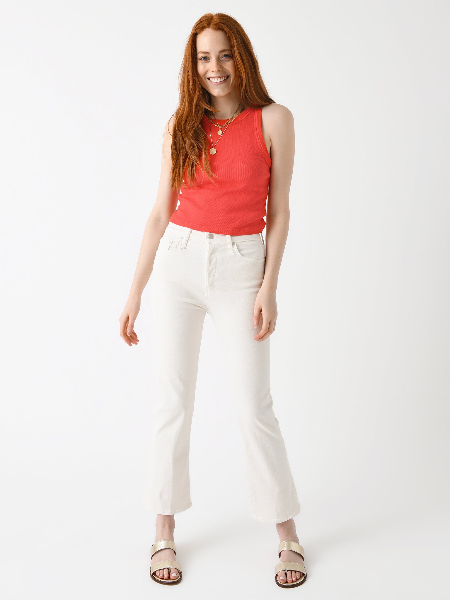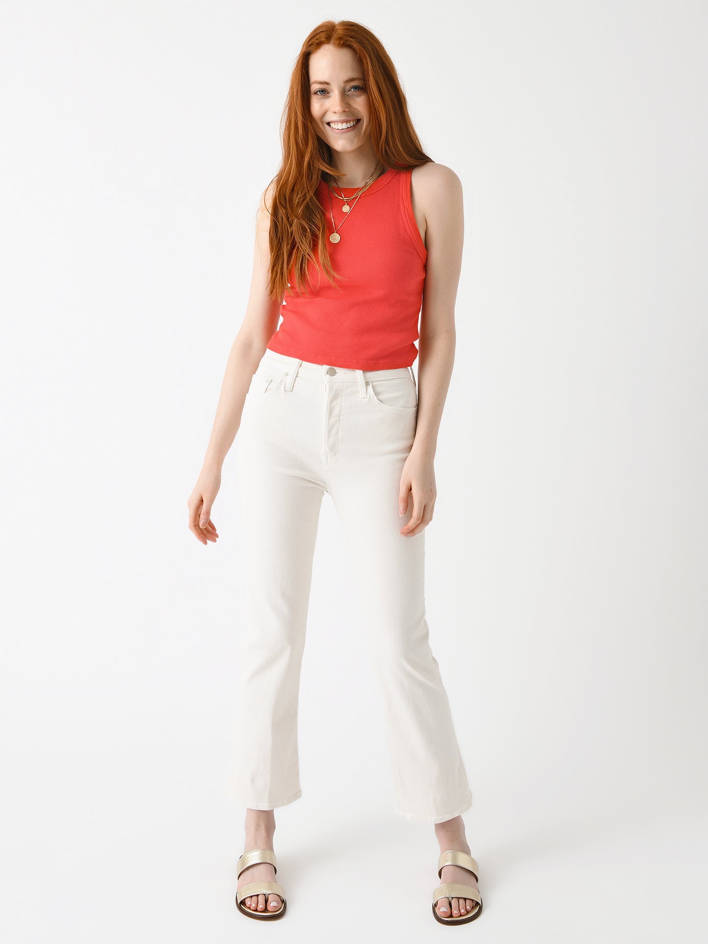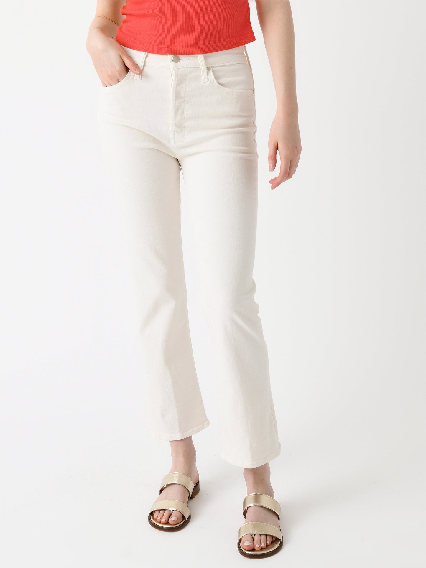 A high-waisted kick-flare jean constructed from stretch denim fabric with an ankle-length inseam.
