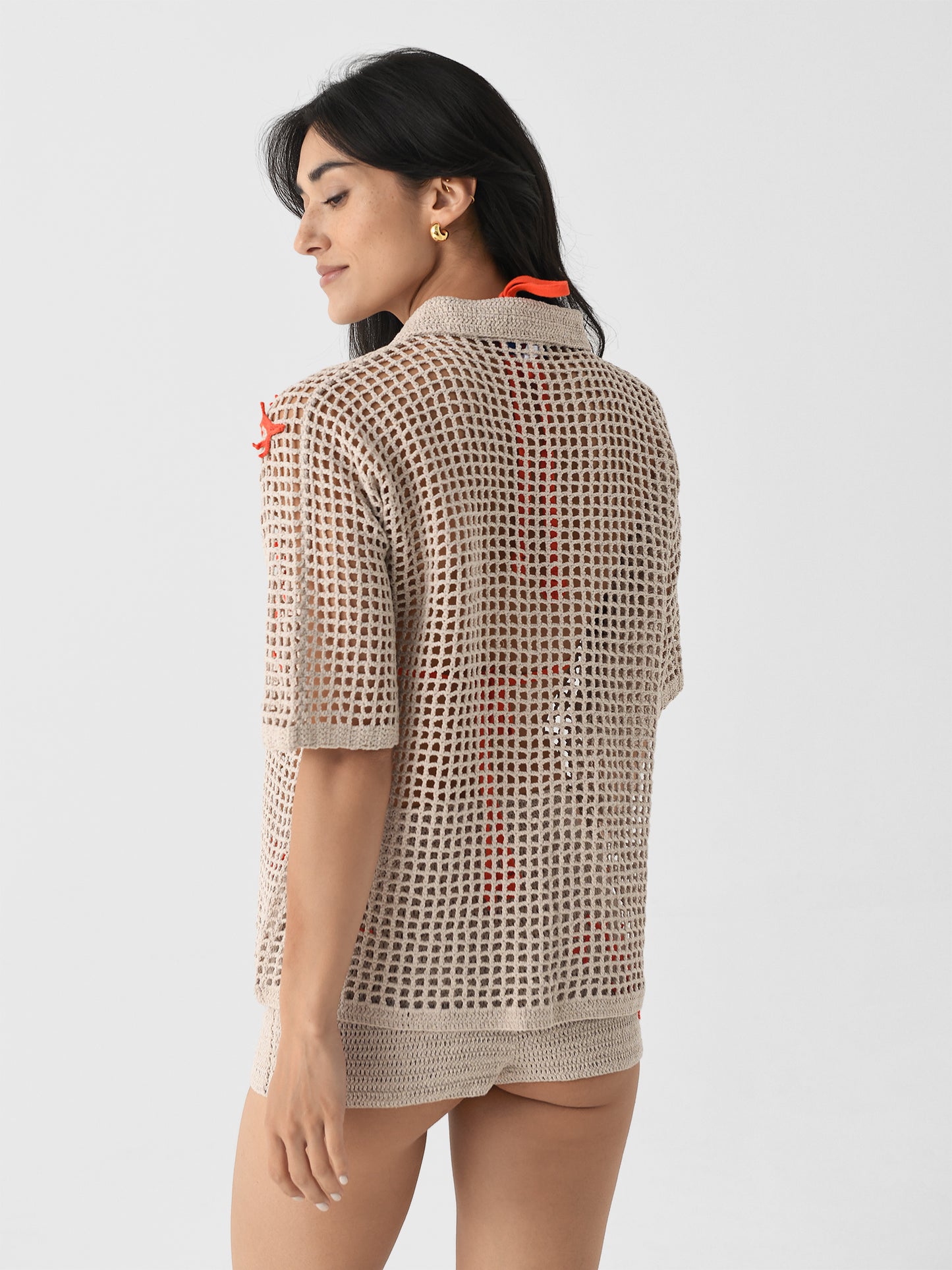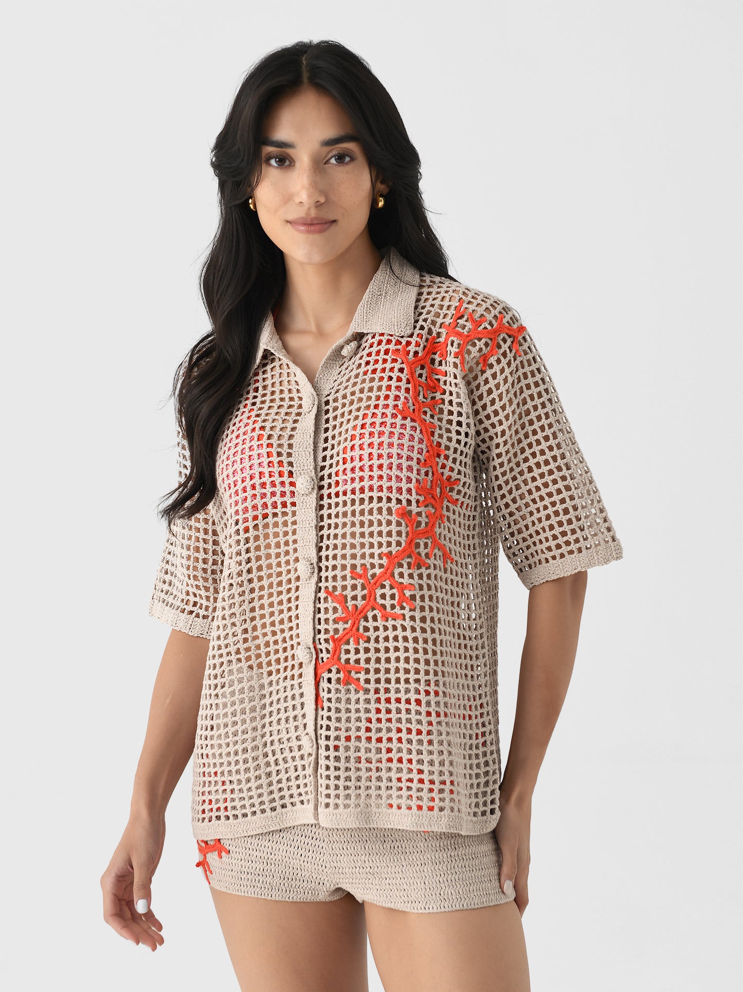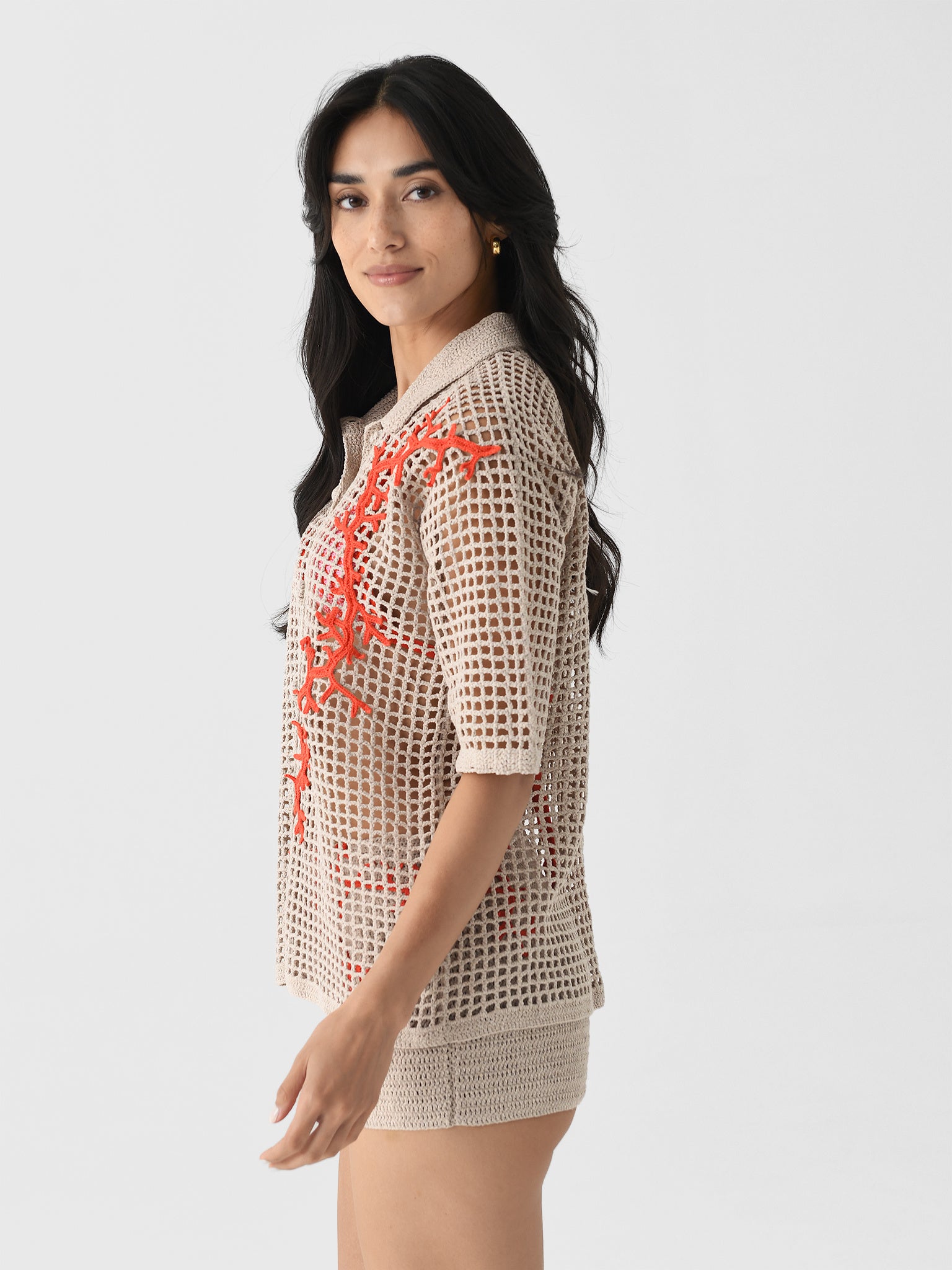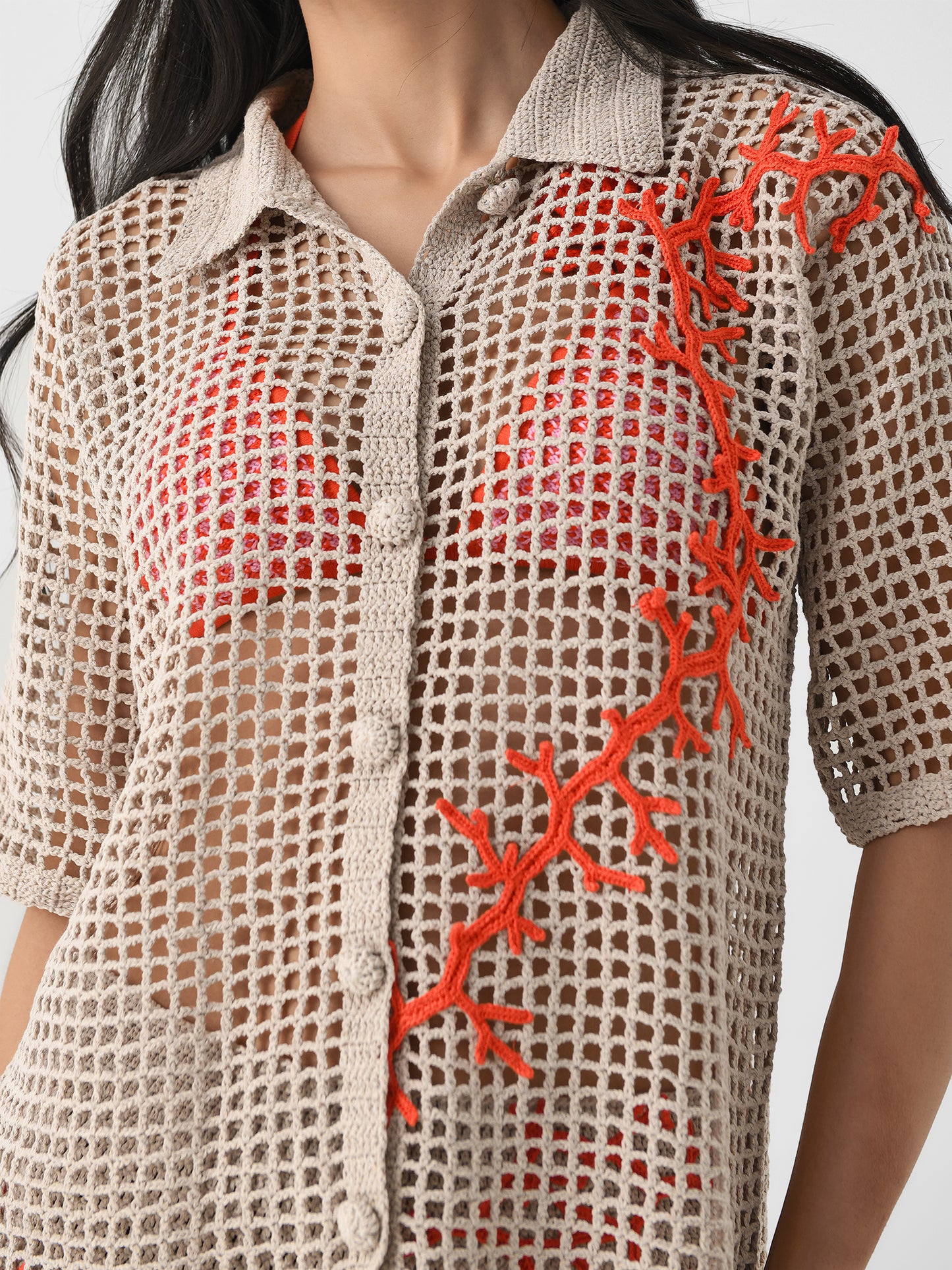 This stunning piece is handmade with intricate open-knit crochet and adorned with delicate coral embroidery, capturing the beauty of the ocean.