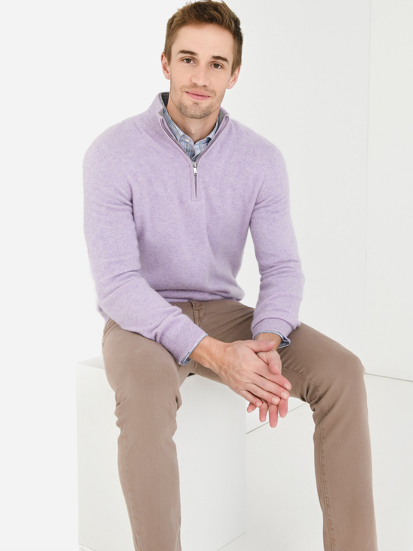 A sumptuous cashmere pullover with an interior contrast collar and quarter-zip closure.