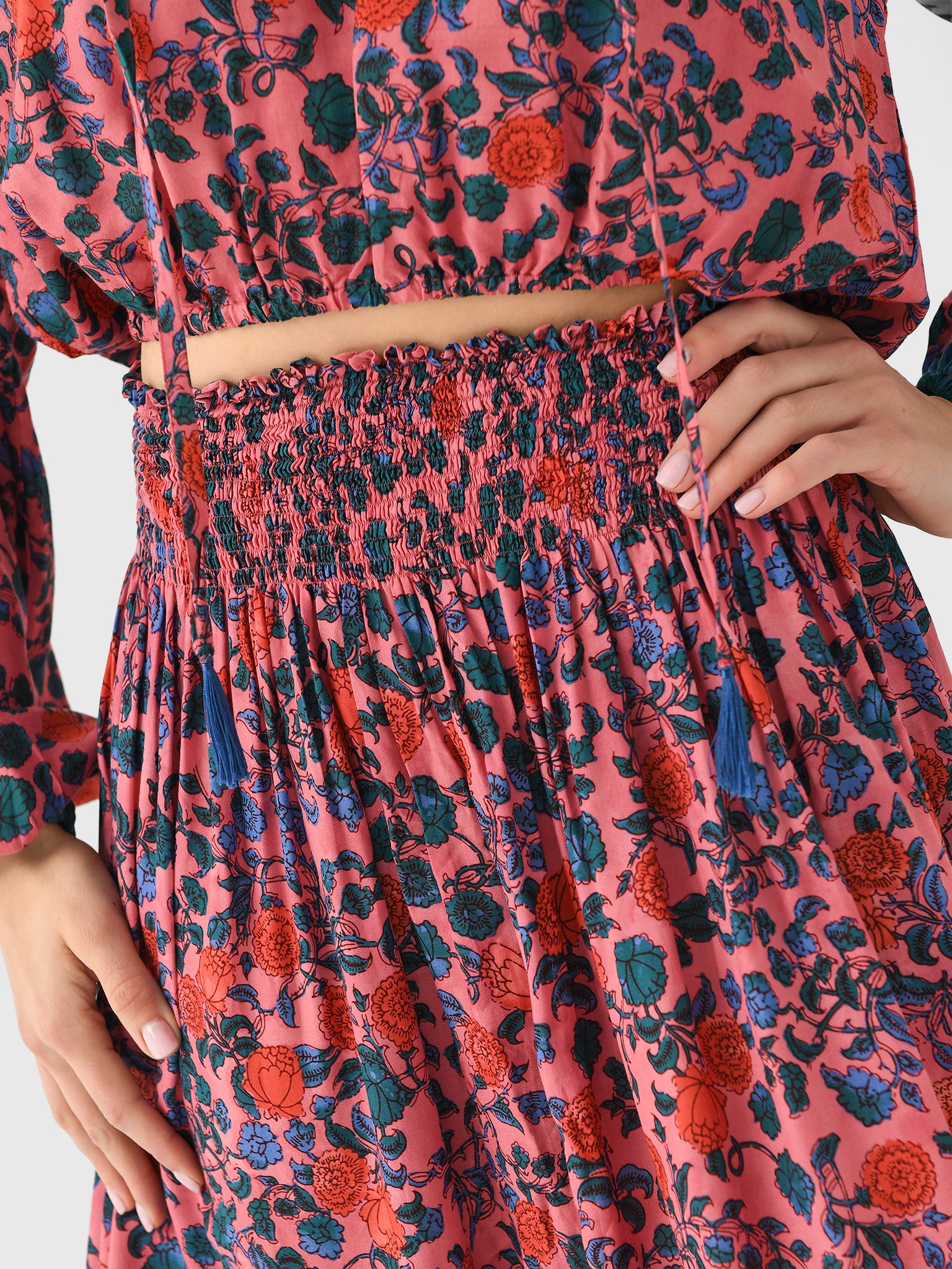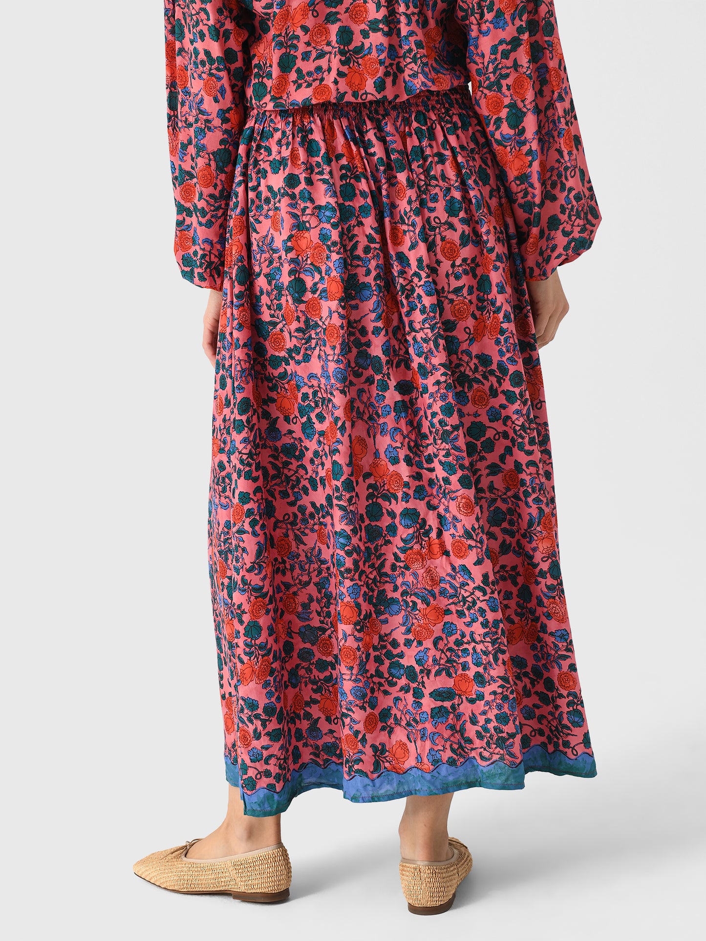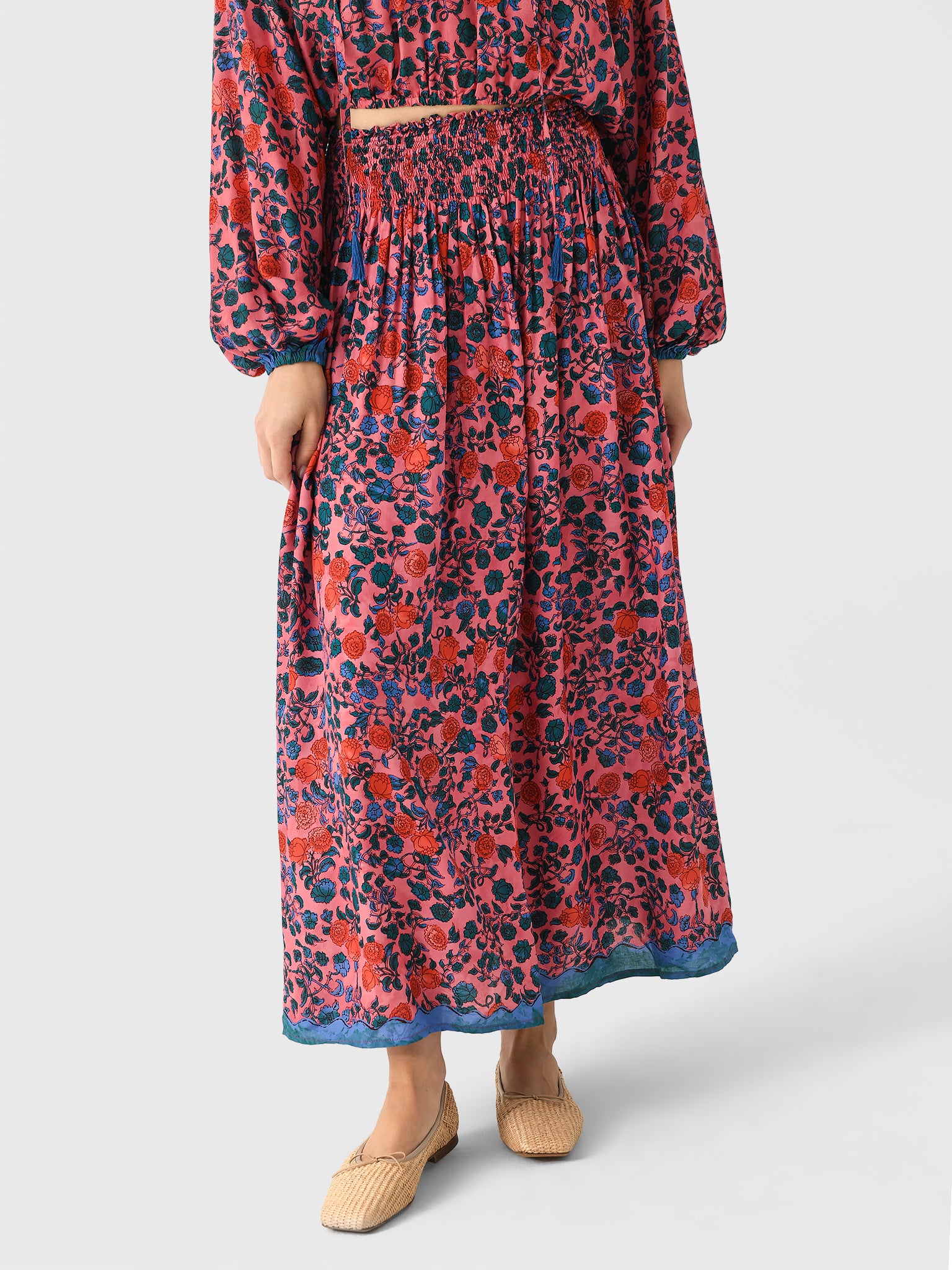 A long and flowy maxi skirt made from soft rayon with a wide smocked waistband.