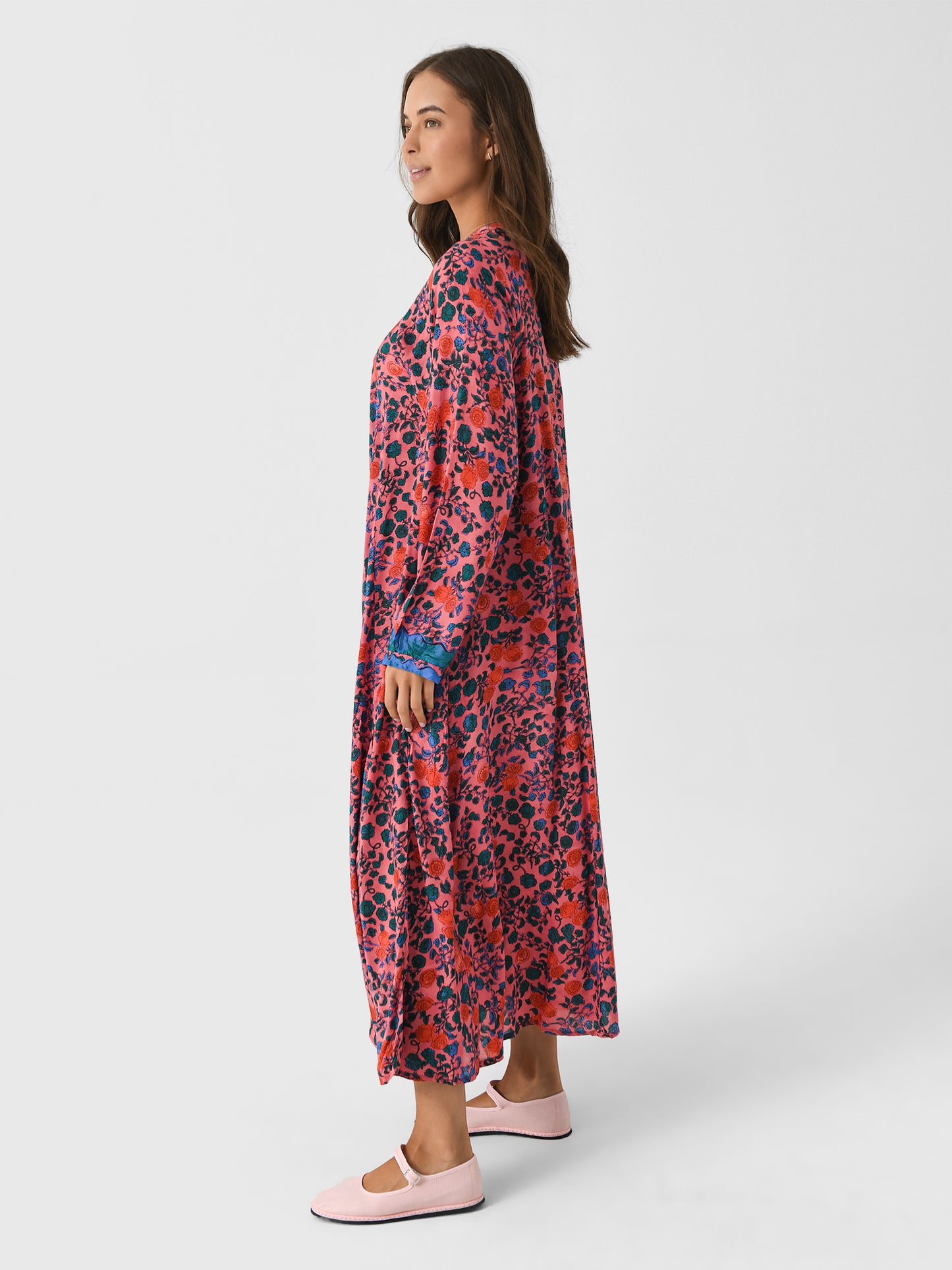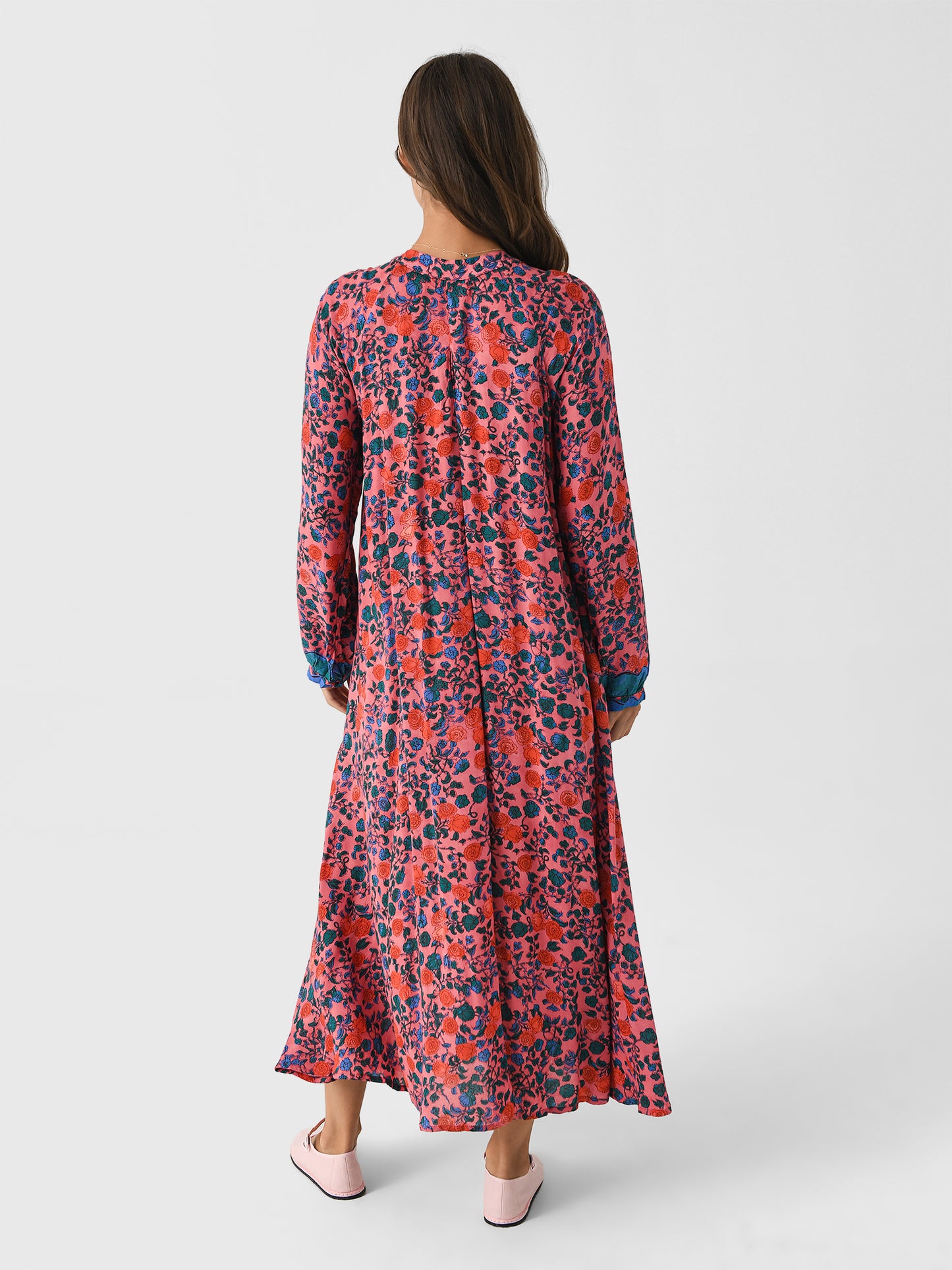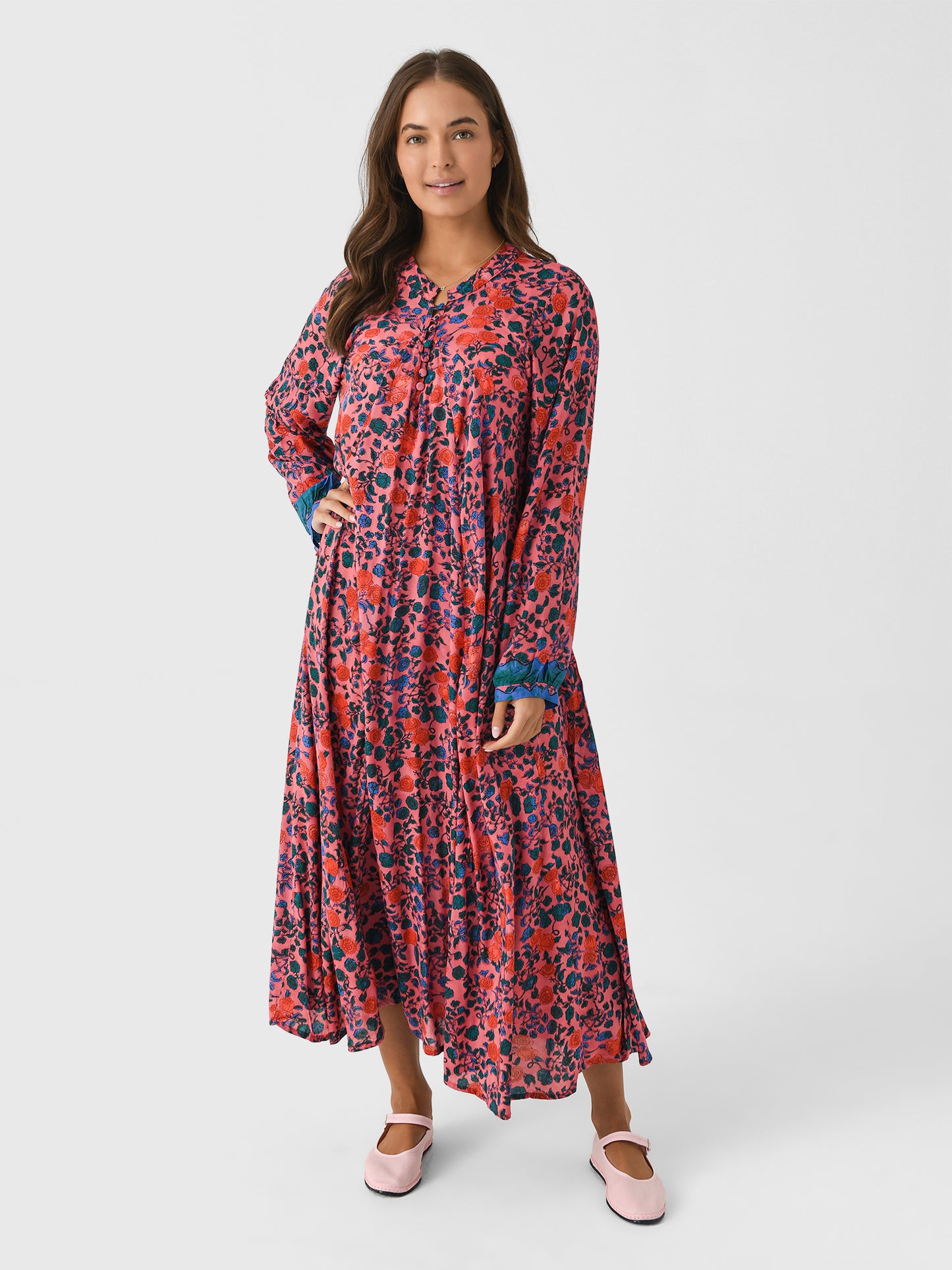 Elegantly designed, this maxi dress features an A-line silhouette, a covered button placket, and voluminous sleeves.