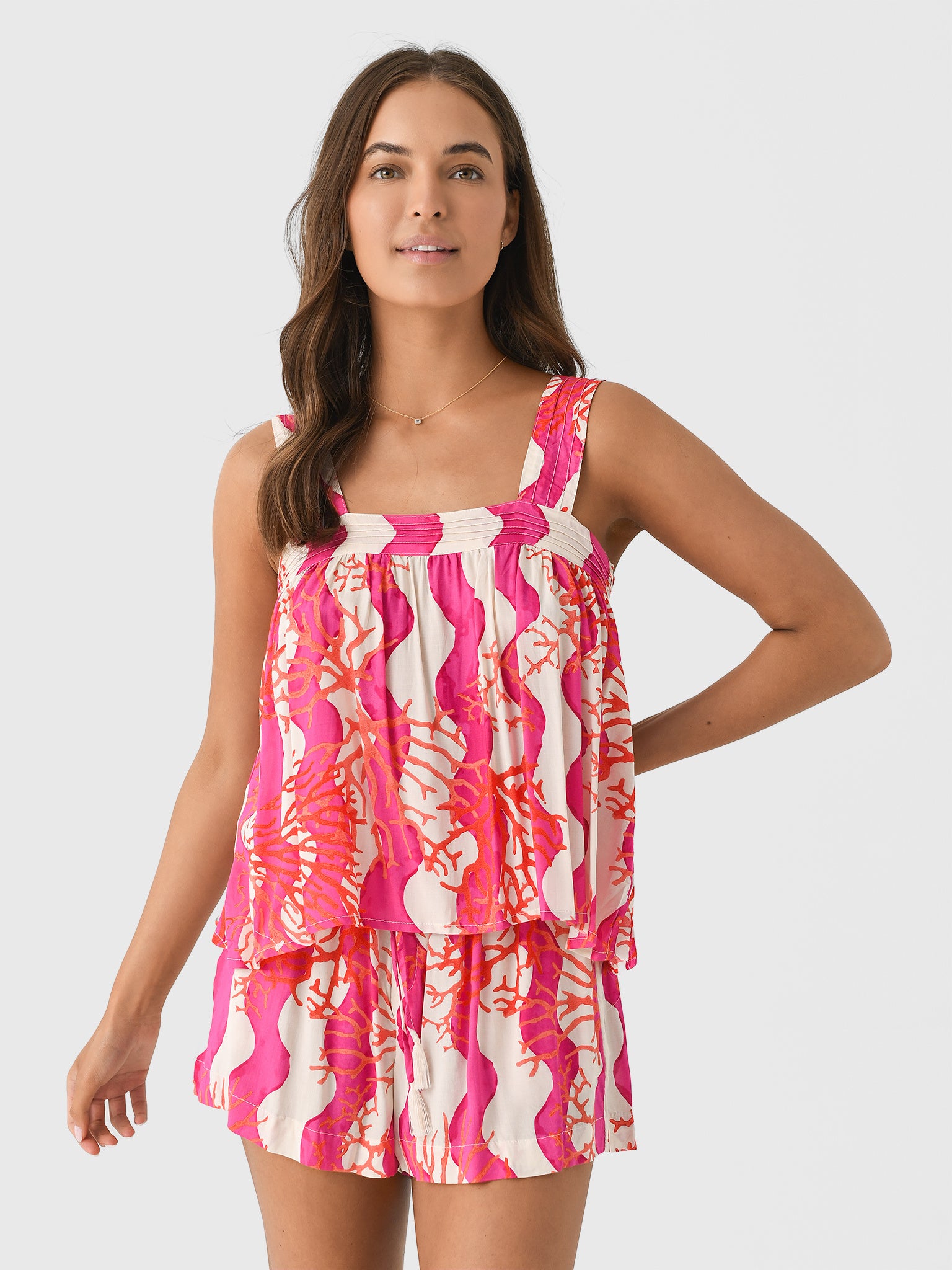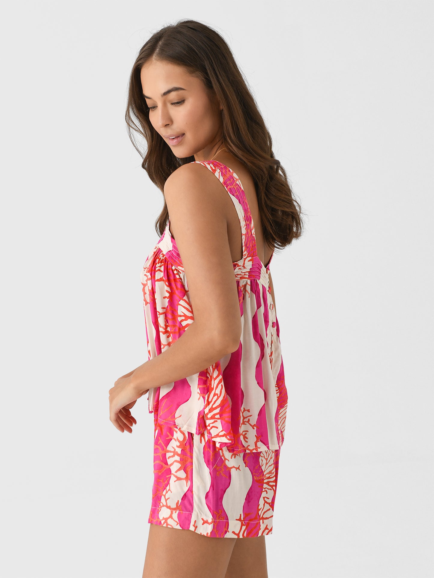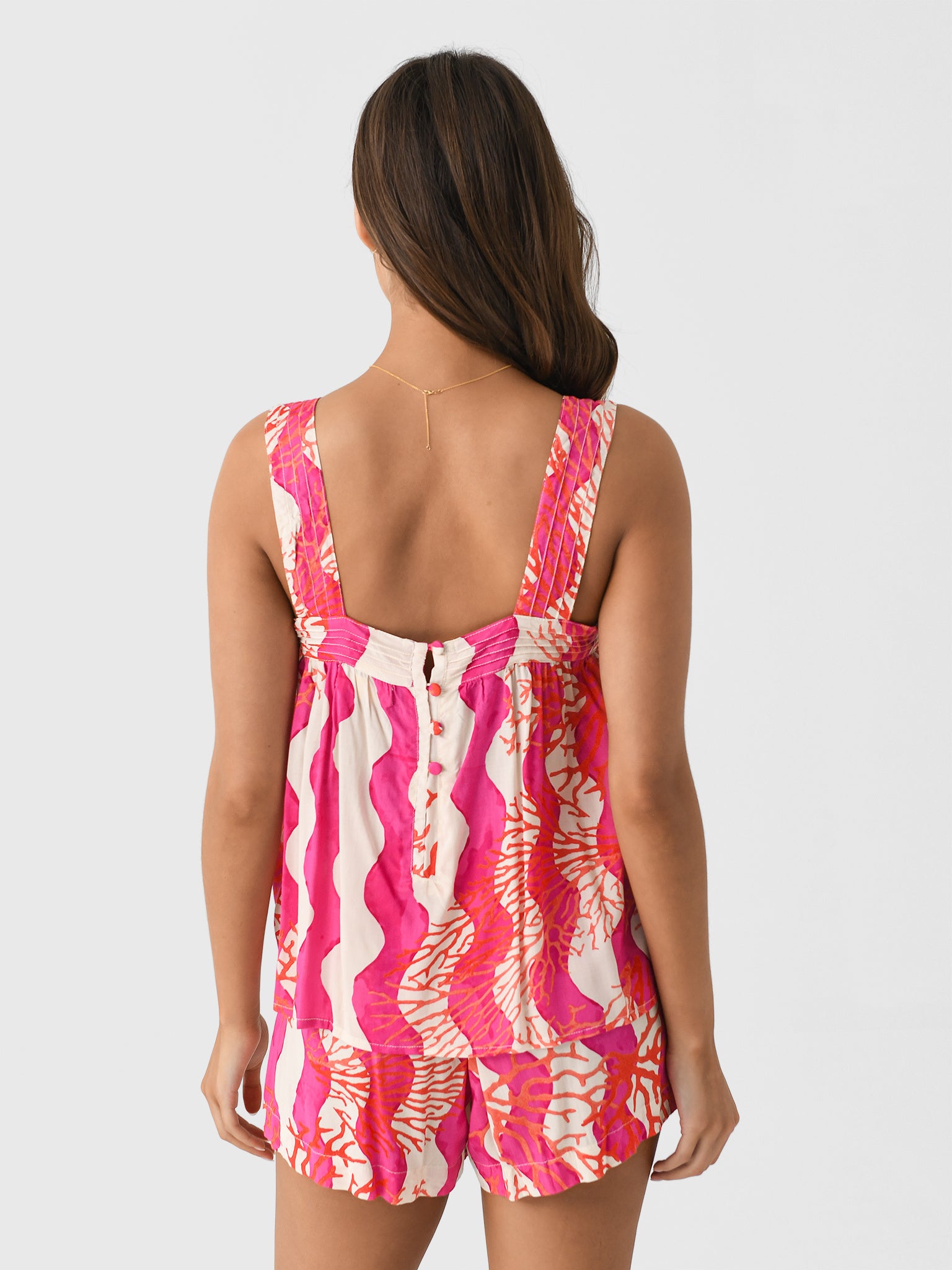 A sleeveless top made from soft rayon with wide straps and a custom wavy coral print.