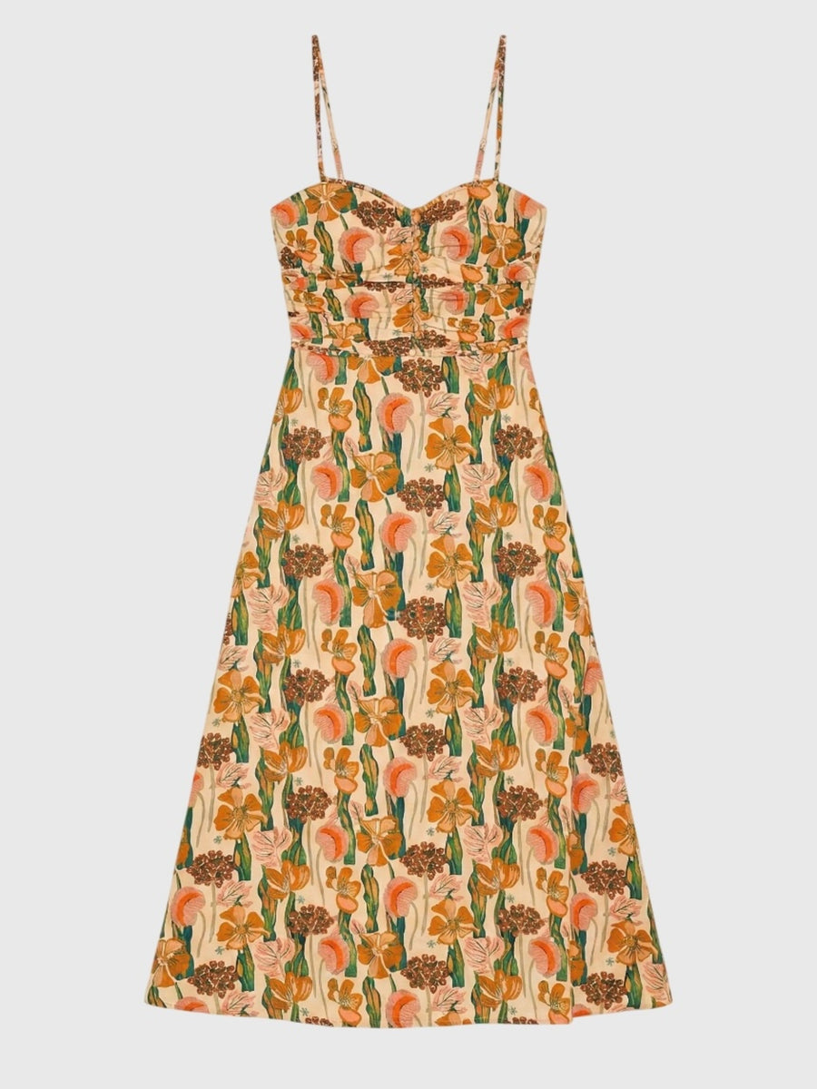 Sweetheart Neckline Thin, Adjustable Straps Side Zip Closure Ruched Bodice A-Line Skirt Midi Silhouette All-Over Novelty Print Lightweight Fabrication Classic Fit