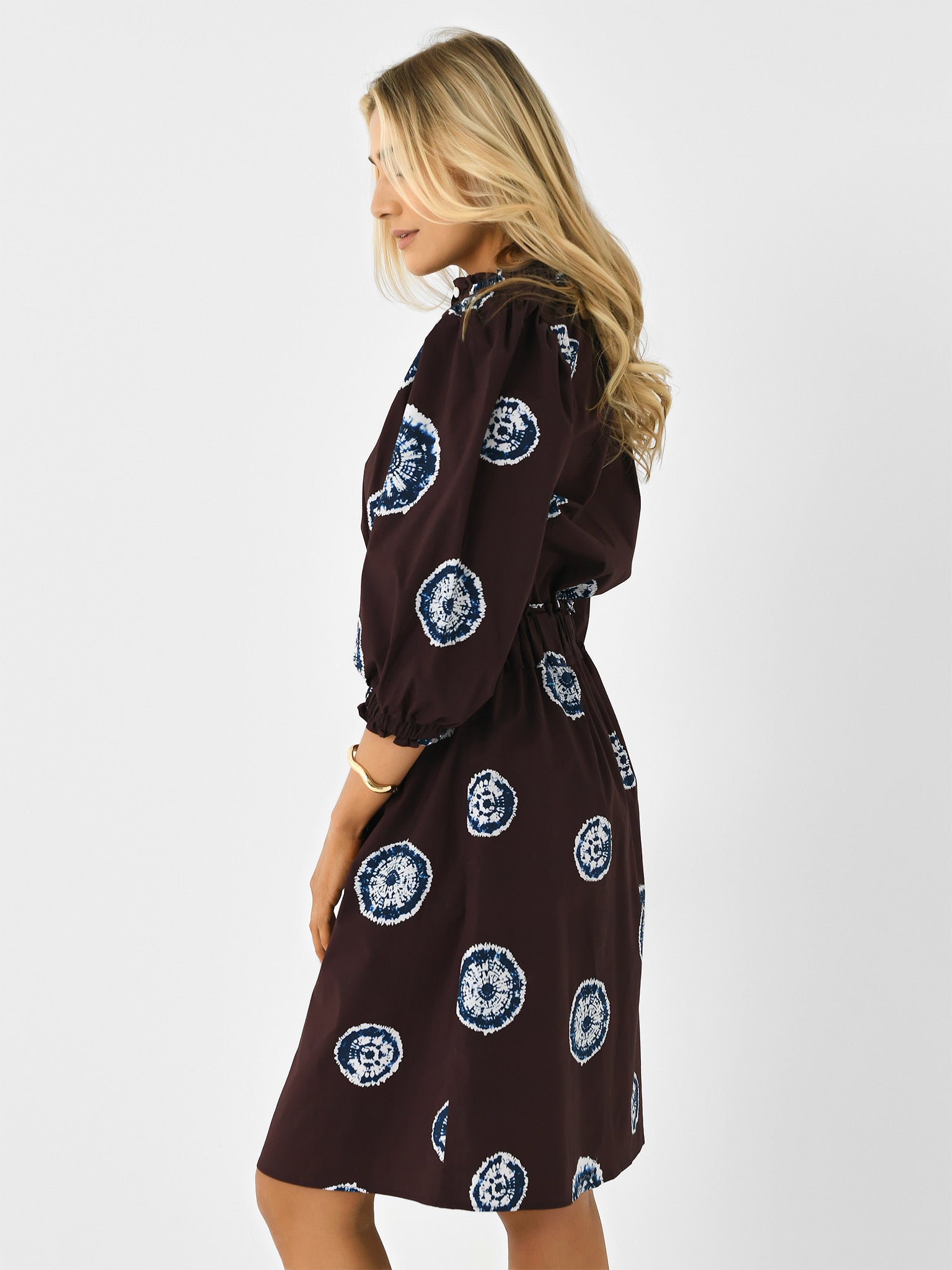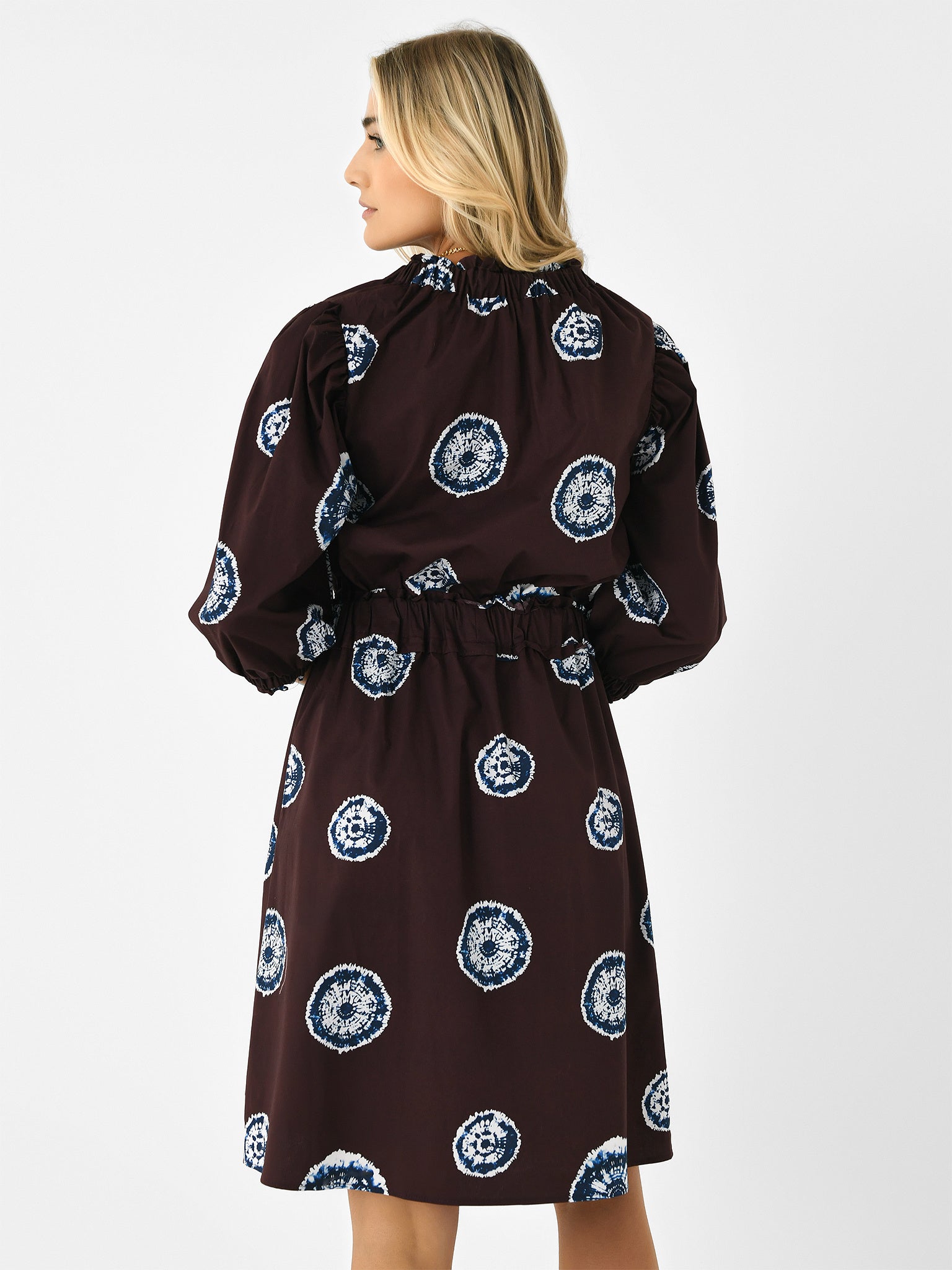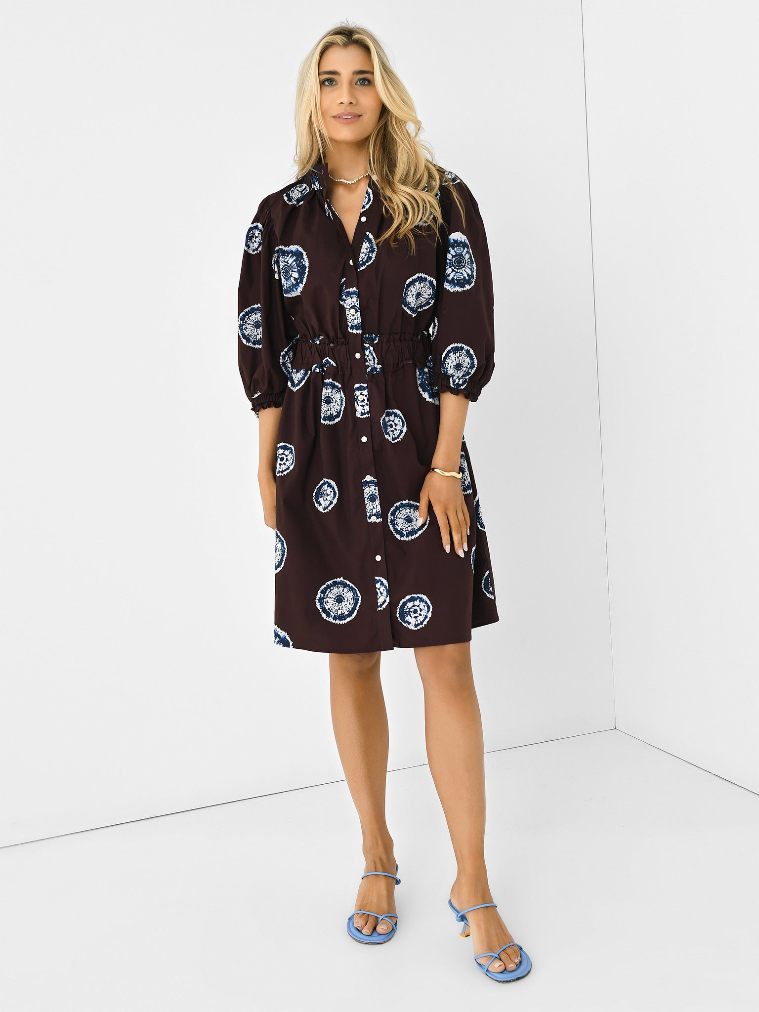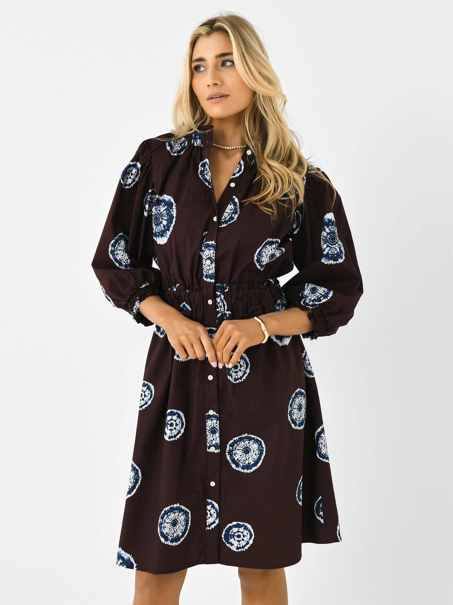 A mid-length button-down dress with puff sleeves, a cinched waist, and a flared skirt.