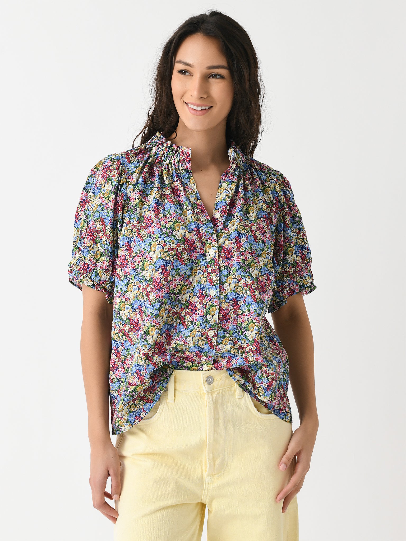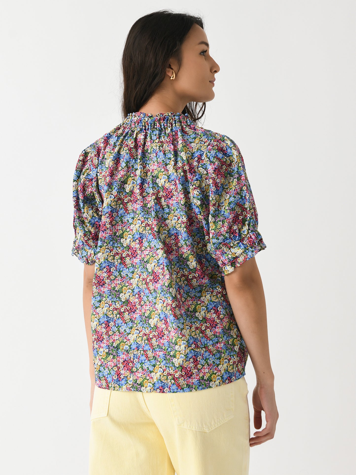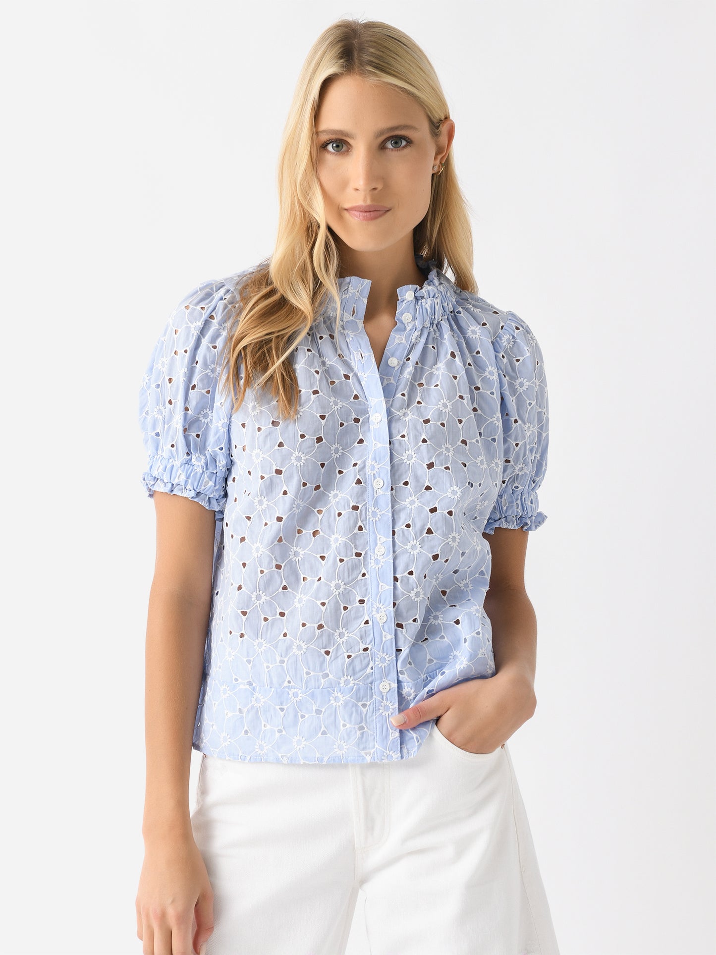 Lightweight top with ruffle-trimmed elastic neckline and cuffs.