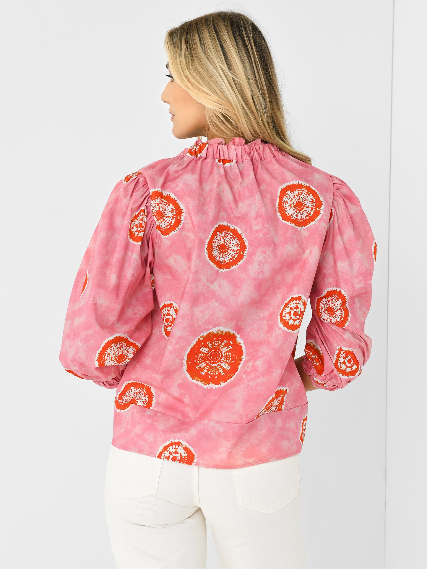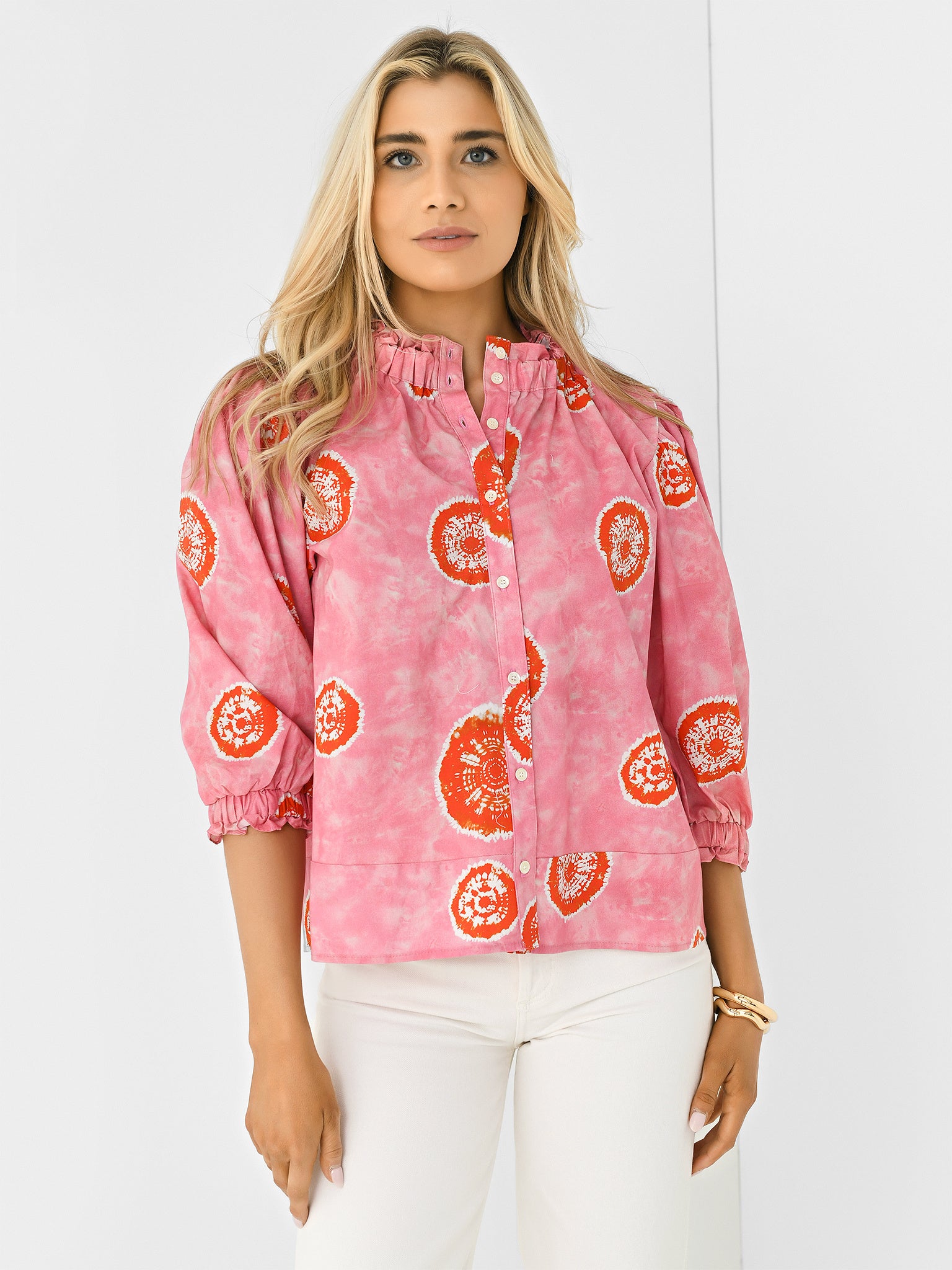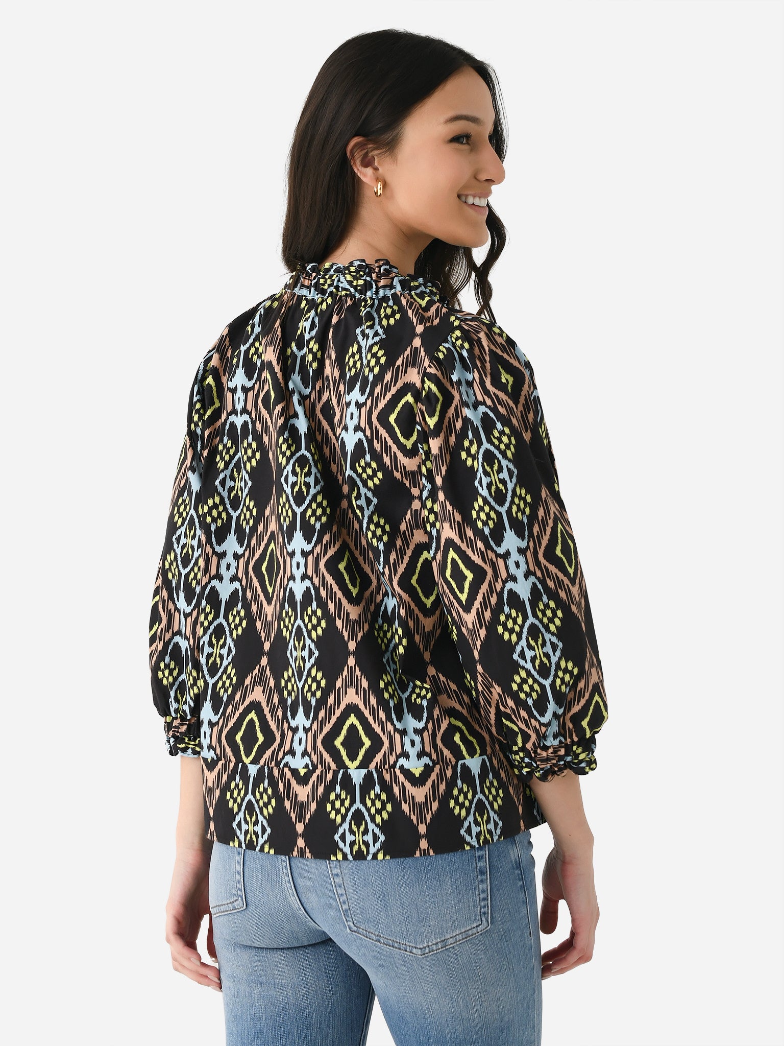 Lightweight top with ruffle-trimmed elastic neckline and cuffs.