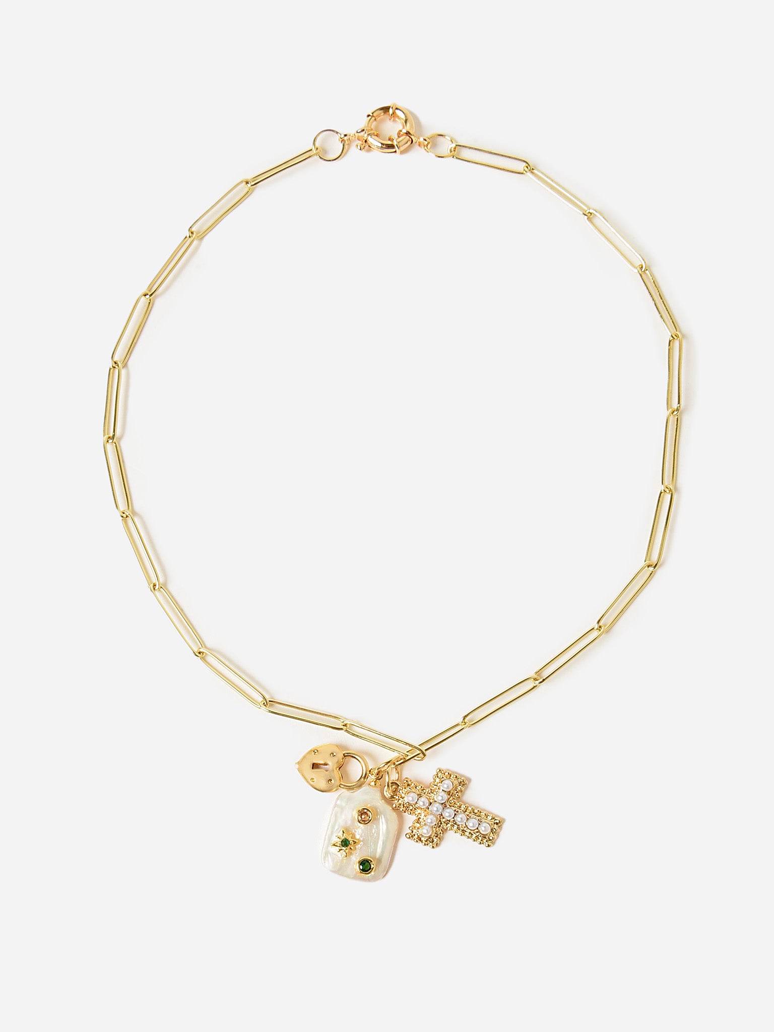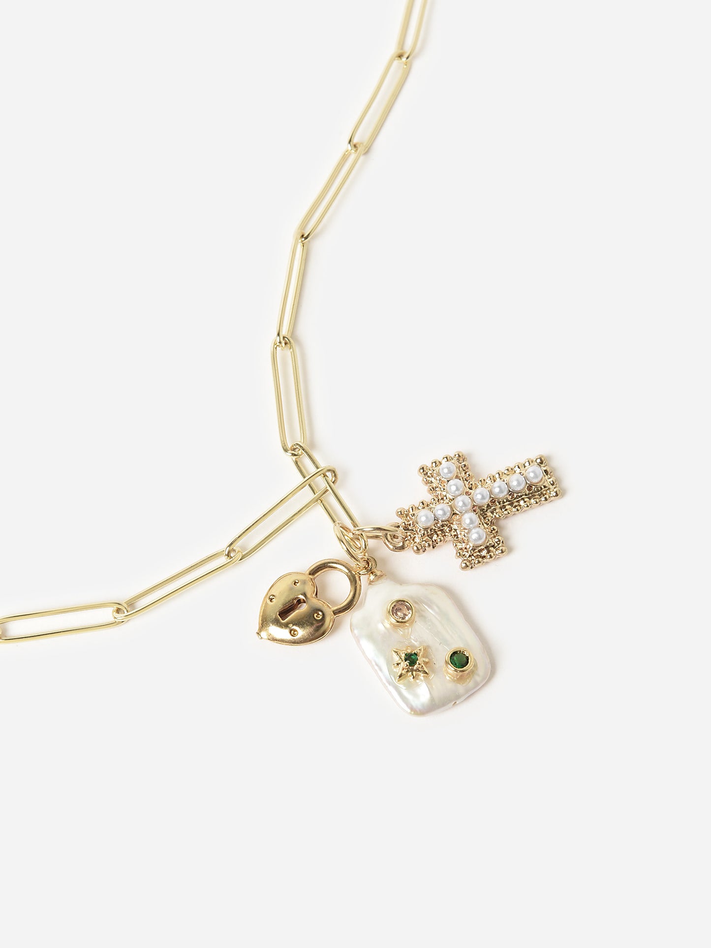 A gold-plated paperclip chain necklace featuring three dainty assorted charms.