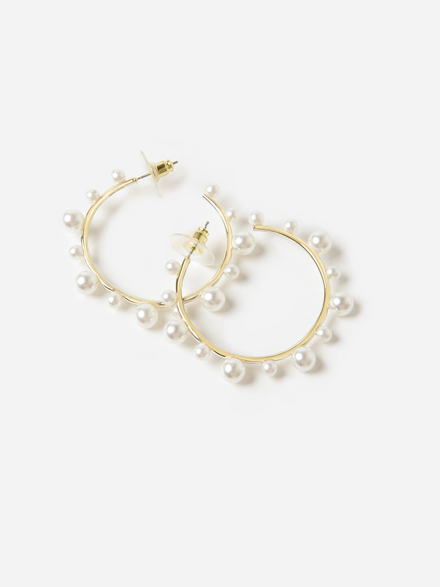 A pair of petite gold-plated hoop earrings with faux pearl embellishments.