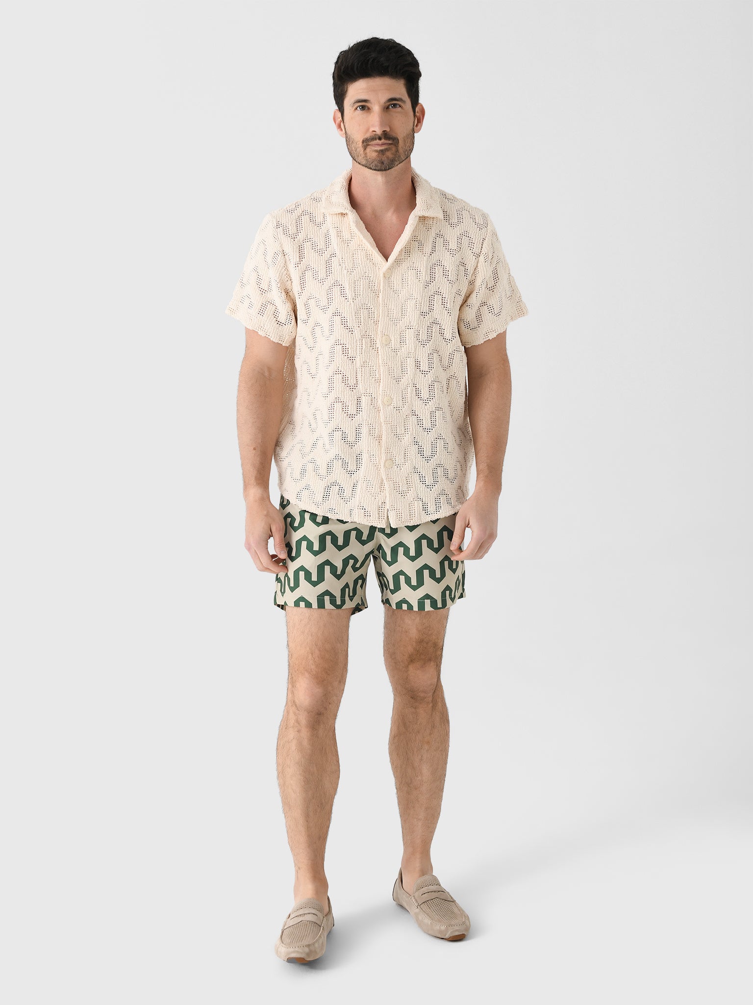 This shirt is crafted from a unique heavyweight woven cotton crochet fabric, creating a captivating texture and pattern of geometric waves. The resort collar and button-down closure add a touch of laid-back flair.
