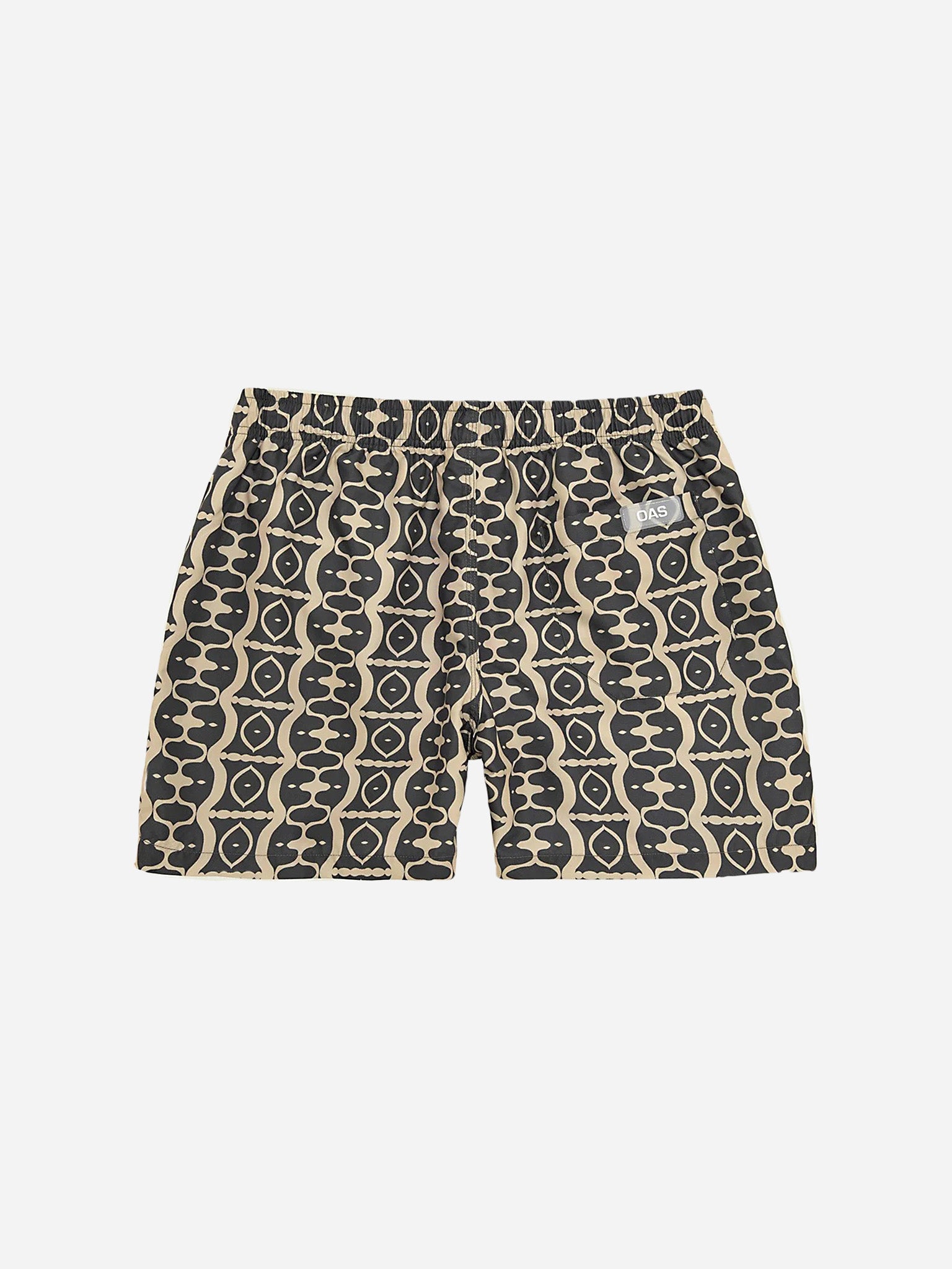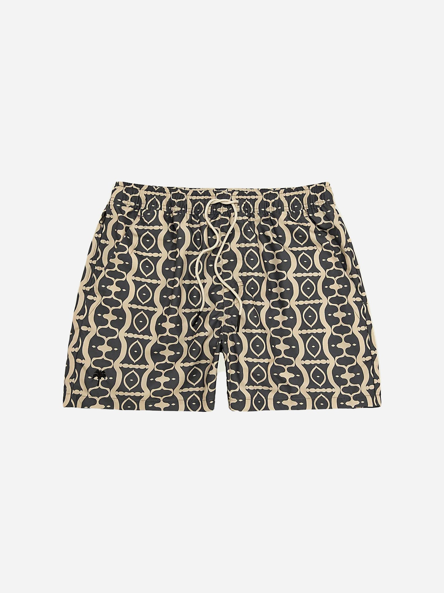 A novelty-printed swim trunk made from brushed, quick-drying fabric.