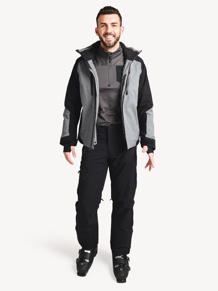 - Model is Wearing Size Medium Obermeyer Men's Rex Down Hybrid Jacket, Size Medium Obermeyer Baselayer and Size Medium Obermeyer Force Ski Pants