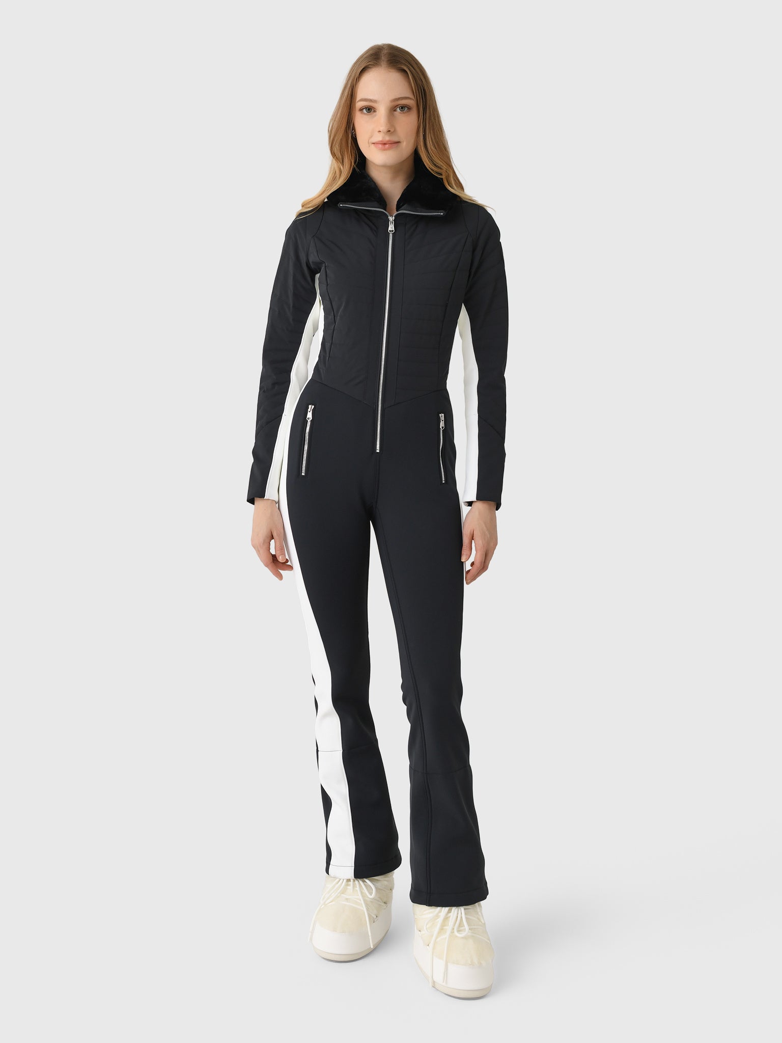 Down-filled ski suit with a streamlined, slim silhouette. The Obermeyer Katze Suit is the elegant all-in-one solution for performance and comfort on the slopes in true high fashion. Full-Motion™ articulation and 4-way stretch fabric make the Katze suit an agile piece of skiwear, built to perform while providing a dynamic range of motion.