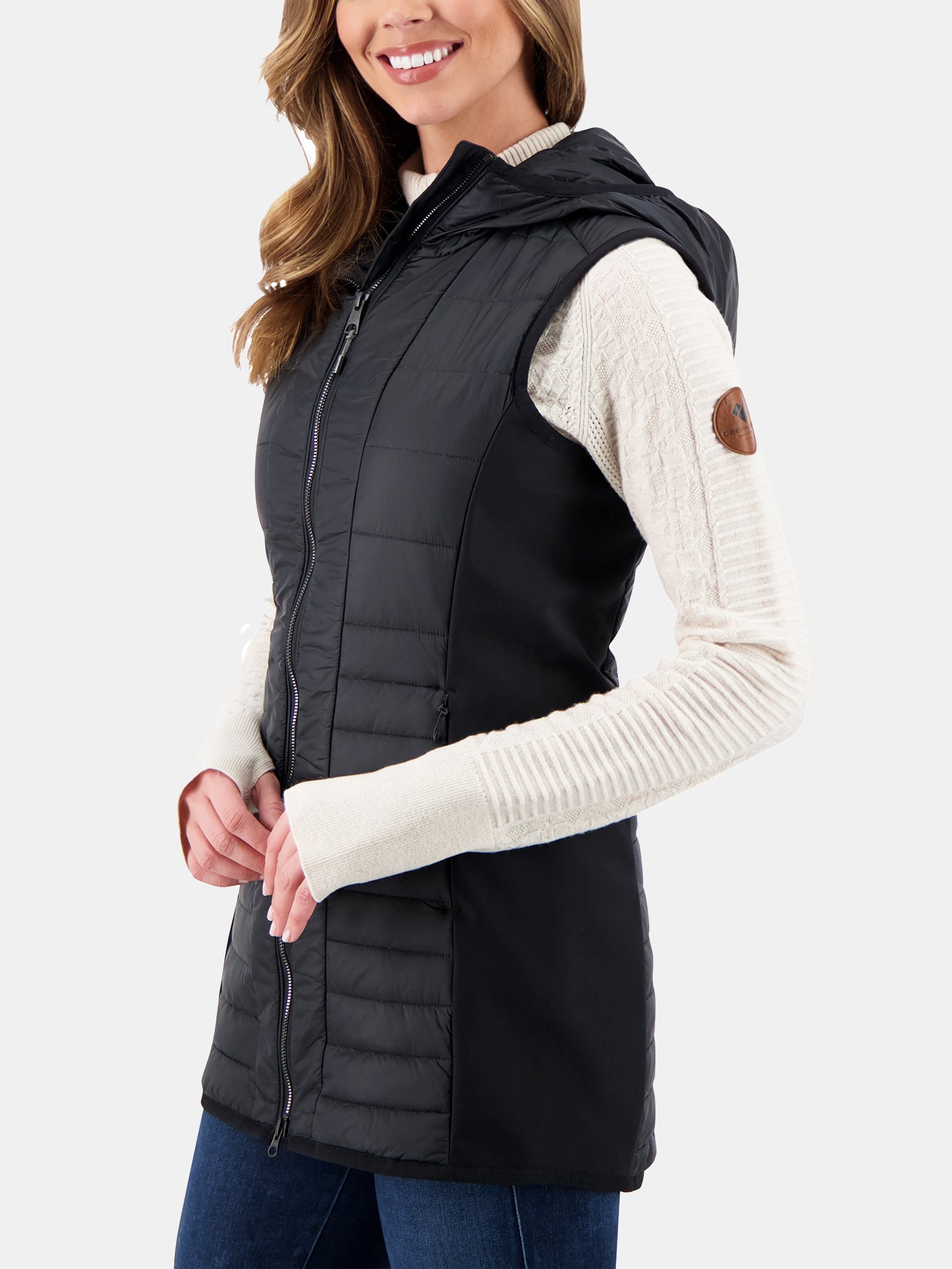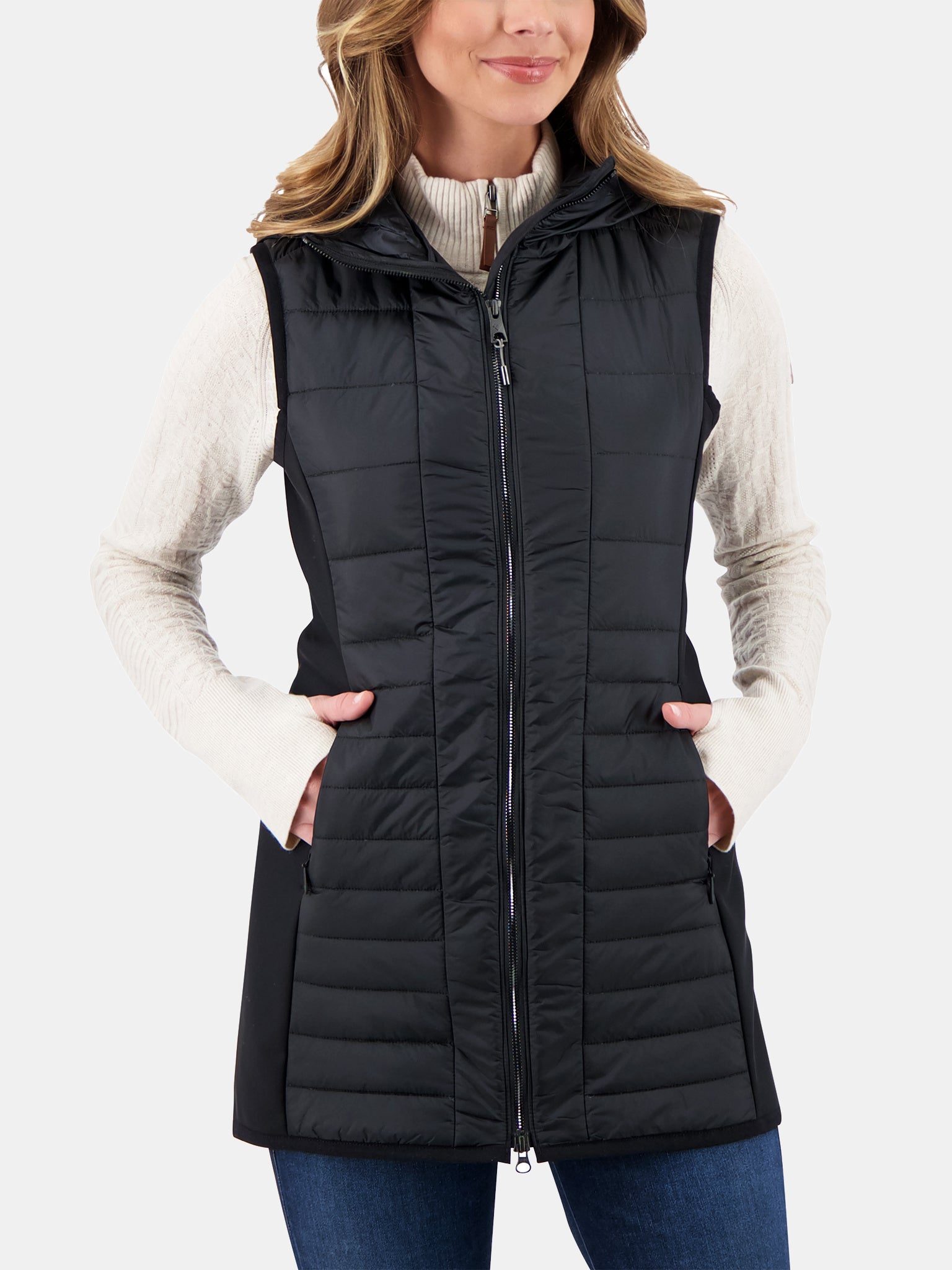 The Obermeyer Miriam Hybrid Vest is a fashionable vest which is elegant and suitable for any occasion. A daring and longer silhouette and flattering shape, the Miriam has an integrated hood and 4-way stretch to enhance its look and fit.