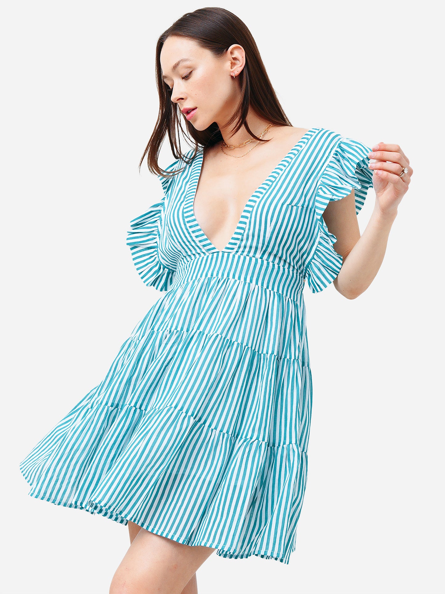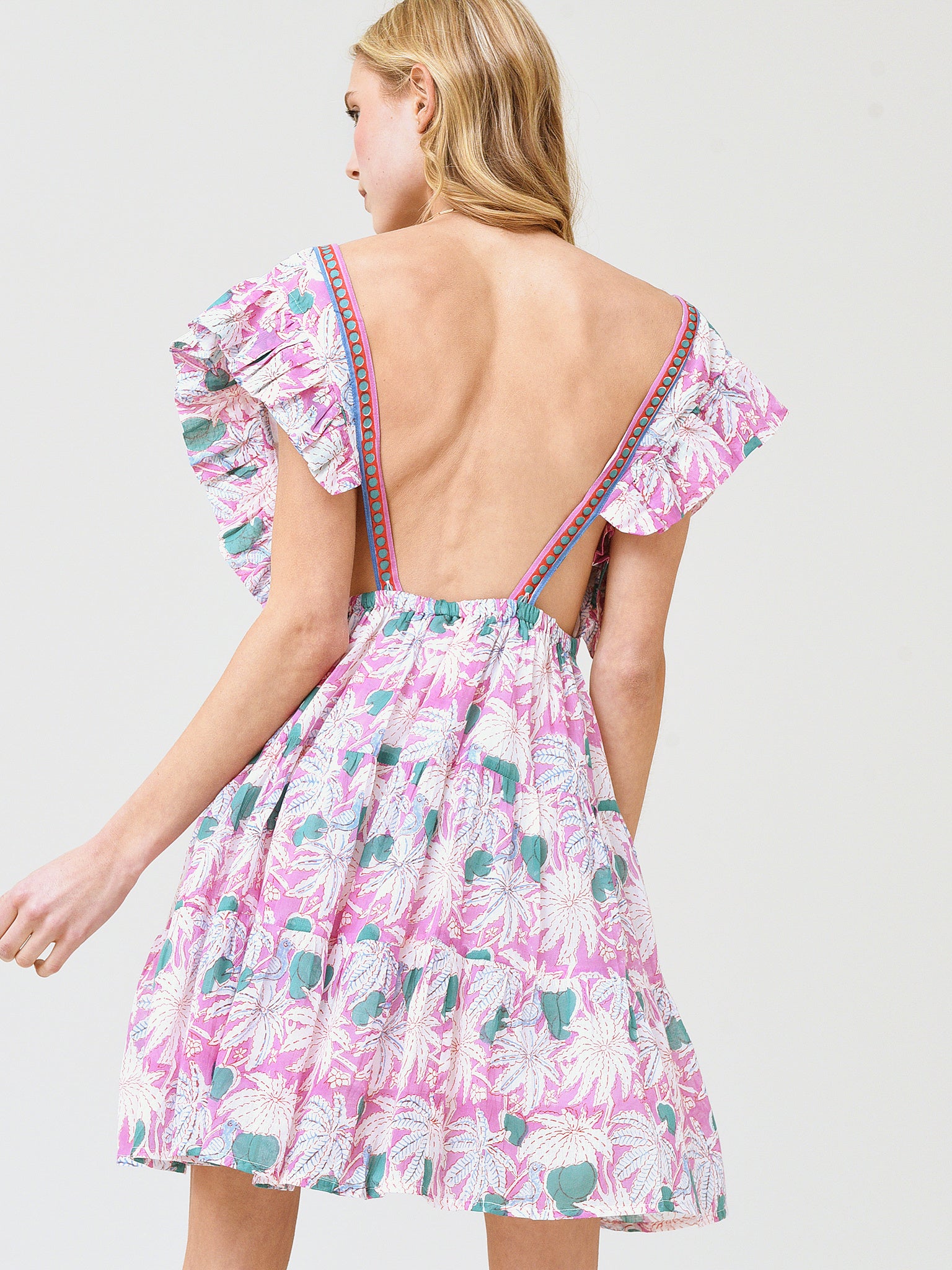 Printed mini dress with a ruffle flair and cross-back straps.