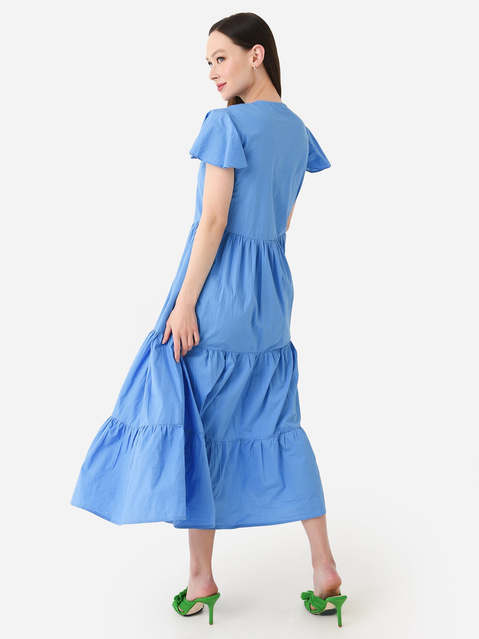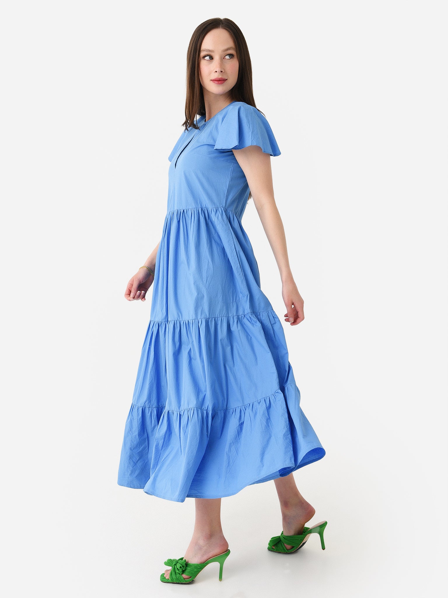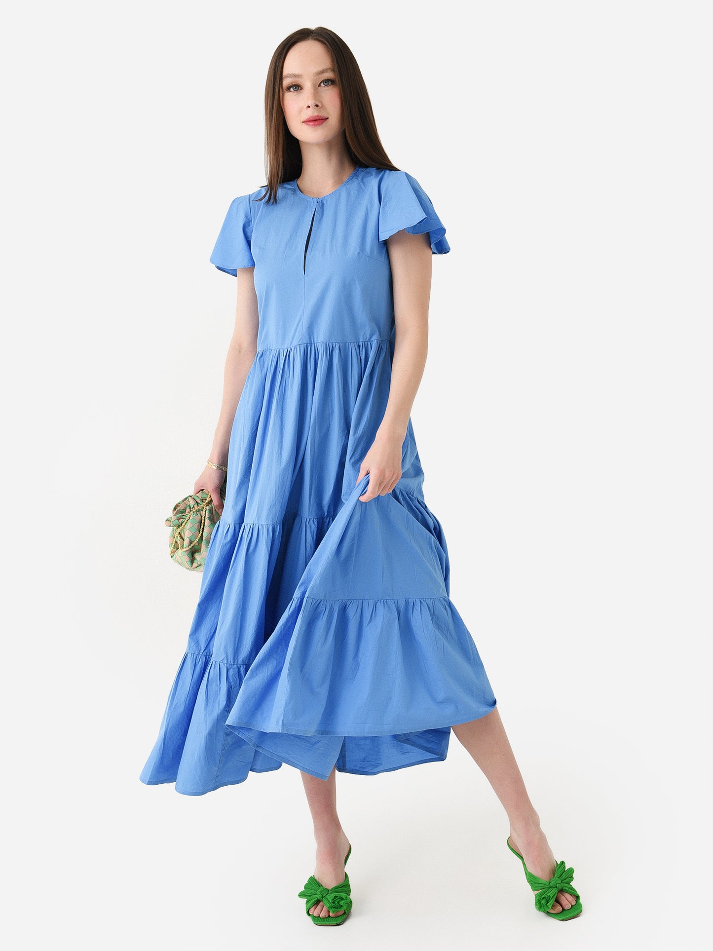 Pullover-style maxi dress with fluttery cap sleeves and a tiered skirt.