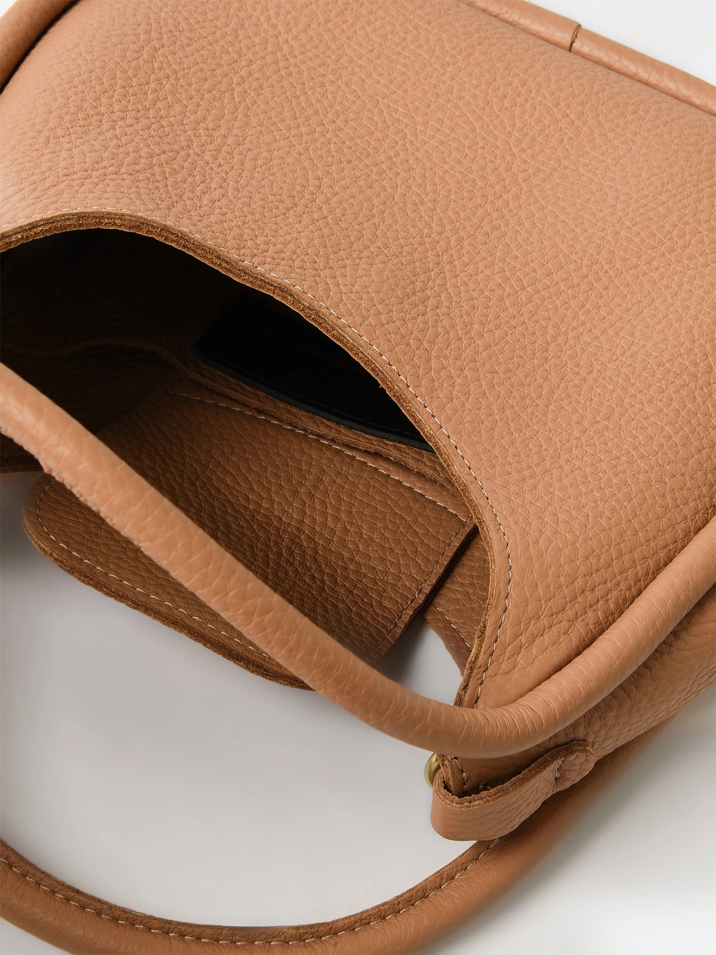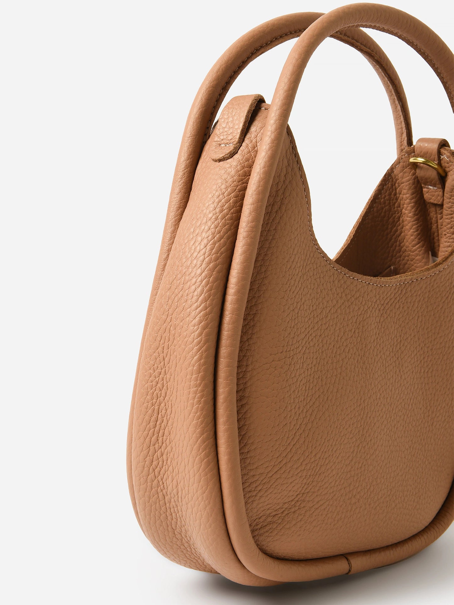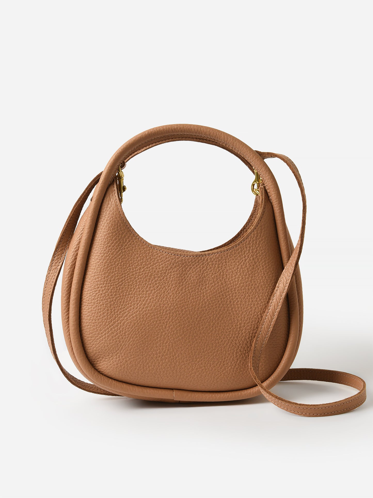 A soft leather handbag featuring top handles and an optional crossbody strap.