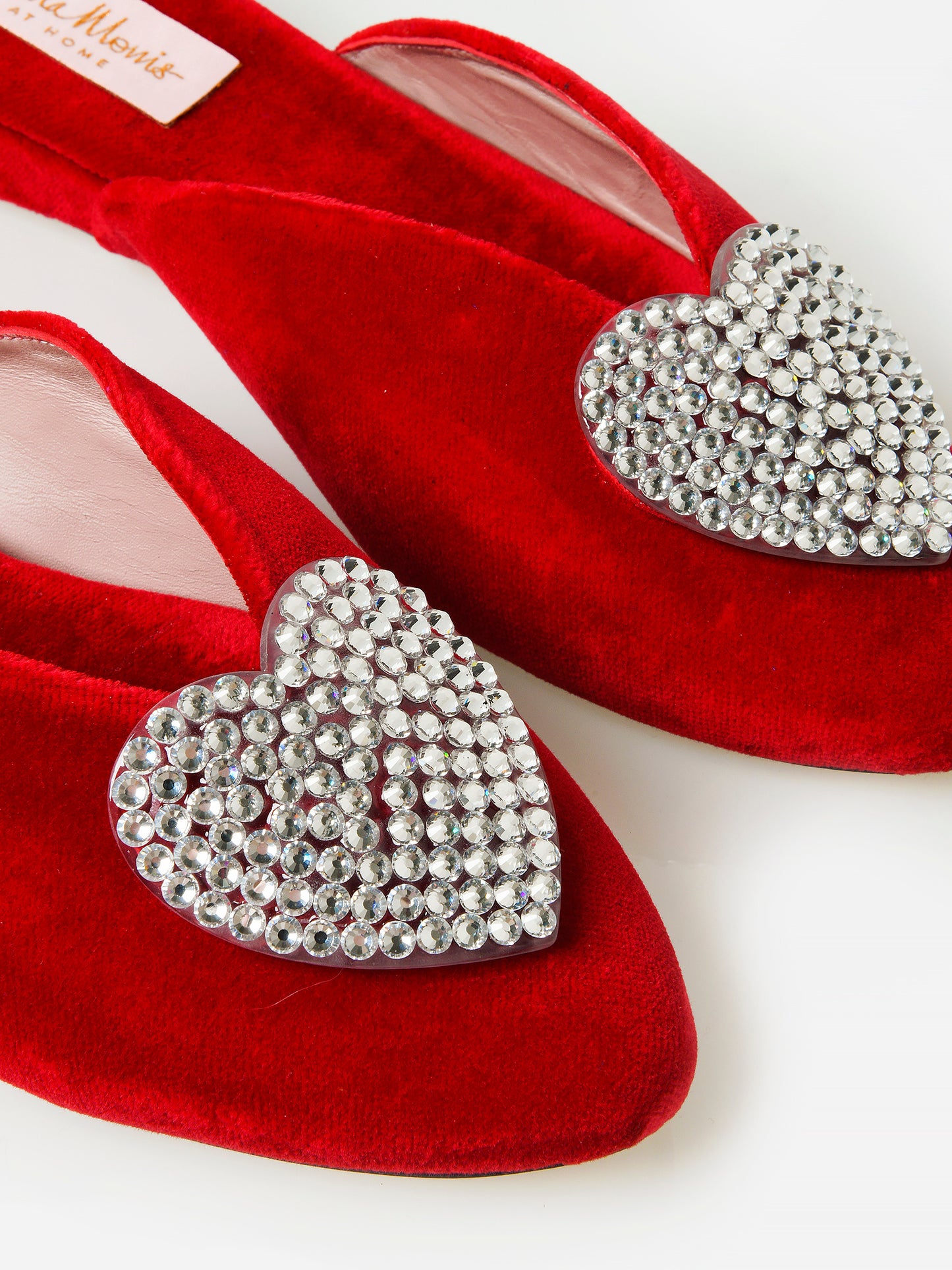 Velvet wedge slipper with a crystal-embellished heart detail and brushed leather sole, also suitable for outdoor wear.