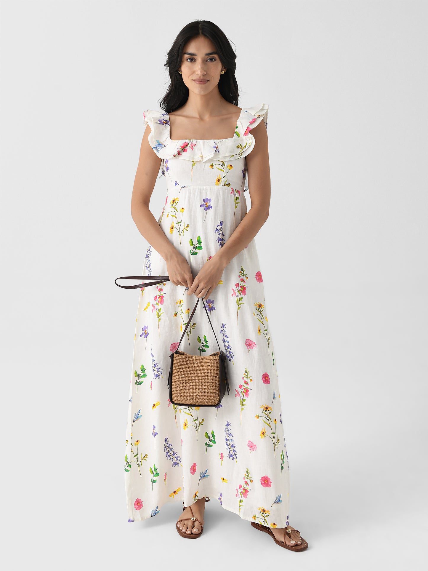 A feminine dress made from premium linen with a signature wildflower print. The dress features a delicate frill neckline and flows gracefully into an A-line skirt.