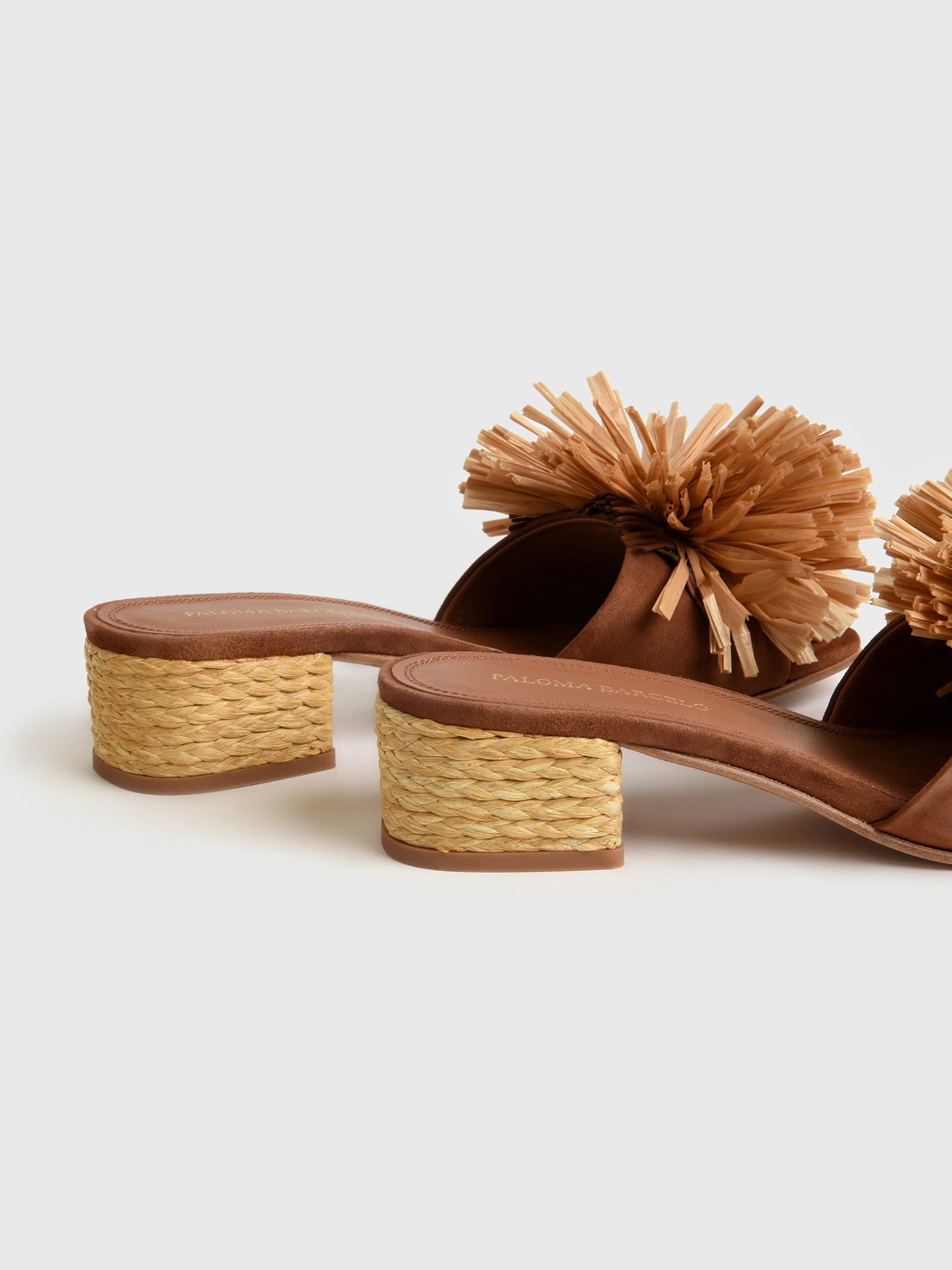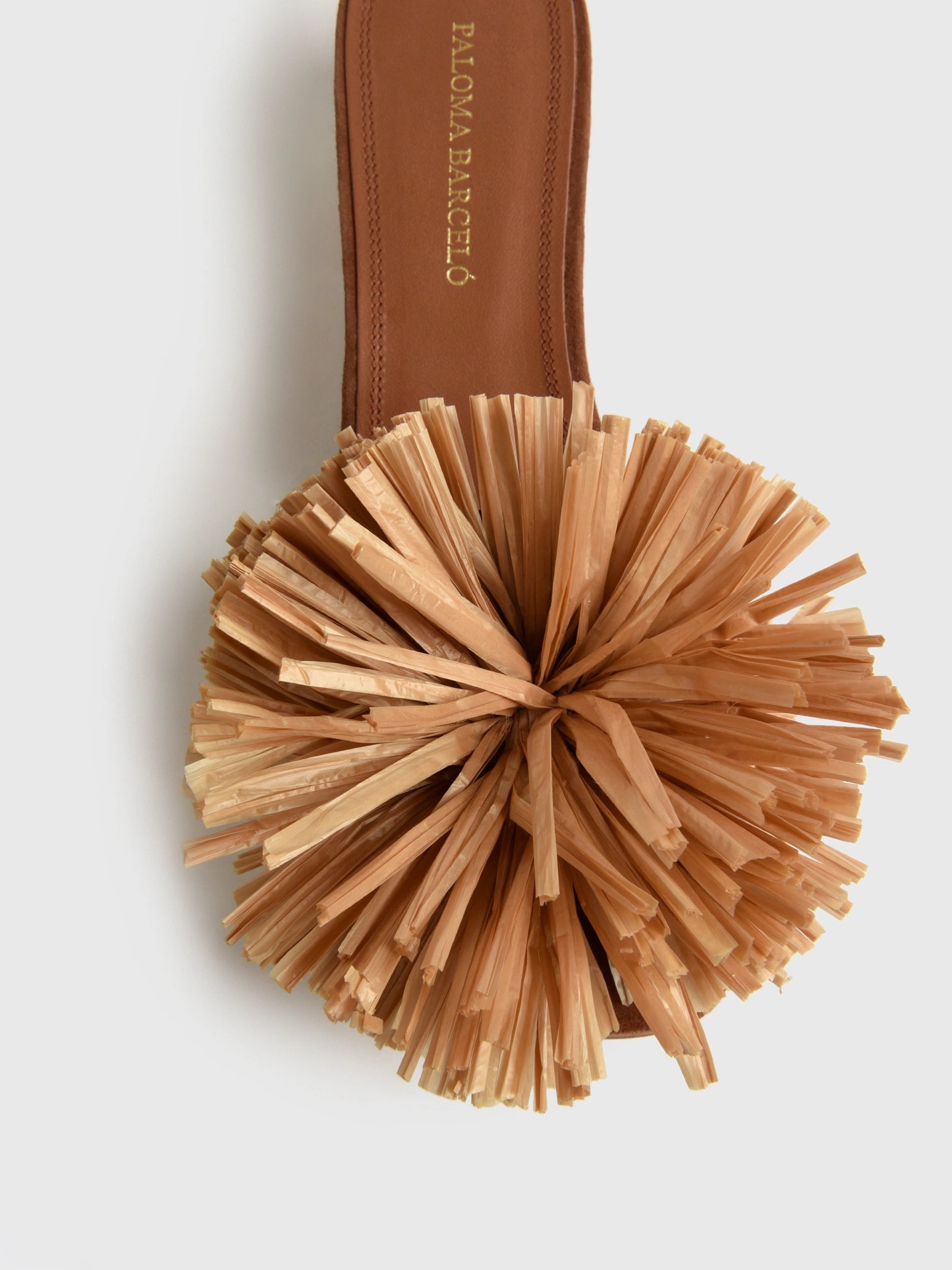 This sandal combines soft leather with the natural, rustic feel of a jute-wrapped heel and a whimsical raffia pom-pom, creating an eye-catching design.