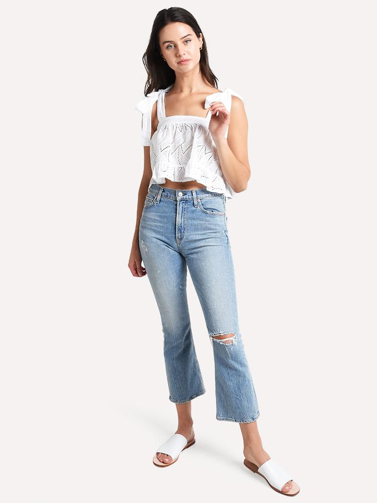 - Styled with Citizens of Humanity jeans style # 1761-850 and James Smith sandals style # OFF DUTY. Model is wearing size 6 top and size 25 jeans.