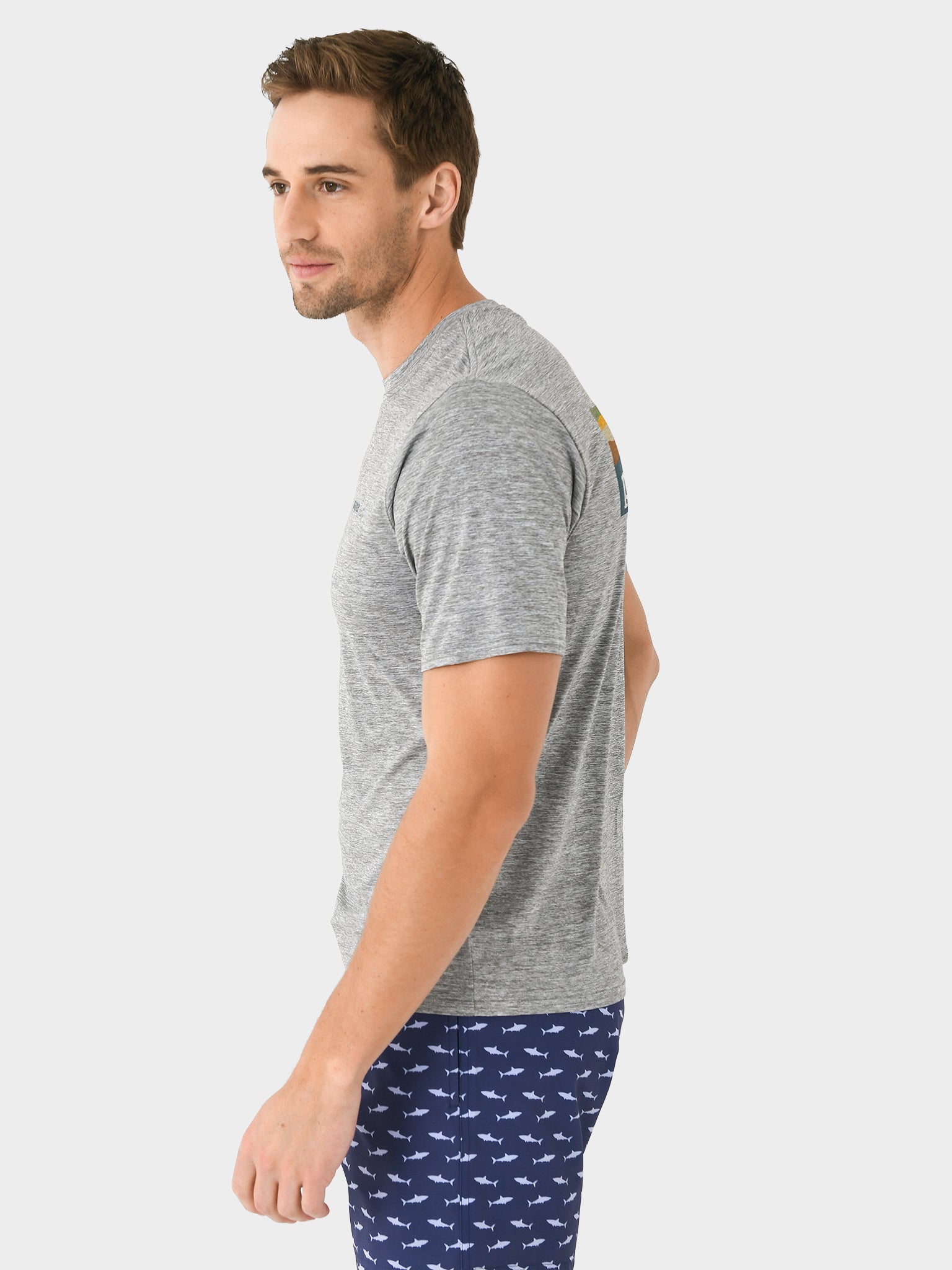 A short-sleeve graphic tee with anti-odor technology and moisture-wicking properties.