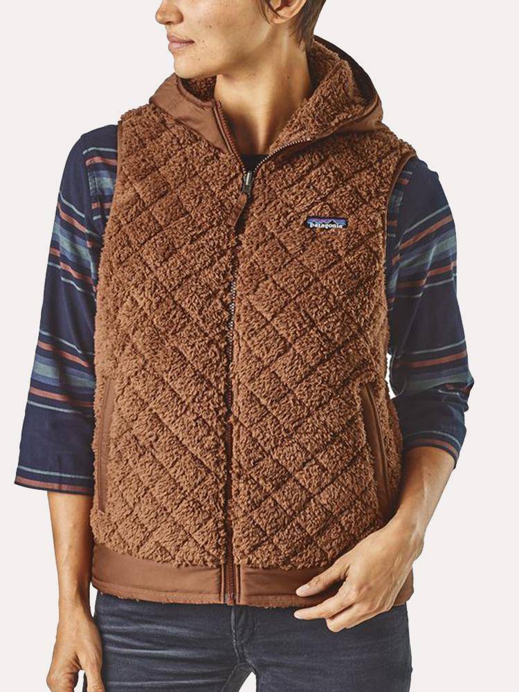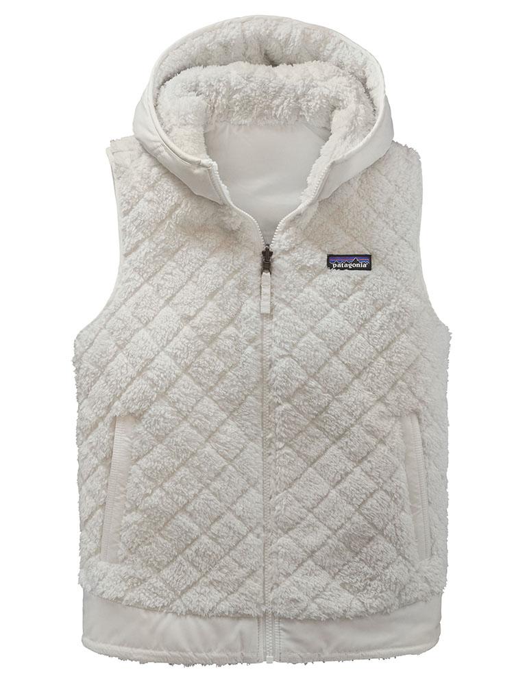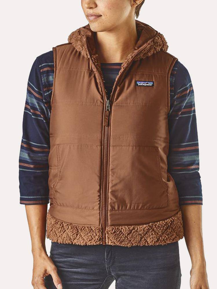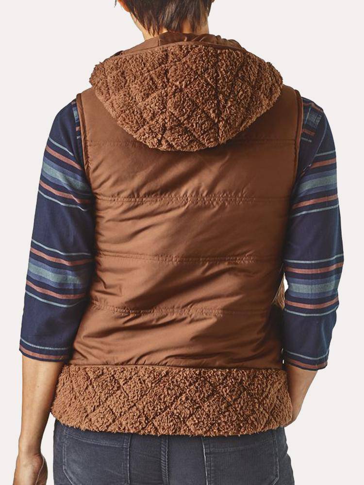 This reversible, hooded vest is made with toasty-warm fleece in a diamond-quilt pattern on one side and a polyester taffeta with a DWR (durable water repellent) finish and horizontal quilting on the other.