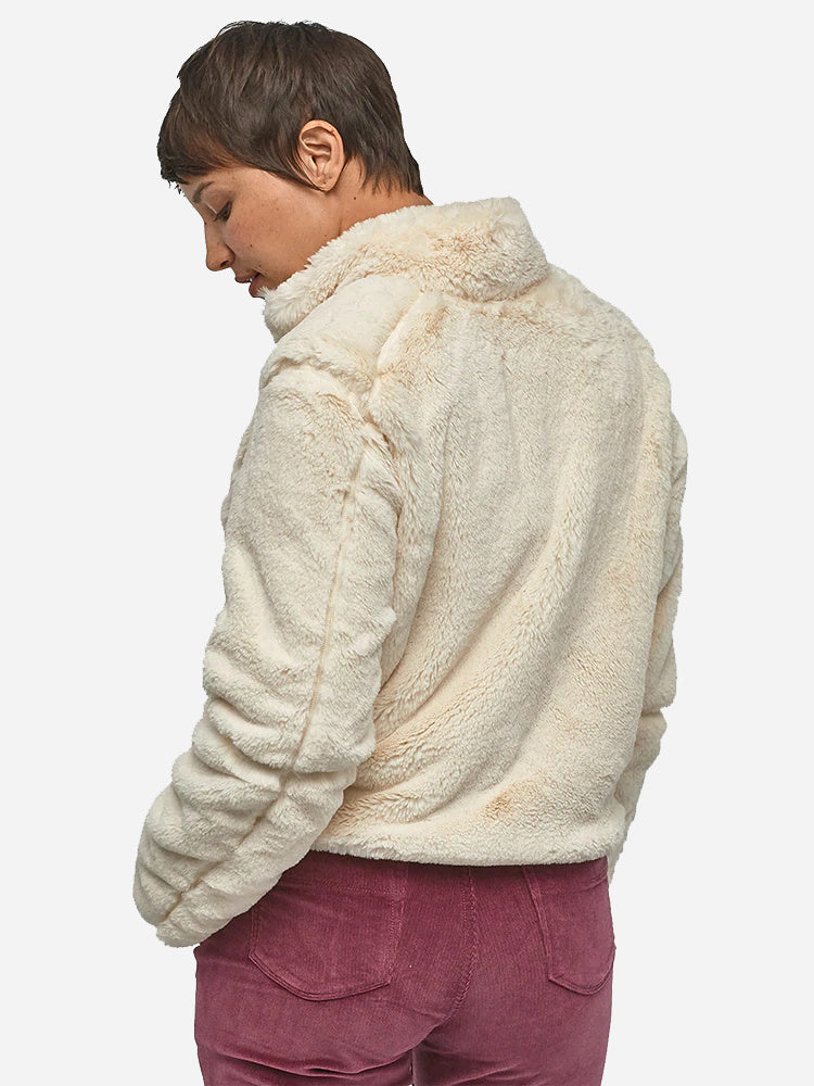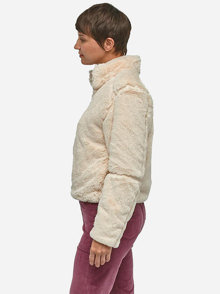 I can’t stop touching this jacket; it’s heavenly. The fit is true to size and slightly cropped for more of a traditional street fashion vs. Patagonia activewear. I am 5’7 with a long torso, and it hits a little below my belly button. Regarding warmth, I’d place it similarly to a Patagonia Down Sweater.