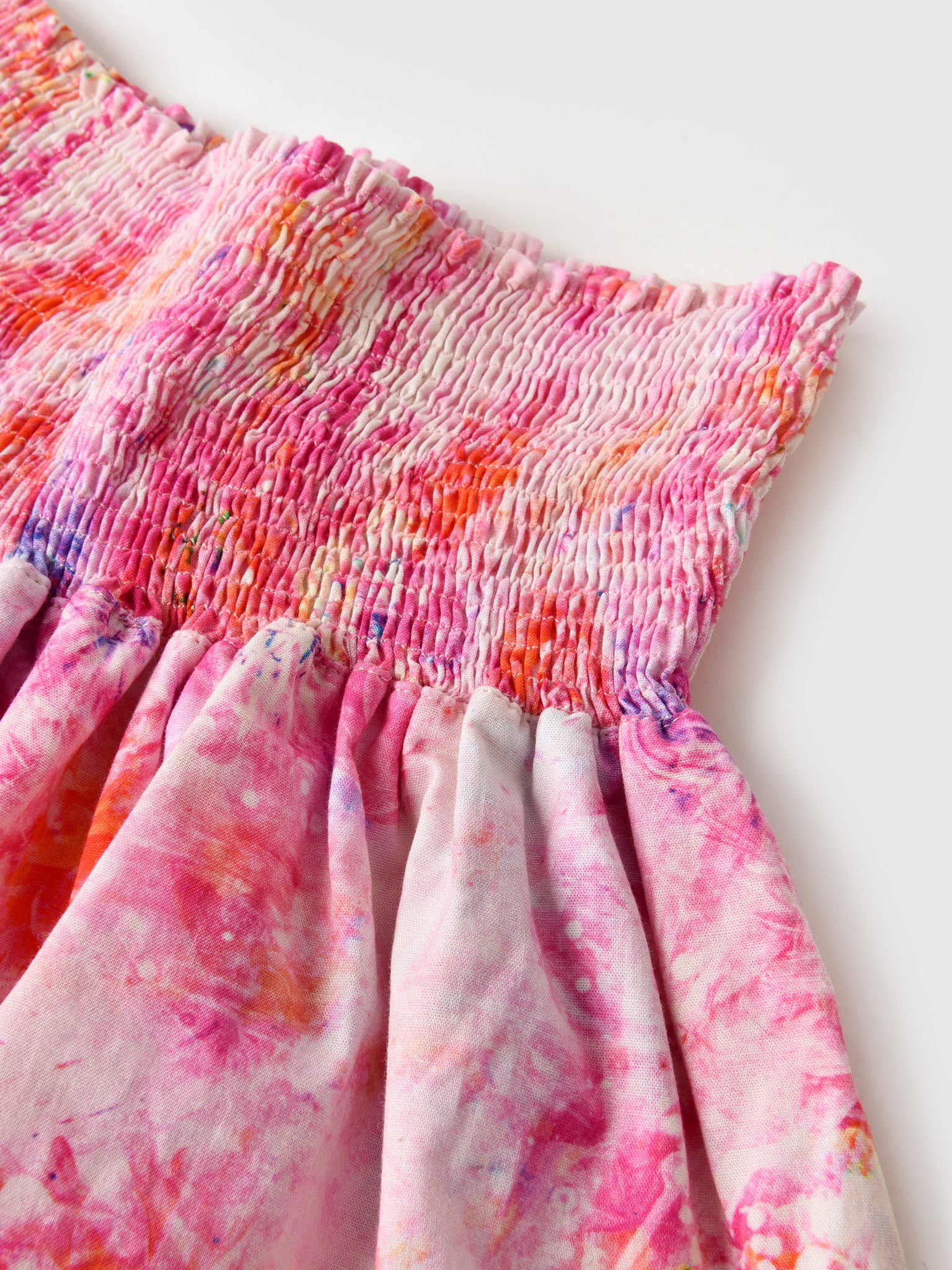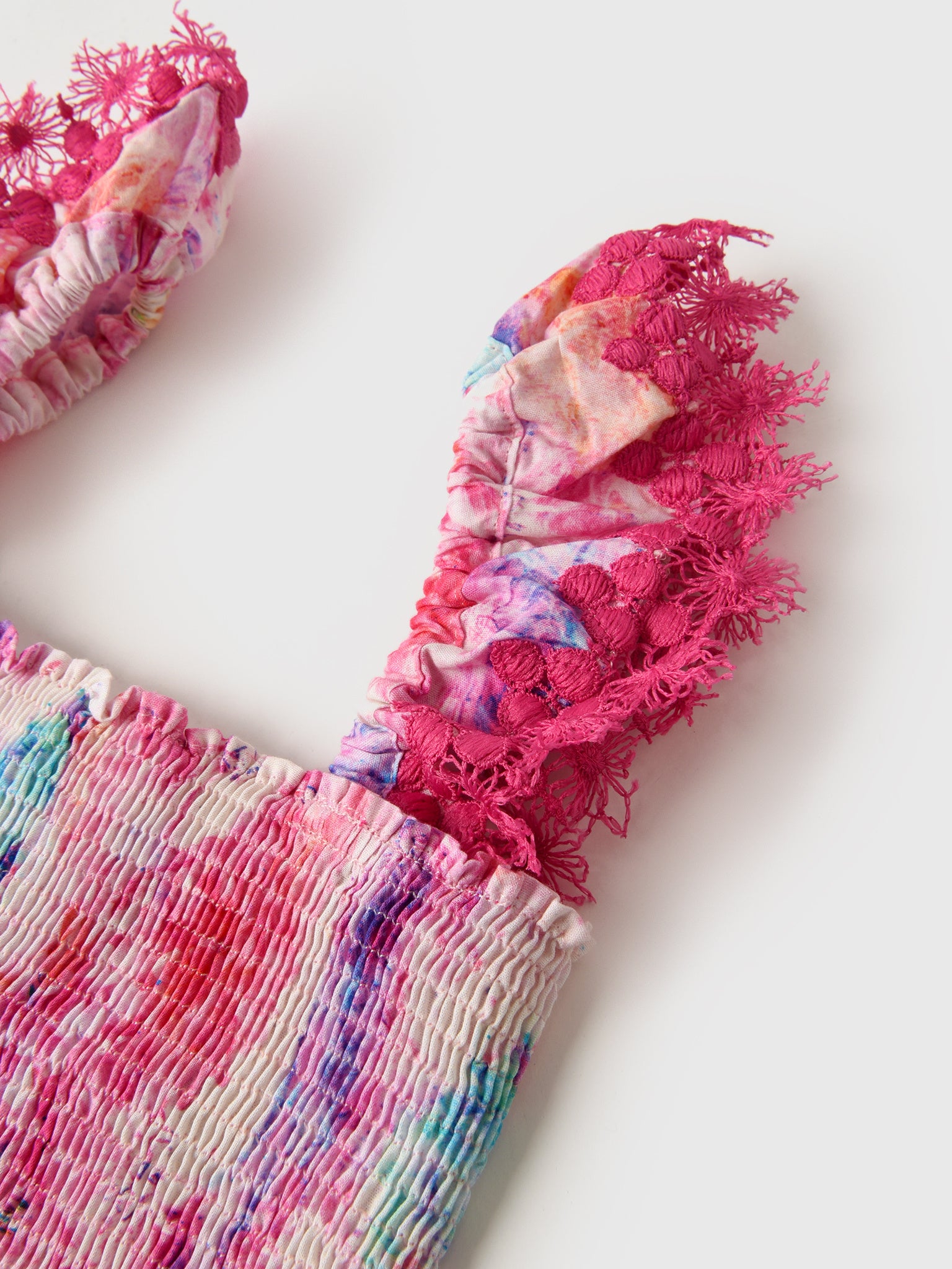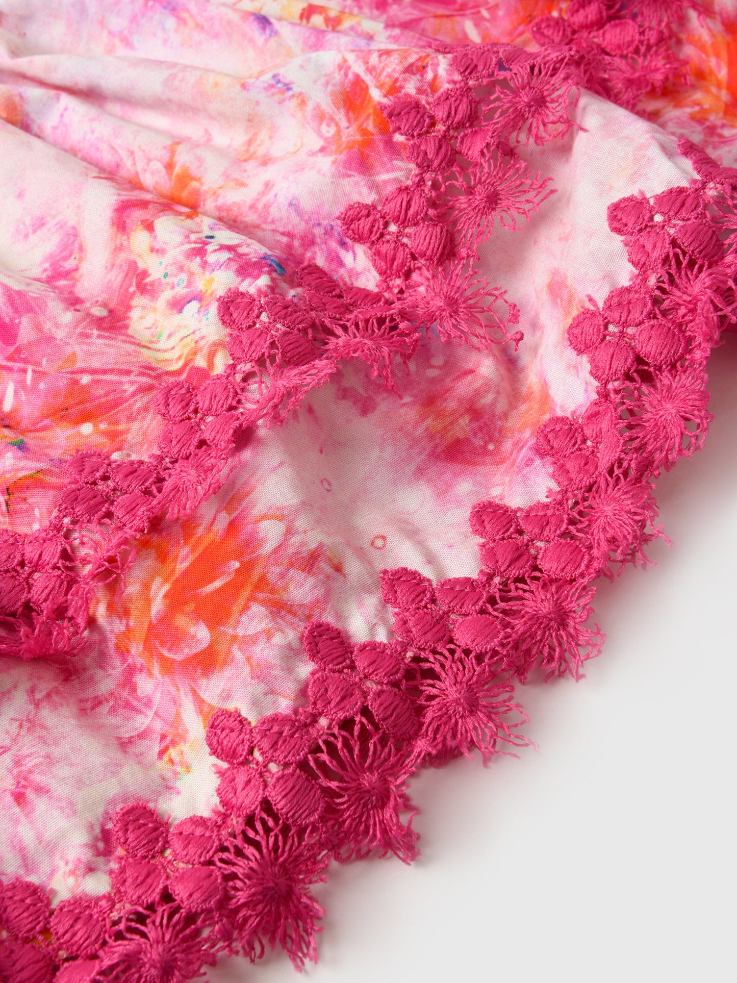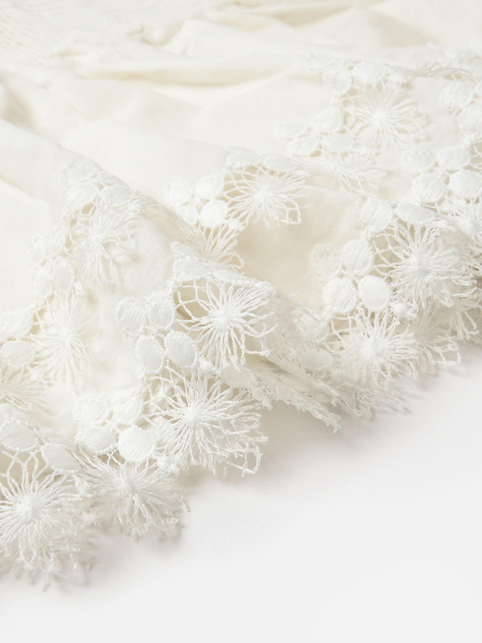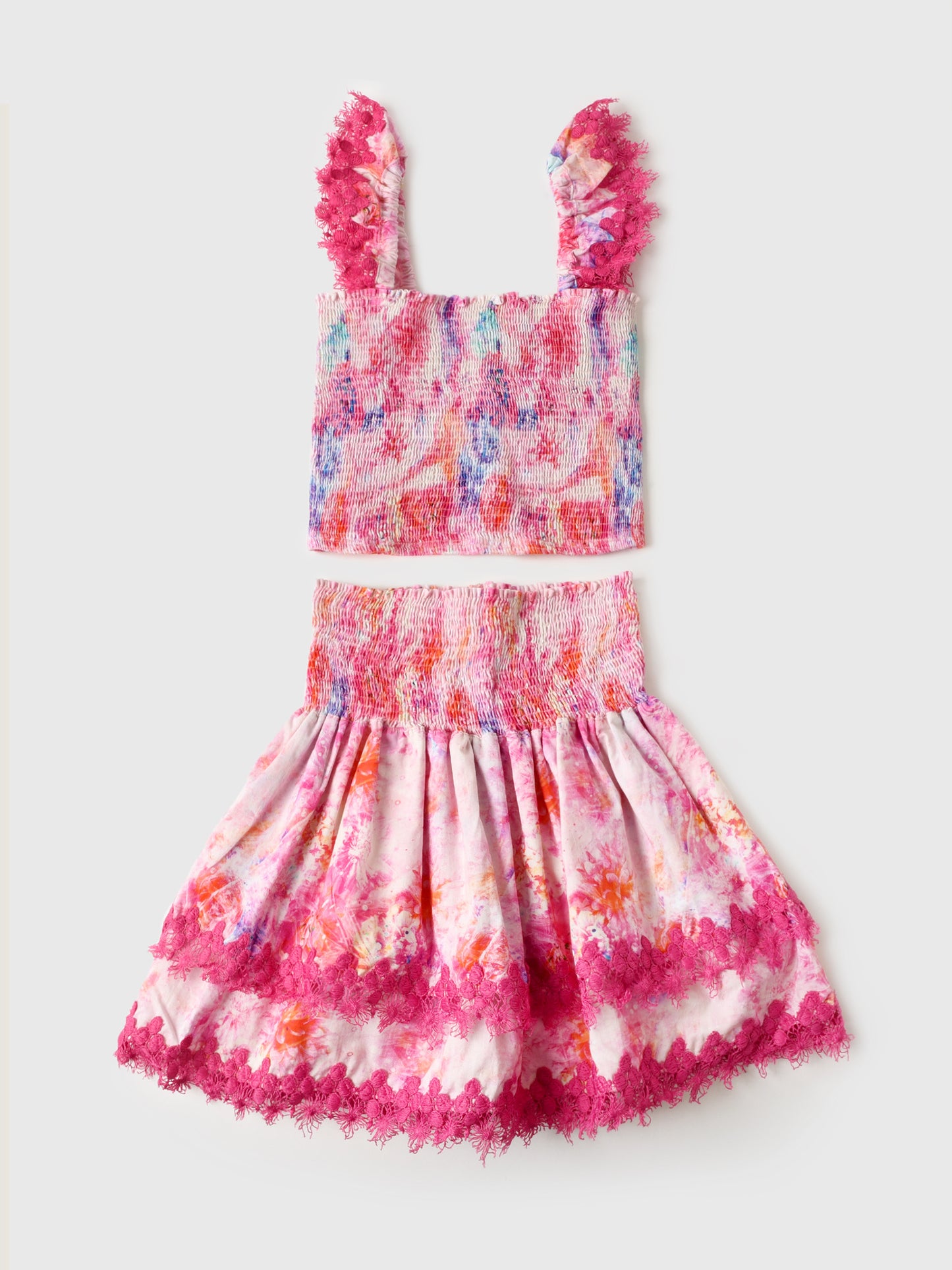 A matching top and skirt set made from lightweight fabric with delicate lace trims.