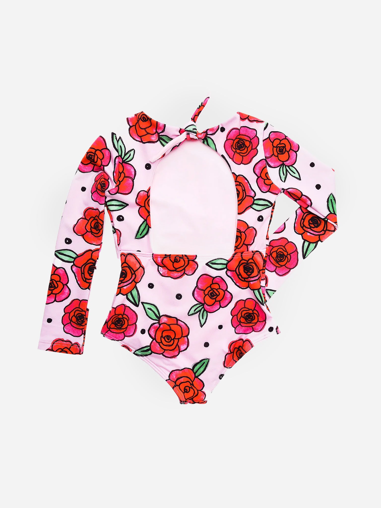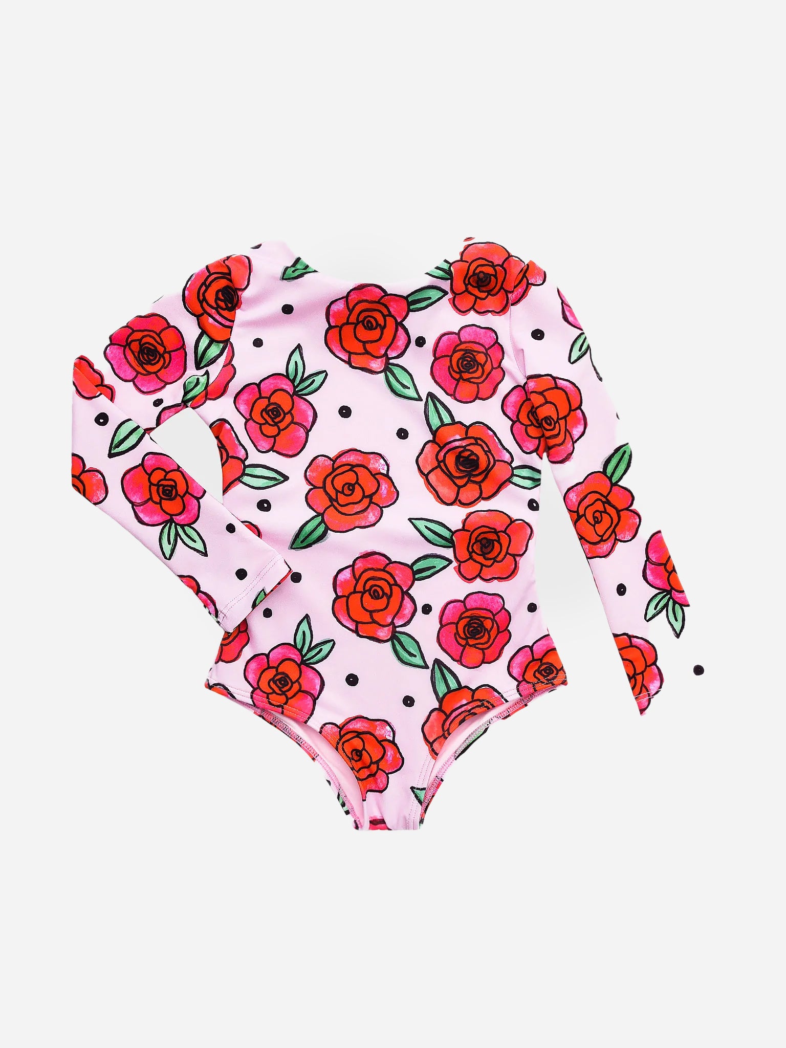 Long sleeve one piece swimsuit with an all-over rose motif.