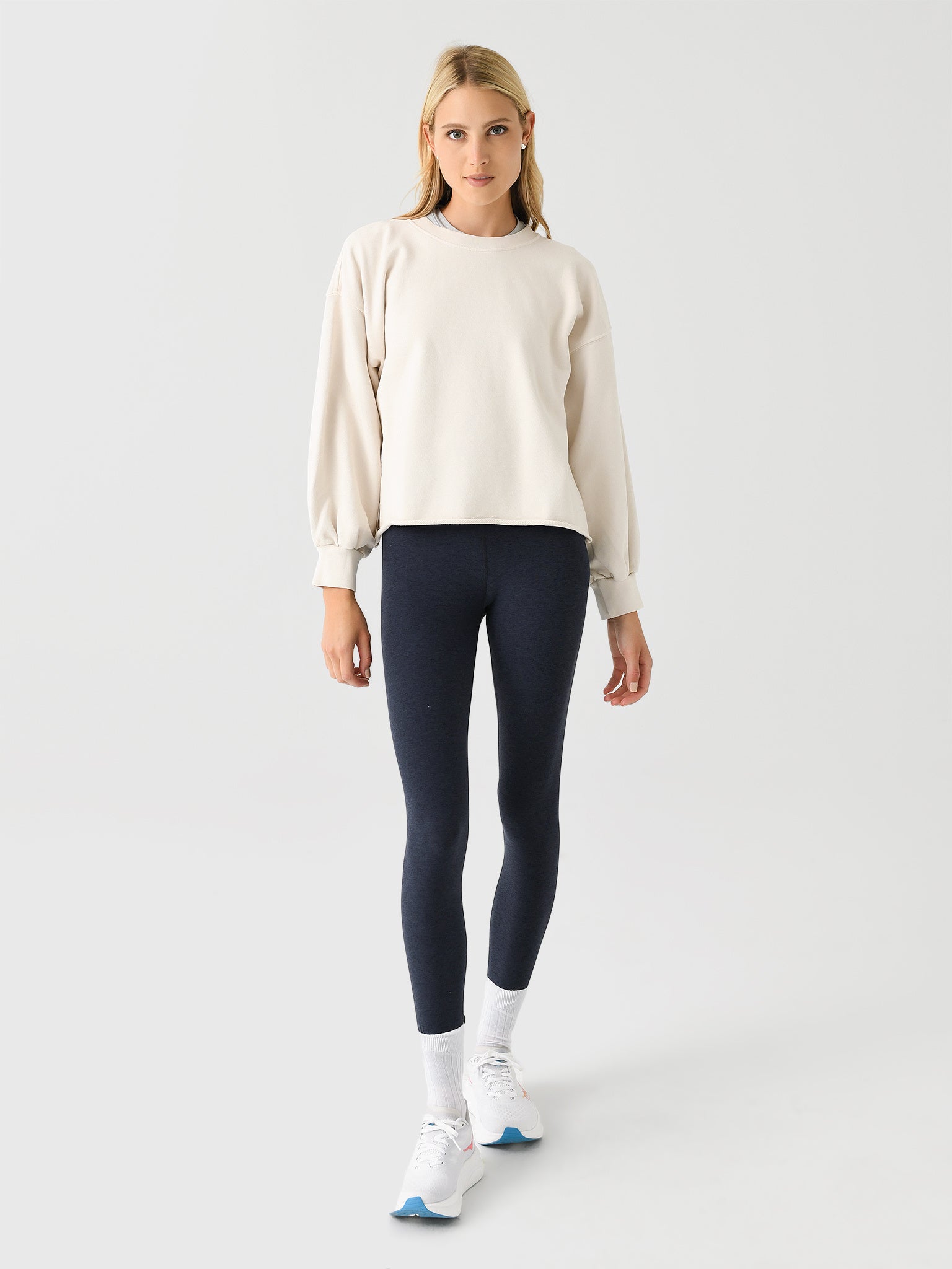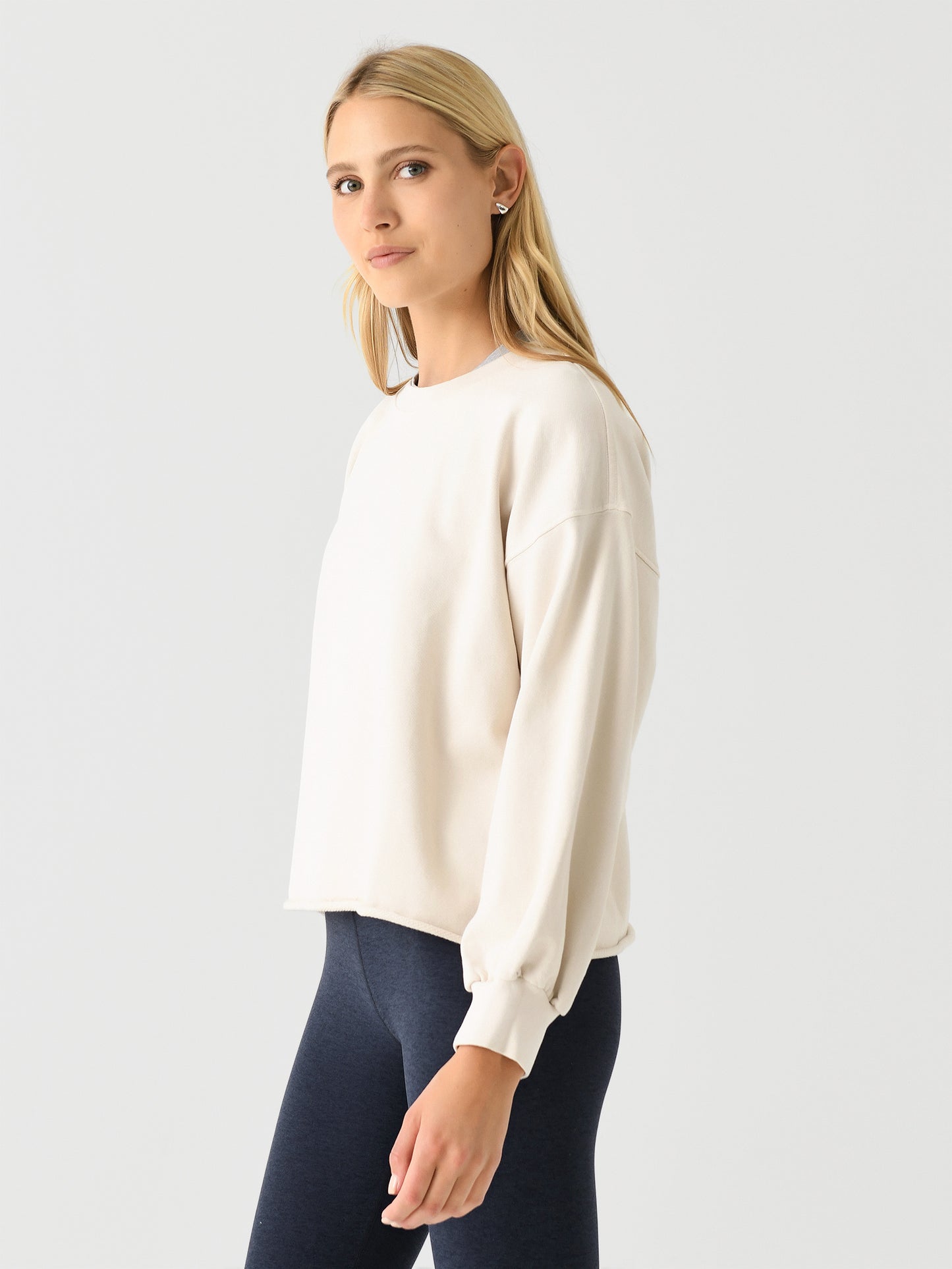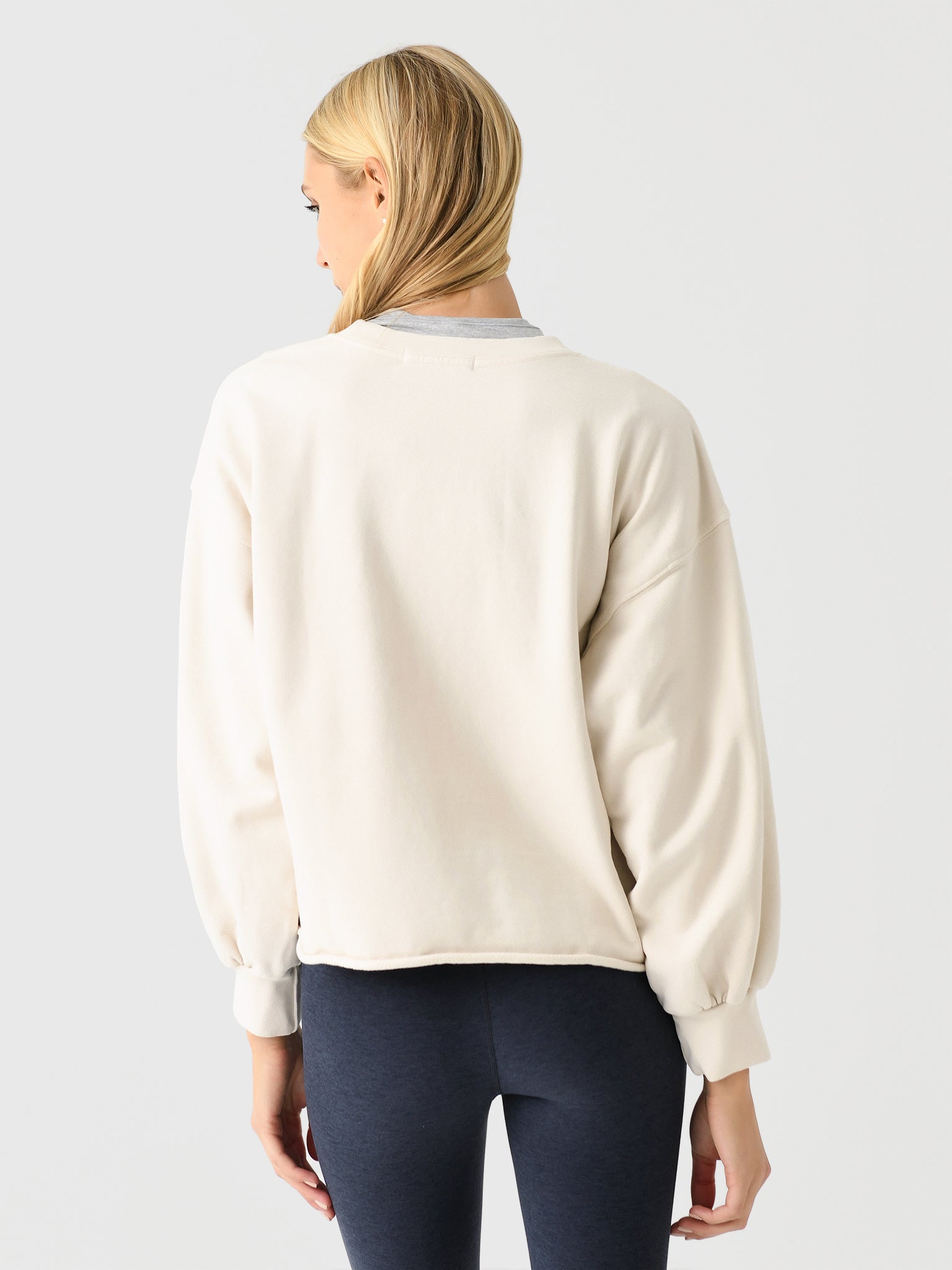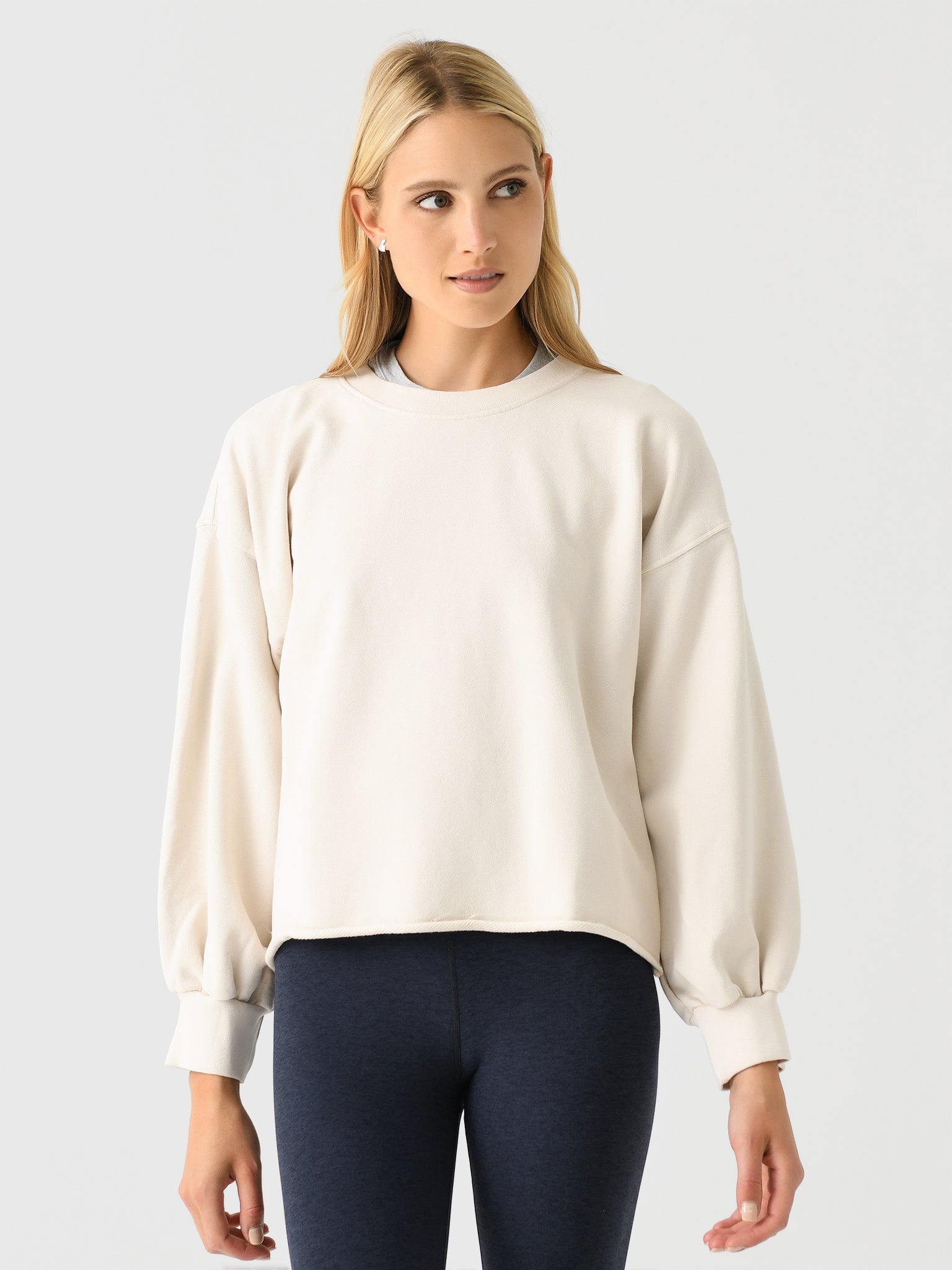 A cozy French terry pullover designed with feminine blouson sleeves and a raw edge hem.