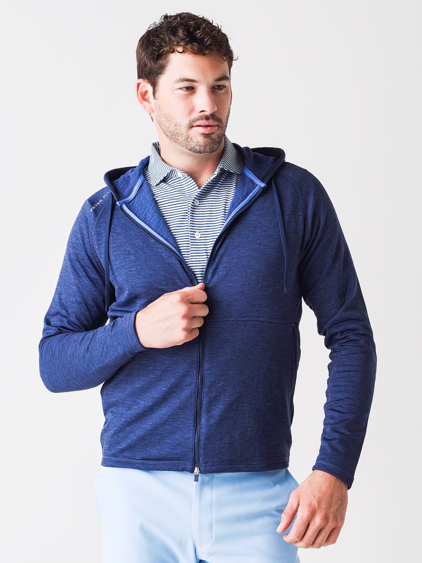 The Apollo Performance Hoodie from Peter Millar is soft, supple and versatile, pairing well with golf slacks or dressier casual pants. The fit is slim but not too tight. Quality of the cloth and stitching is top notch, as always with Peter Millar.