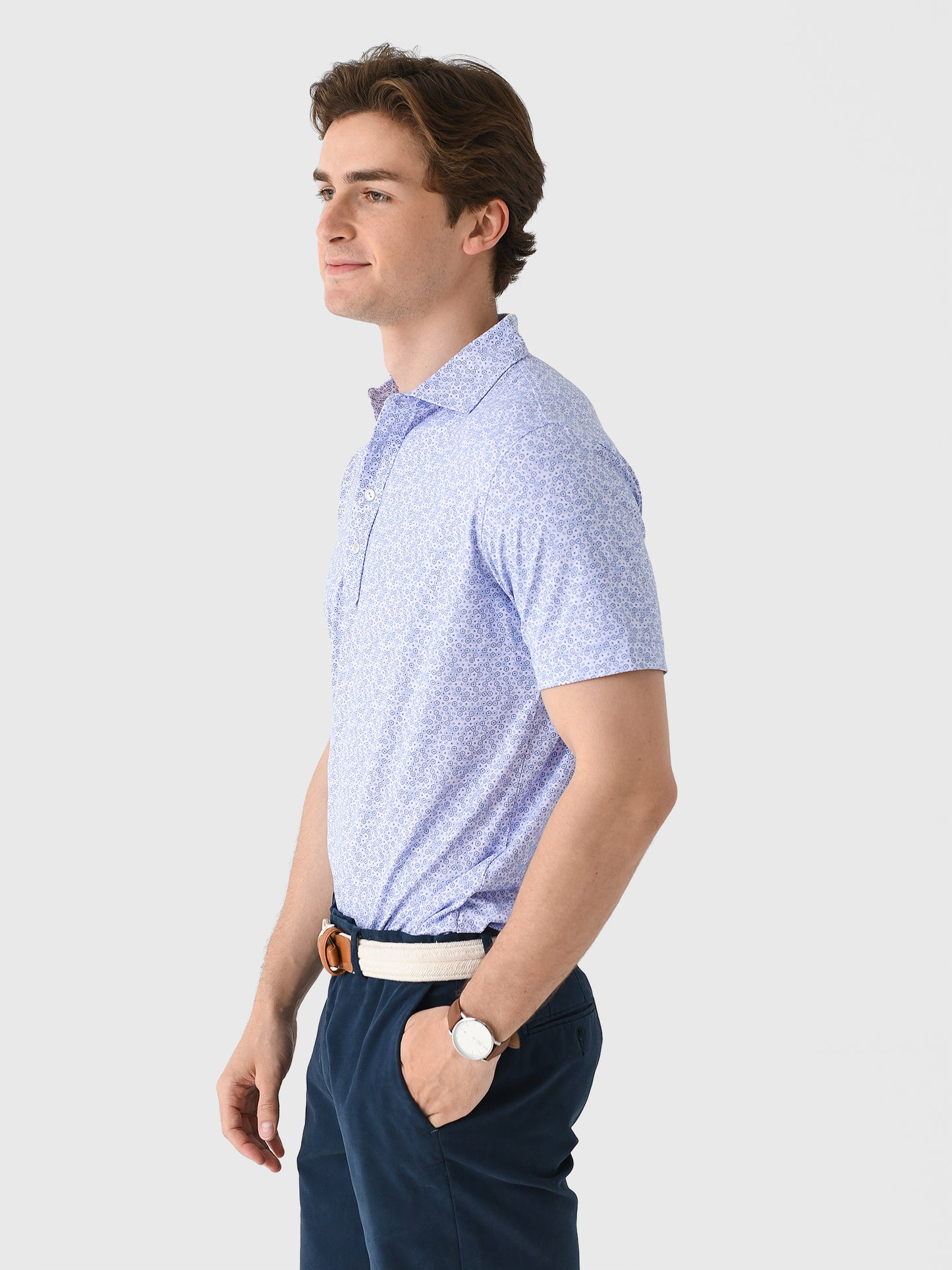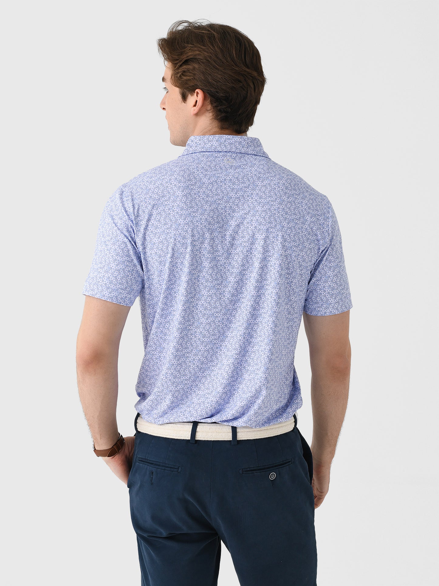 This plush polo features a stylish geometric print and mother-of-pearl buttons. The exceptional stretch fabric and moisture-wicking properties provide enhanced performance.