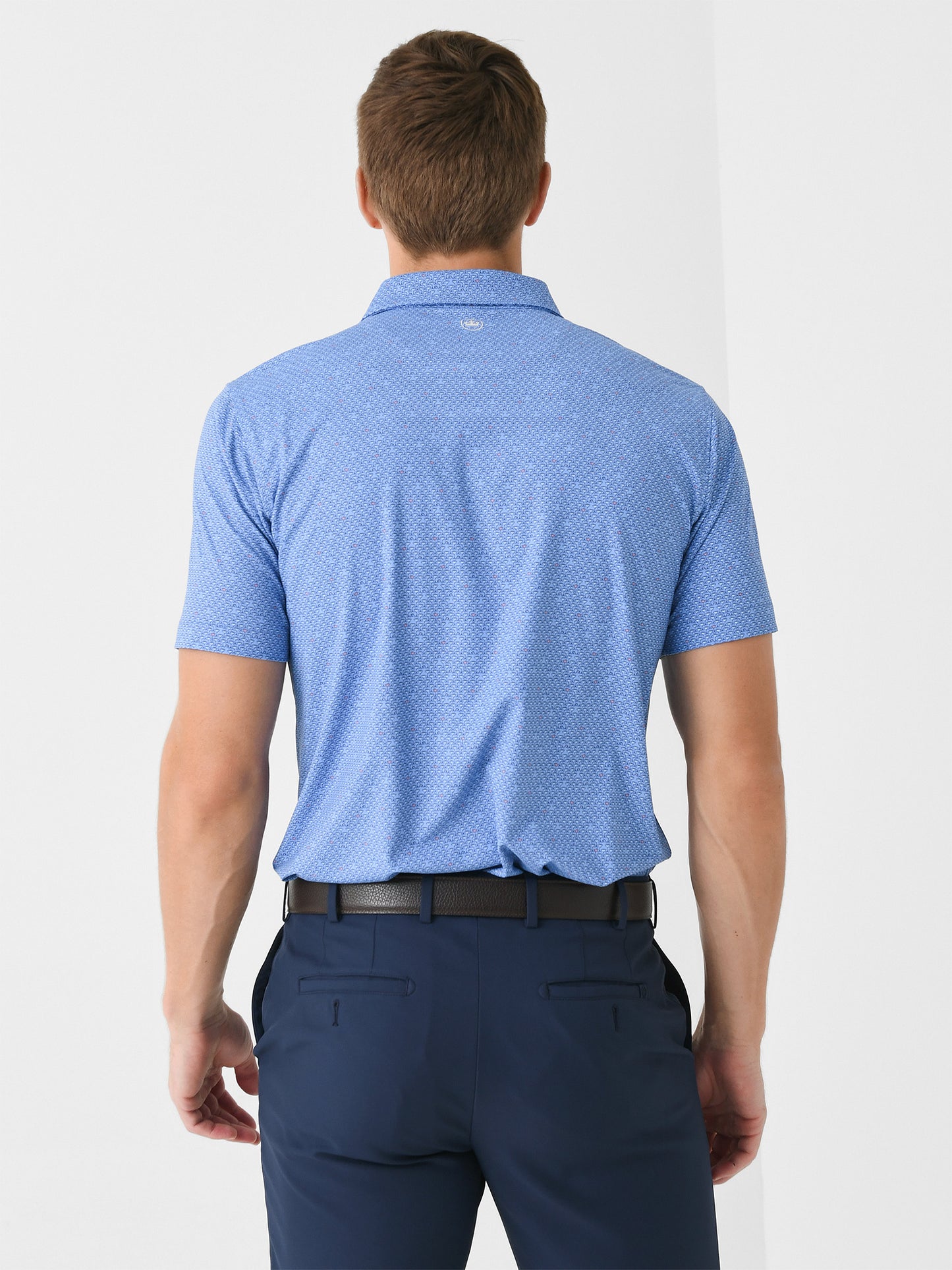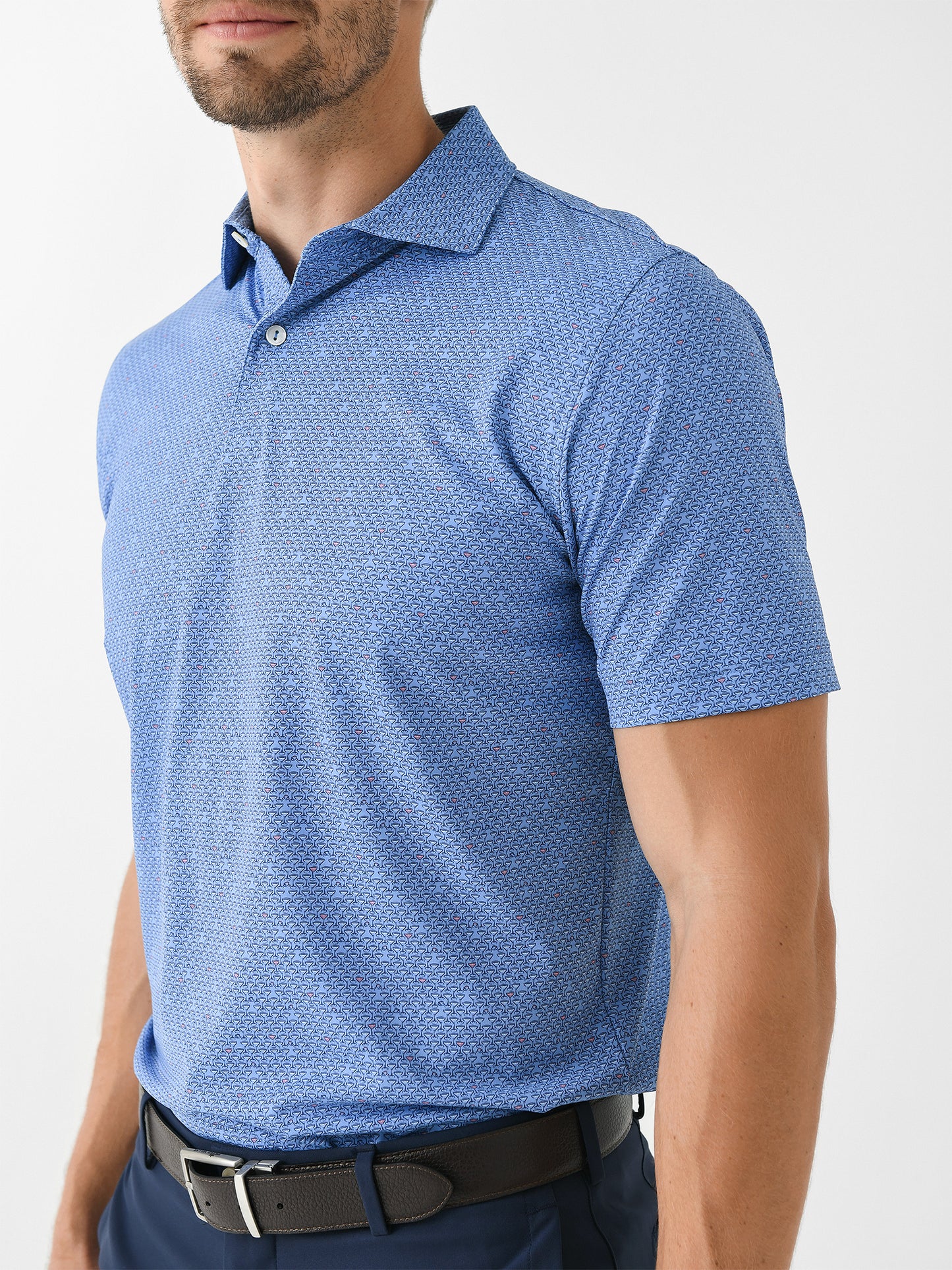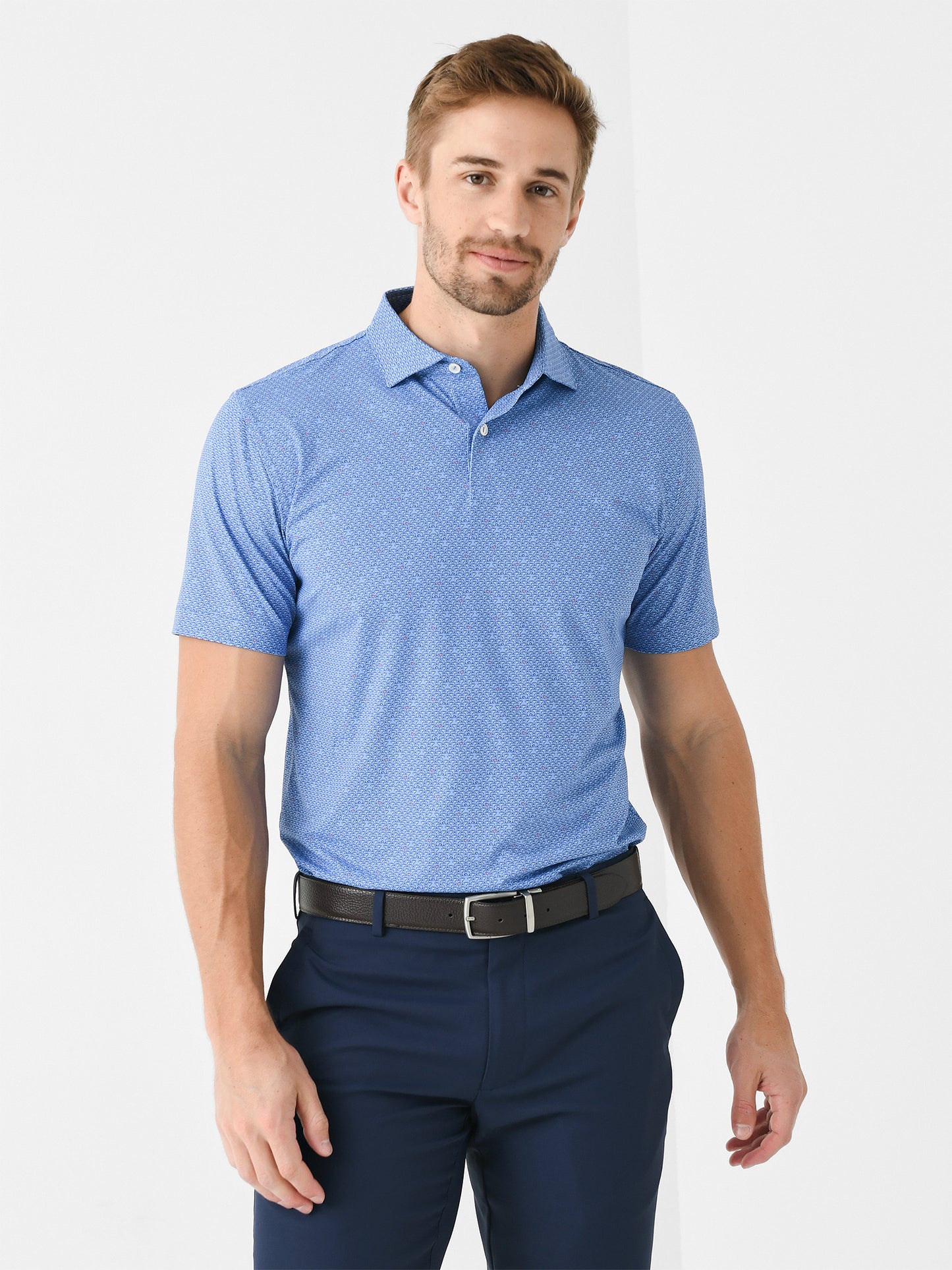 A lightweight performance polo made from breathable fabric with a custom beverage print.