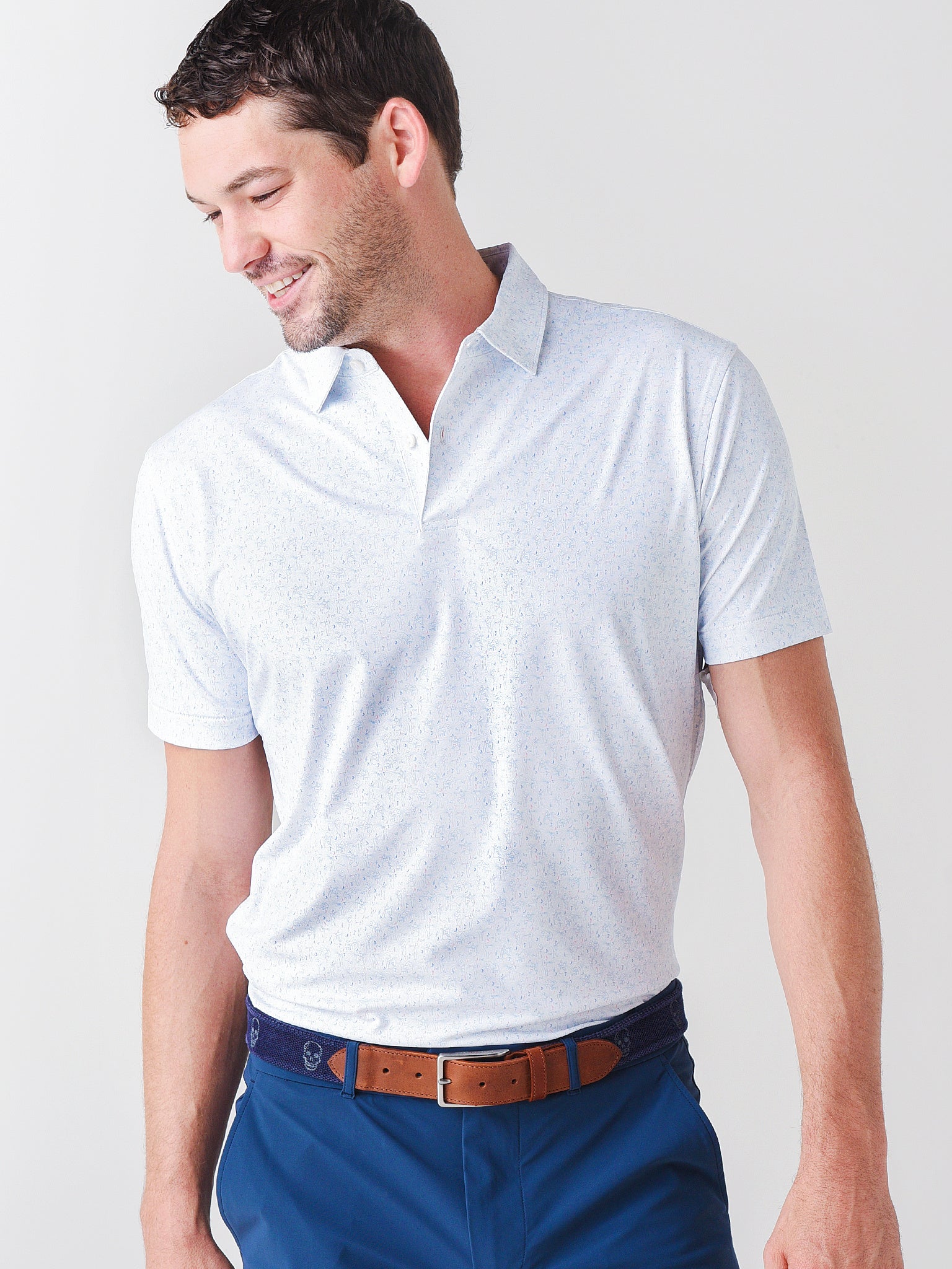 - Model is wearing size Medium polo.