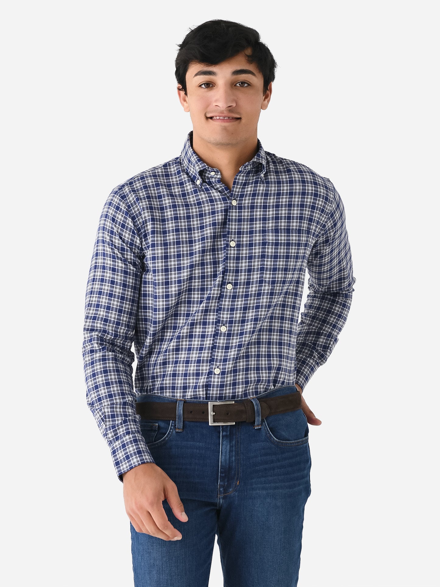 Plaid sport shirt with a classic French placket and double-button barrel cuffs.