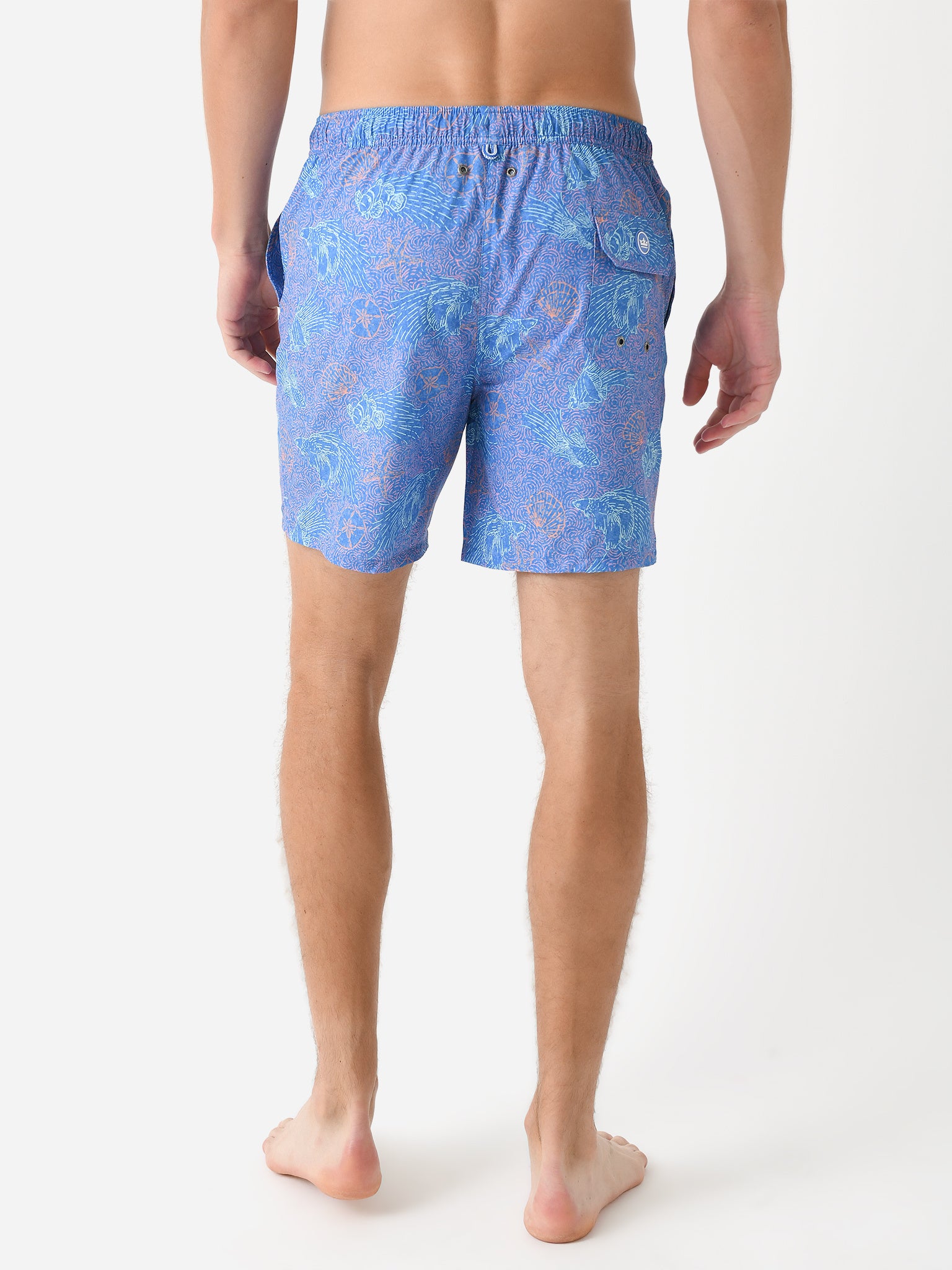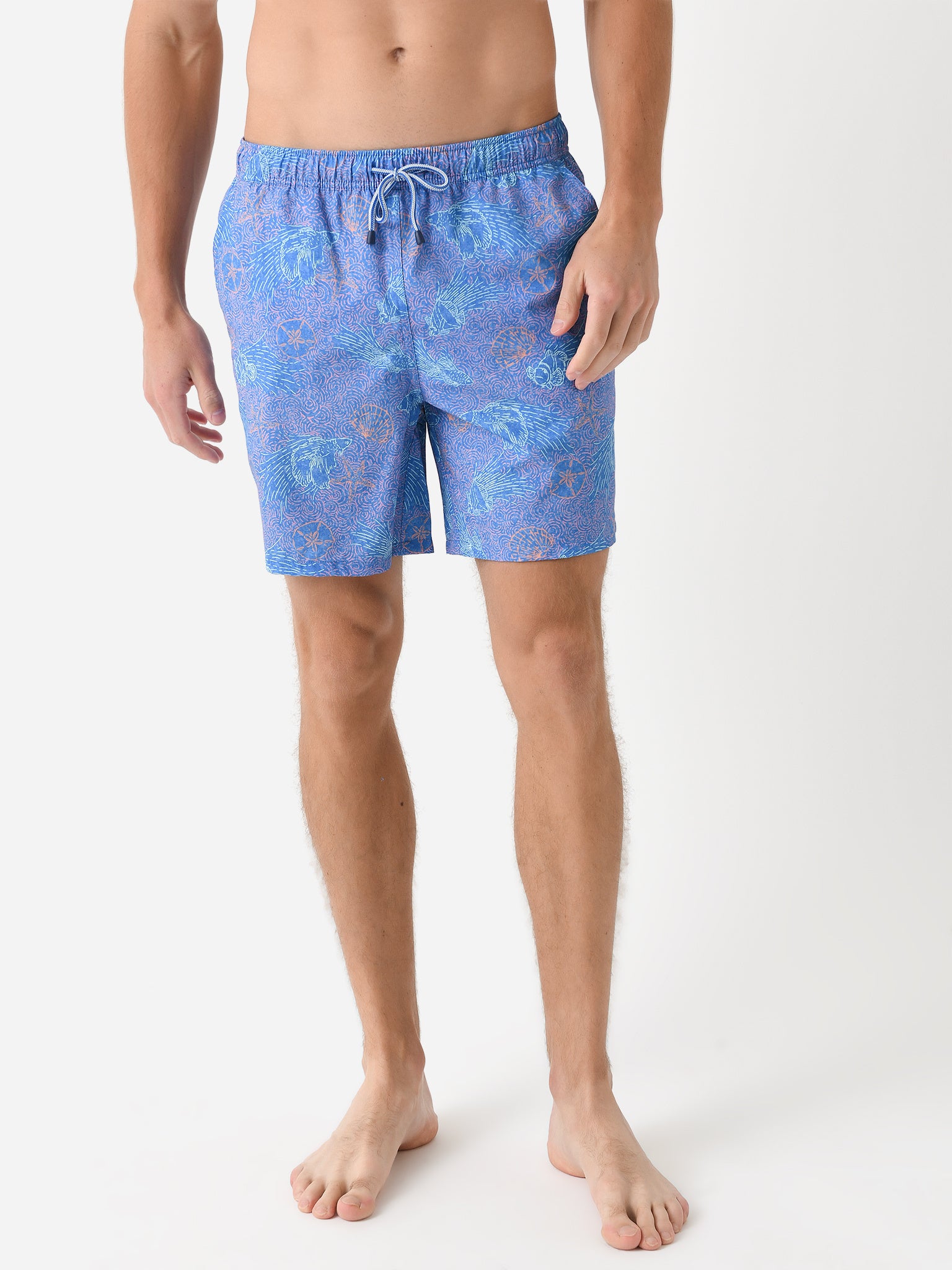 An ocean-themed swim trunk made from comfortable stretch with a fine mesh liner.