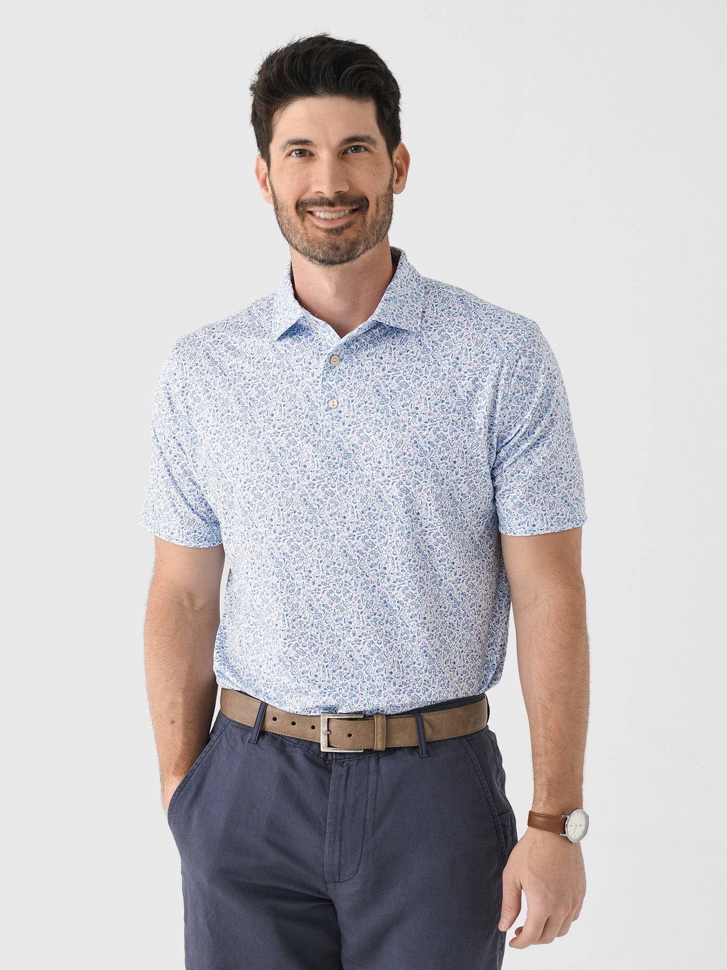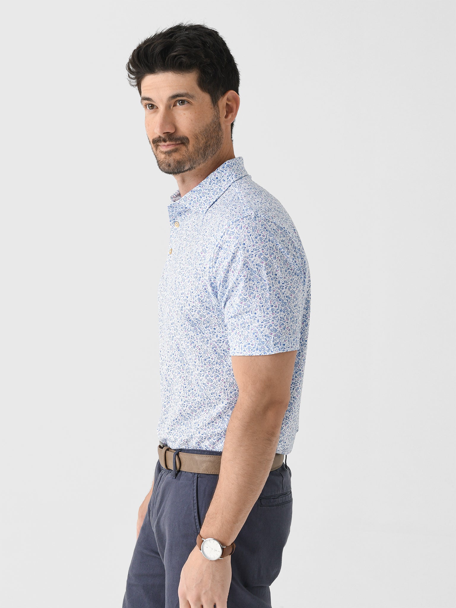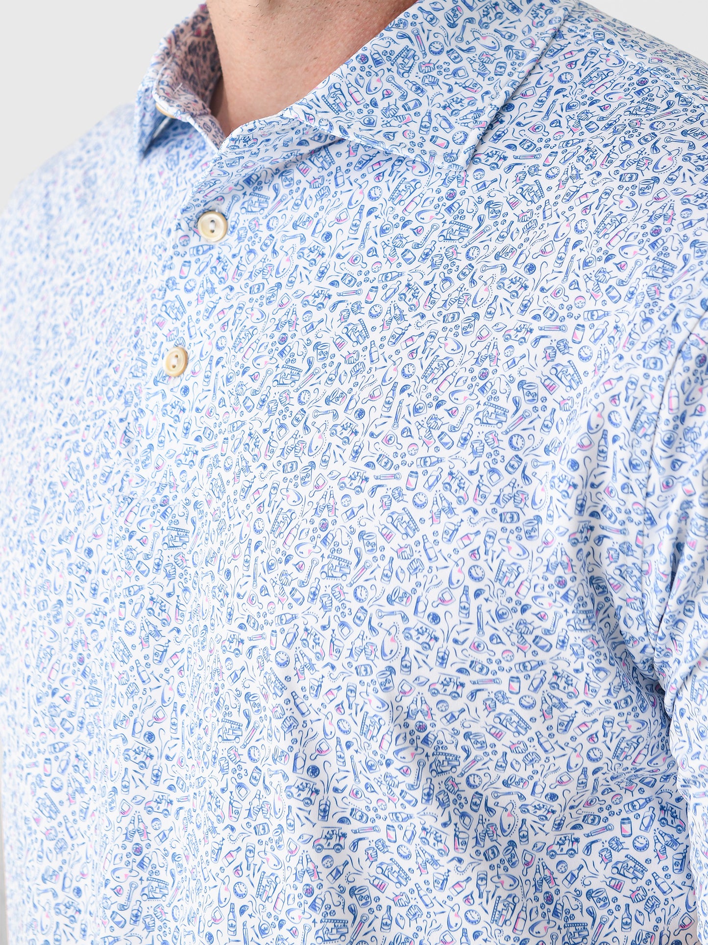 A breathable polo made from silky performance fabric with a custom cocktail bar print.