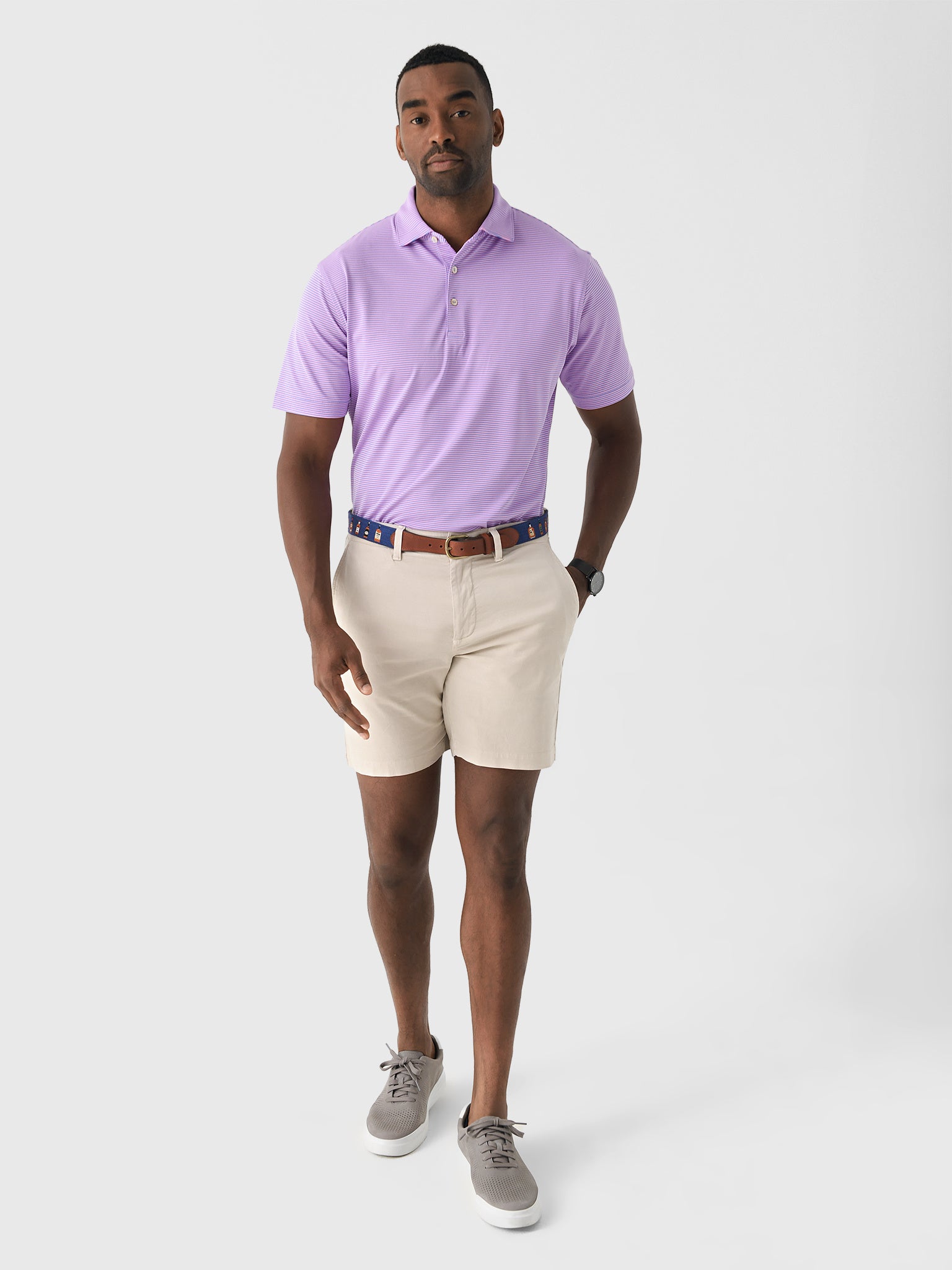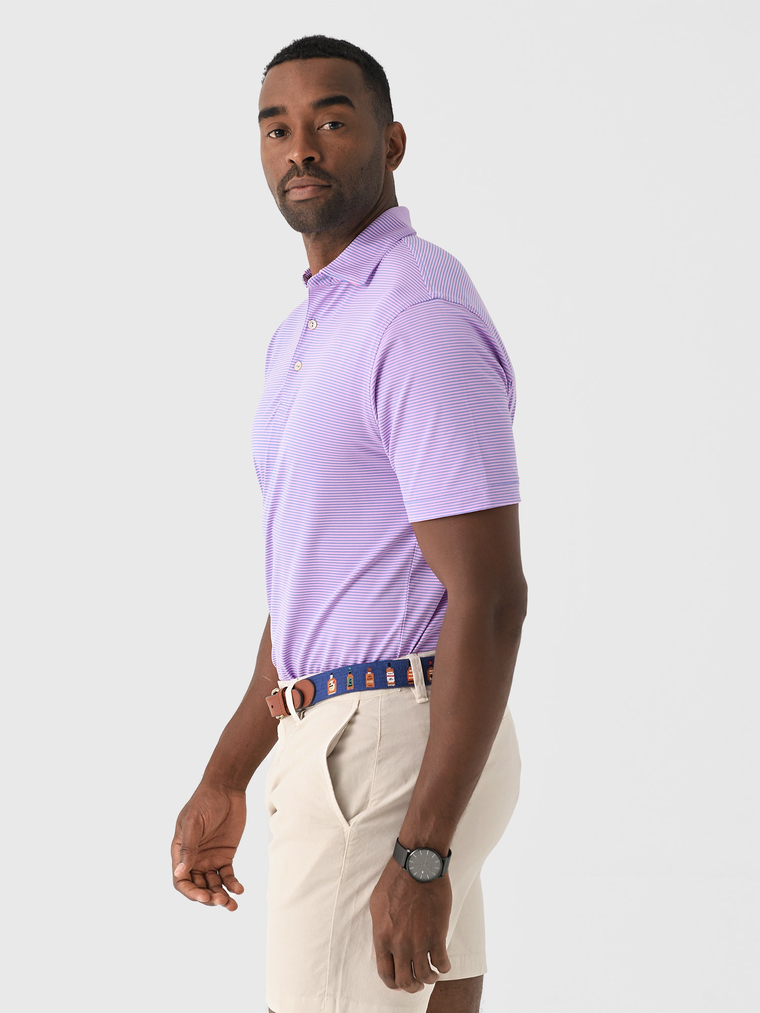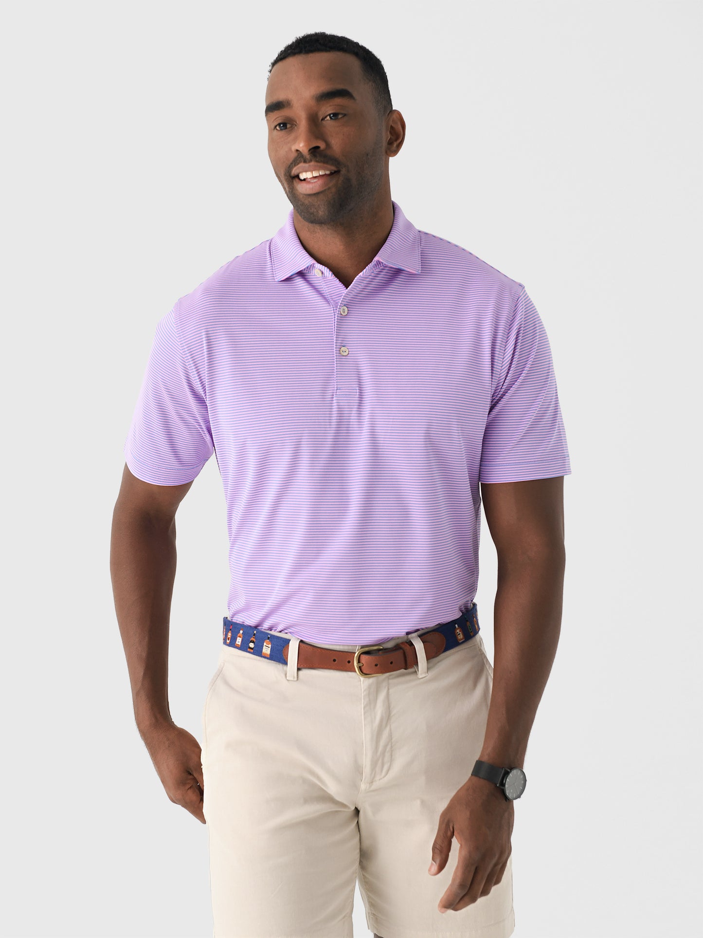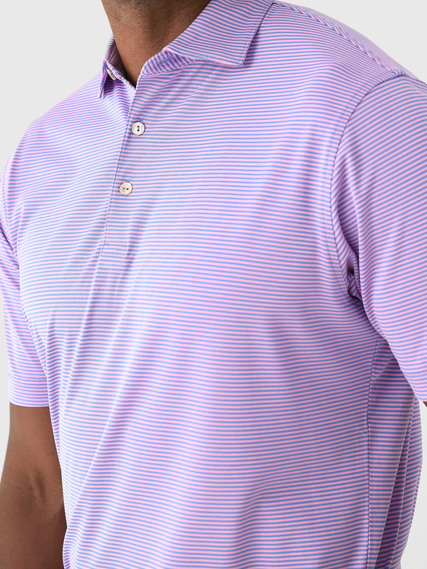 A lightweight polo crafted from breathable mesh performance fabric with four-way stretch and moisture-wicking properties featuring a classic stripe print.