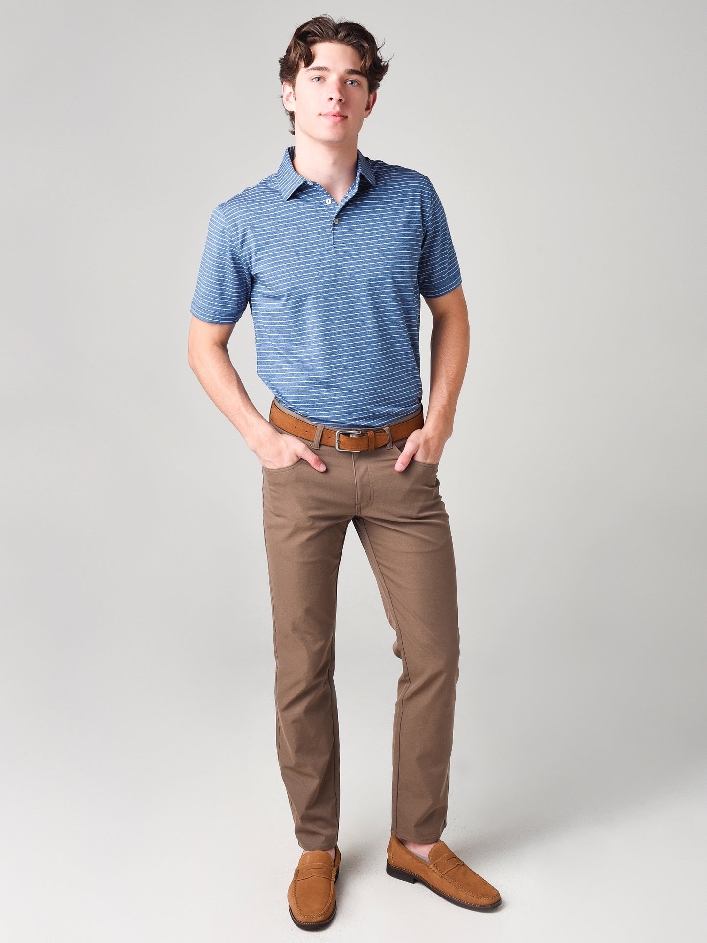 - Model is wearing size Medium polo.