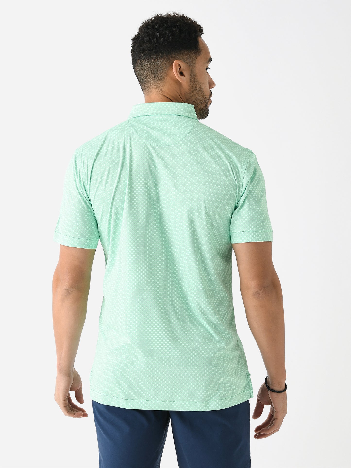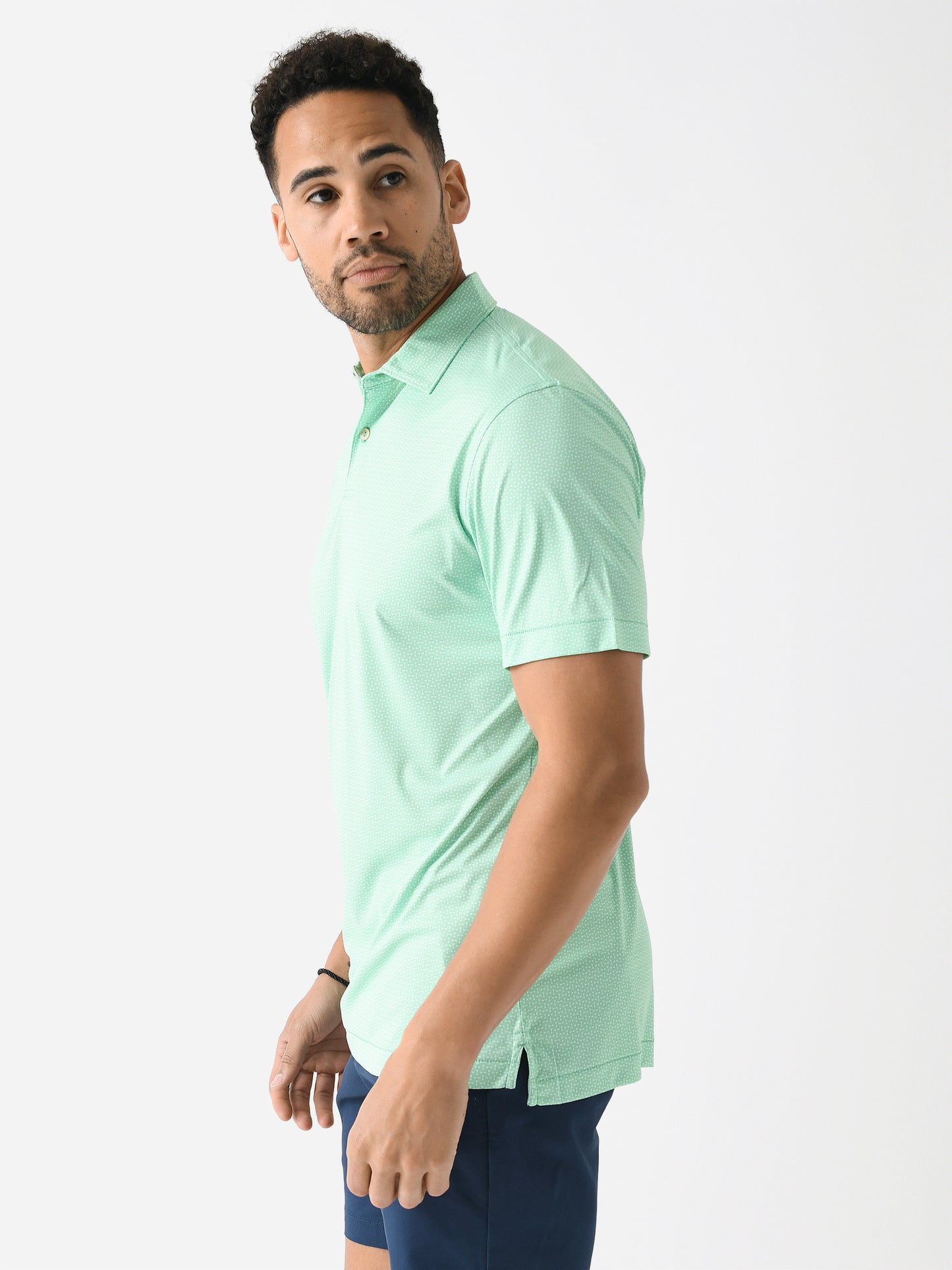 - Model is wearing size Medium polo.