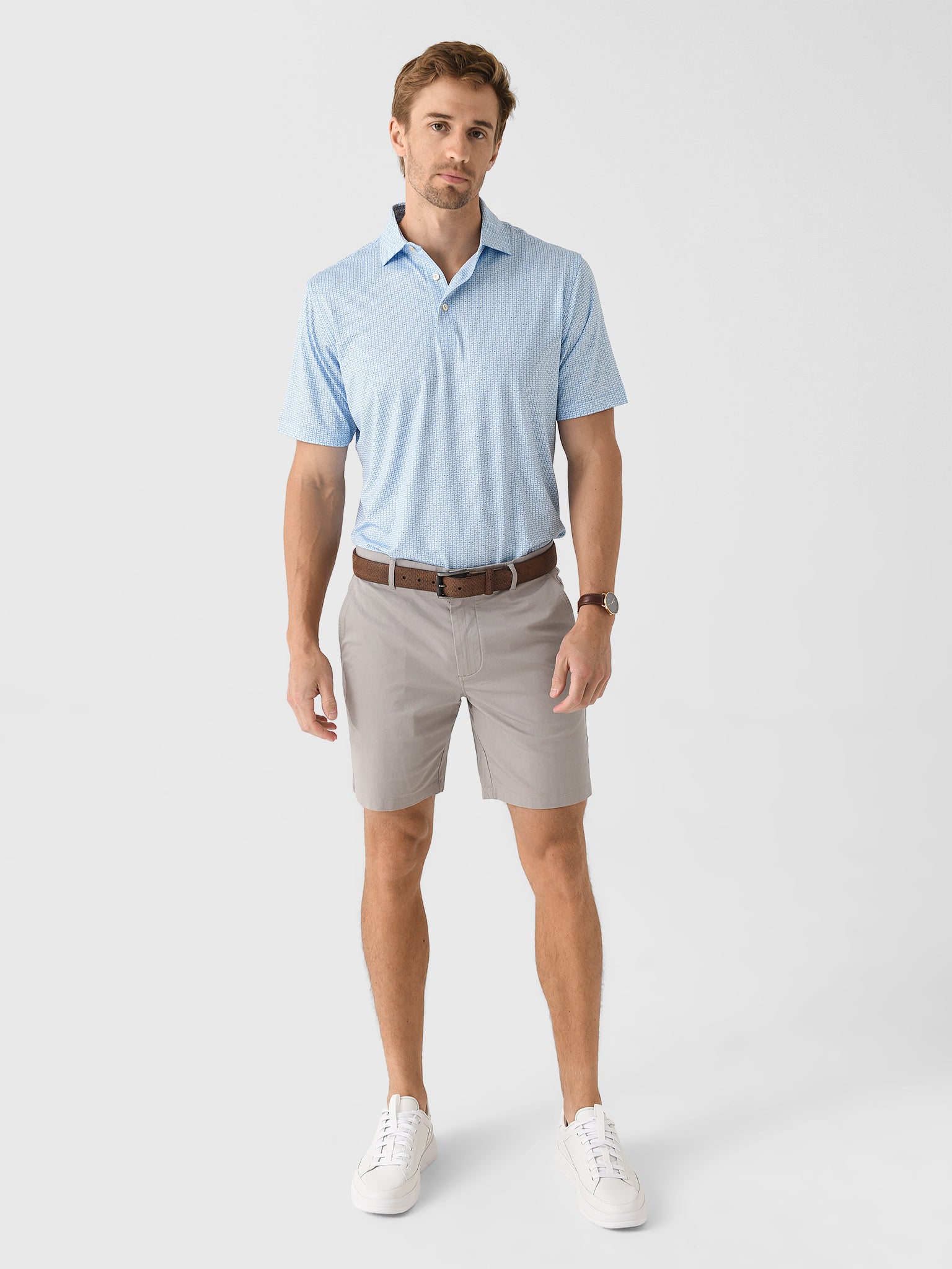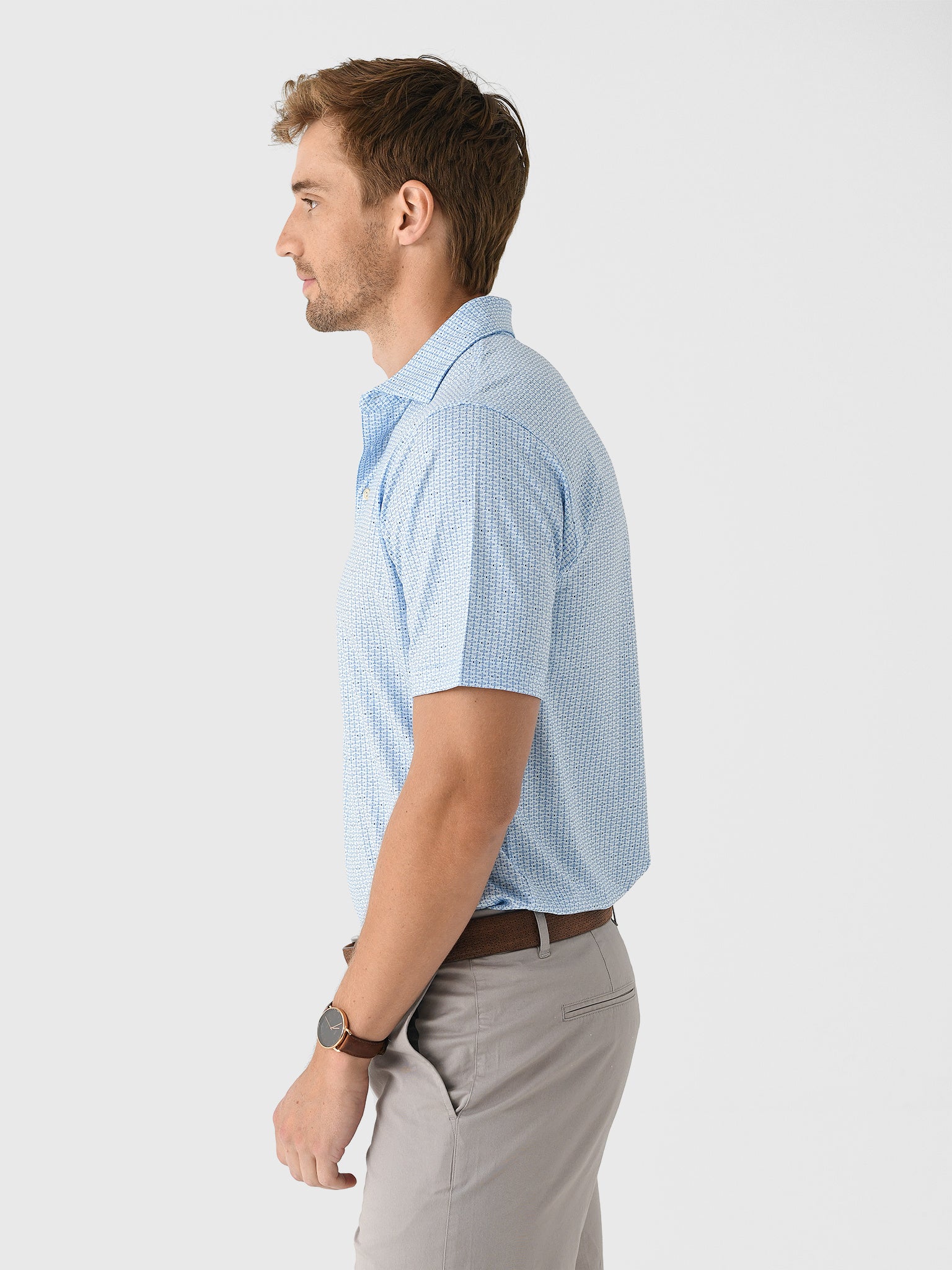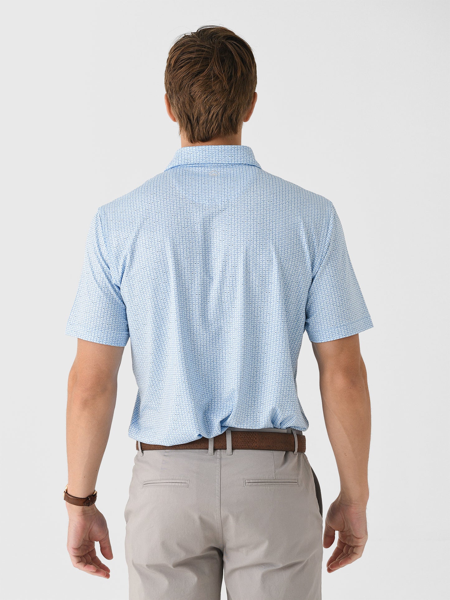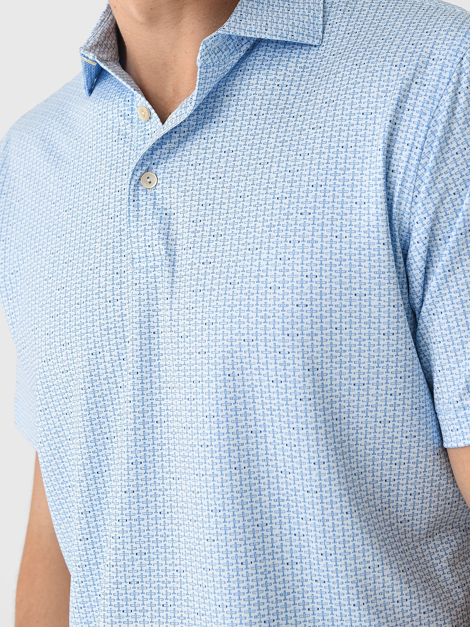 Elevate your golf attire to new heights with this lightweight polo made from smooth performance fabric featuring exceptional four-way stretch, moisture-wicking properties, and a custom airplane print.