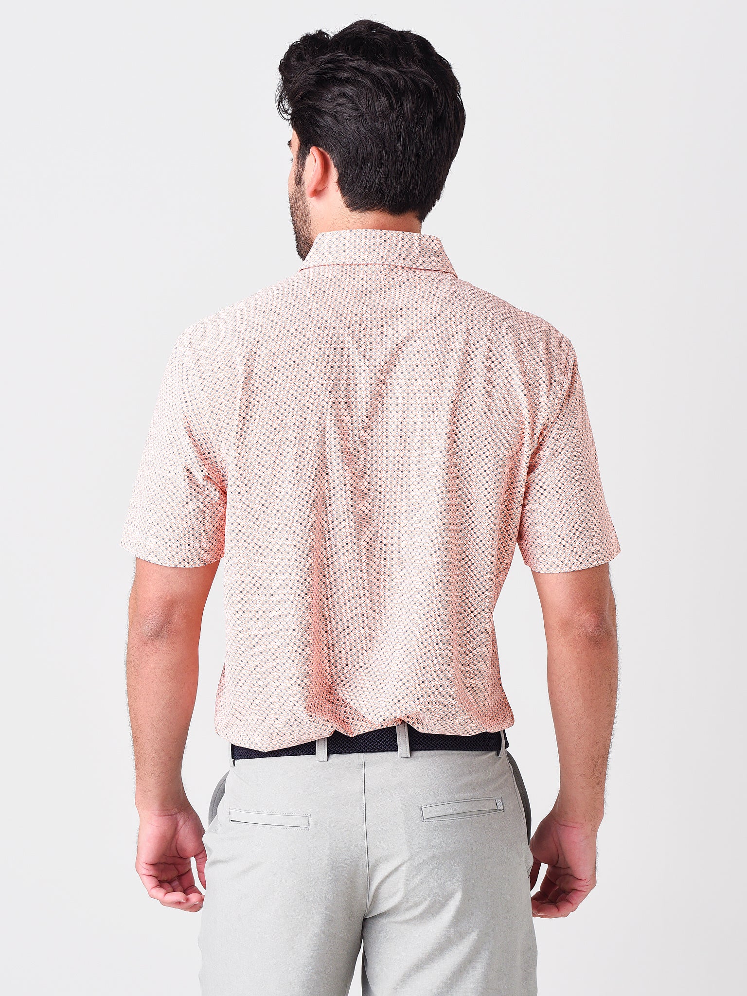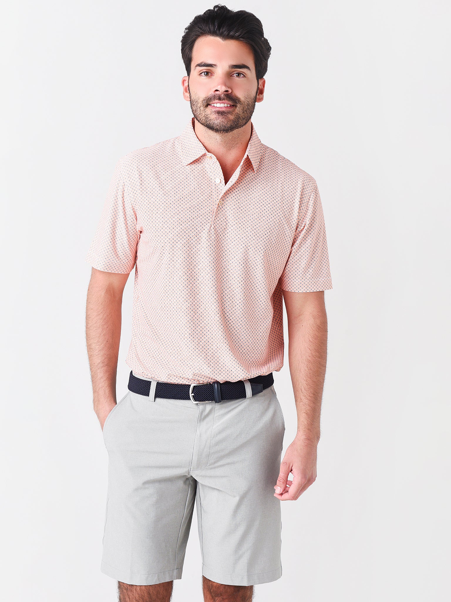 - Model is wearing size Medium polo.