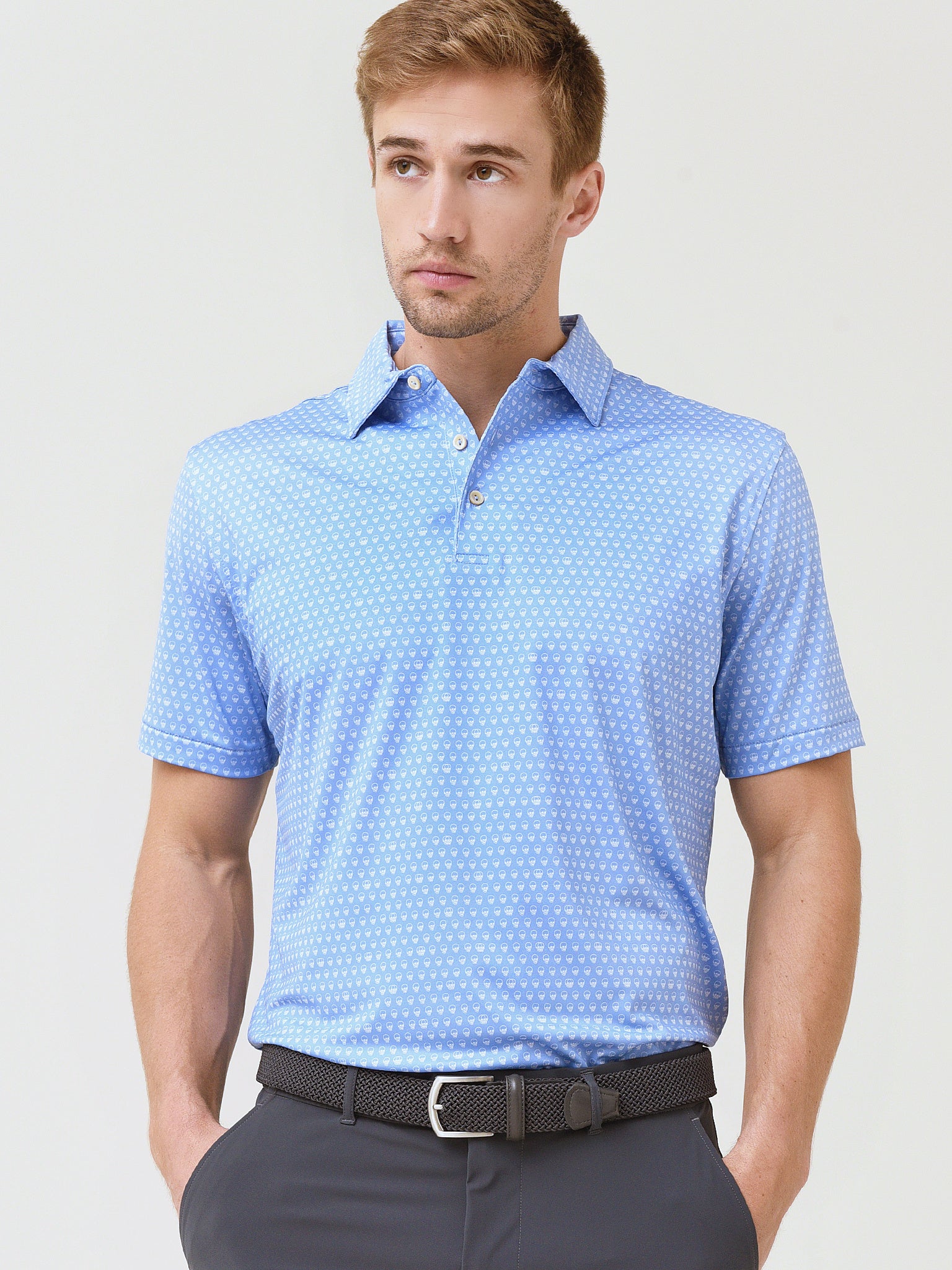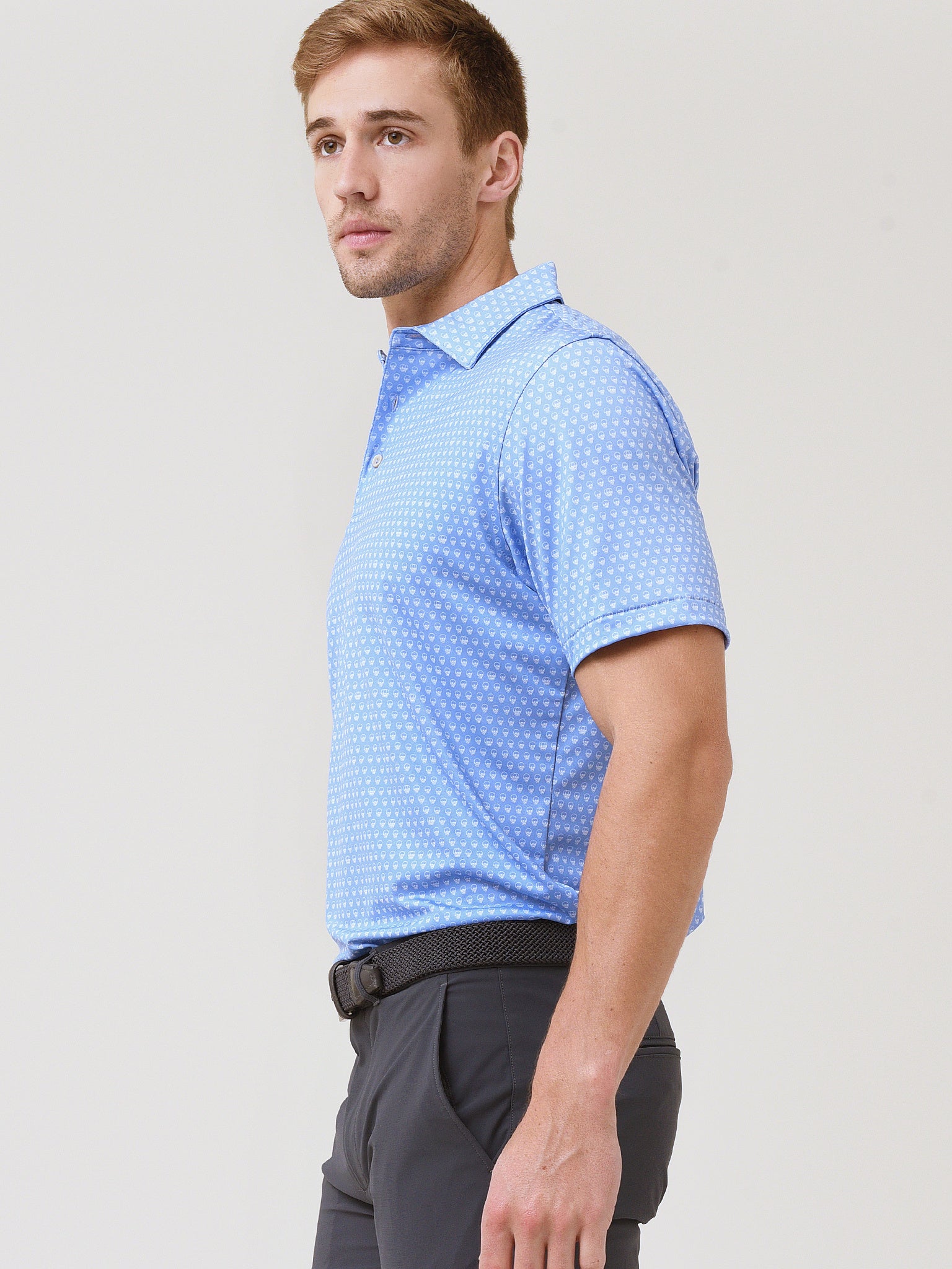 - Model is wearing size Medium polo.