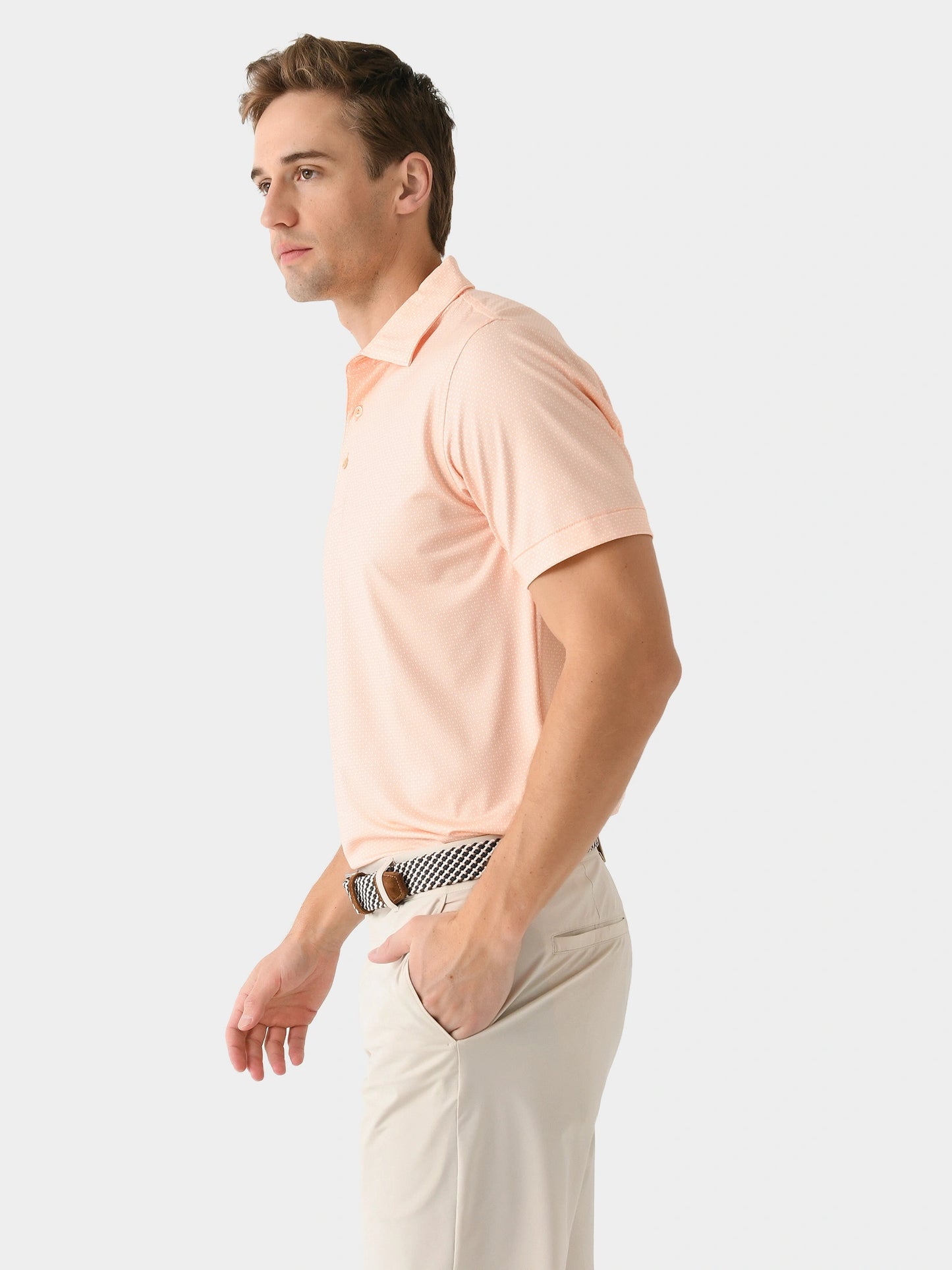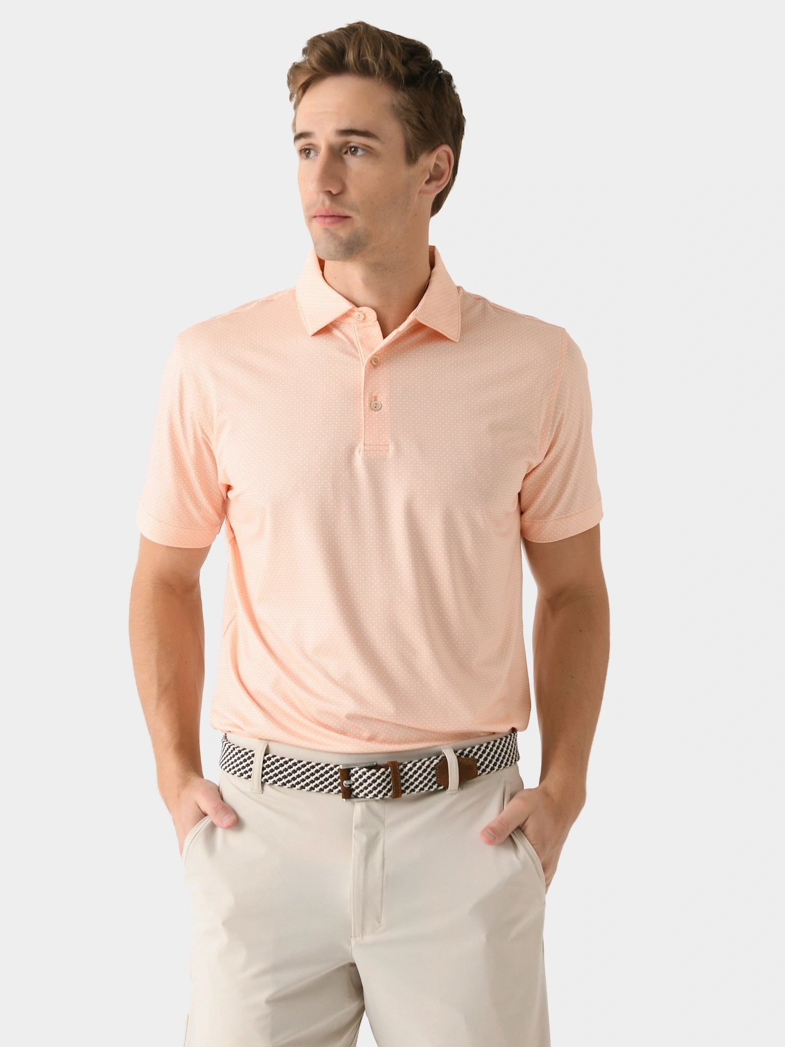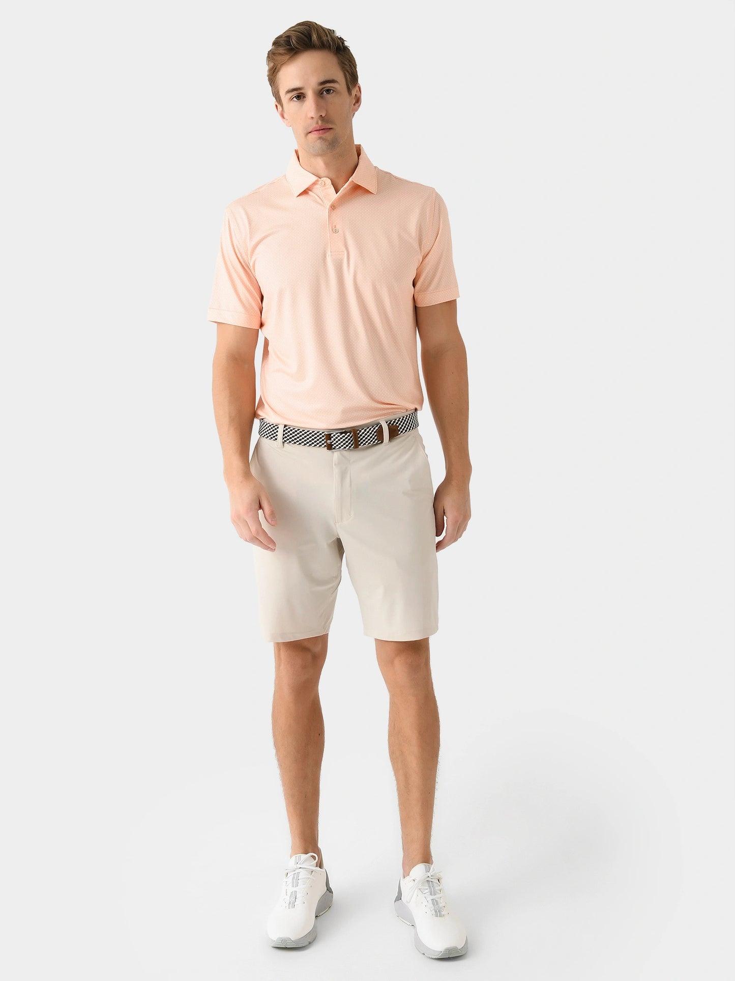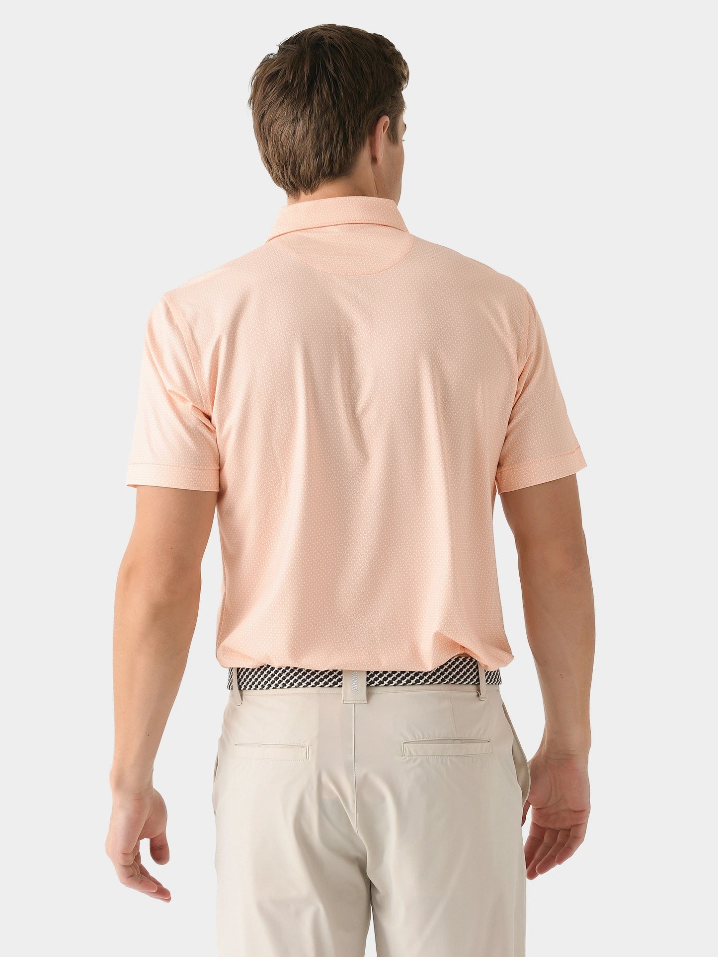 A lightweight polo made from performance fabric with a custom geometric print.