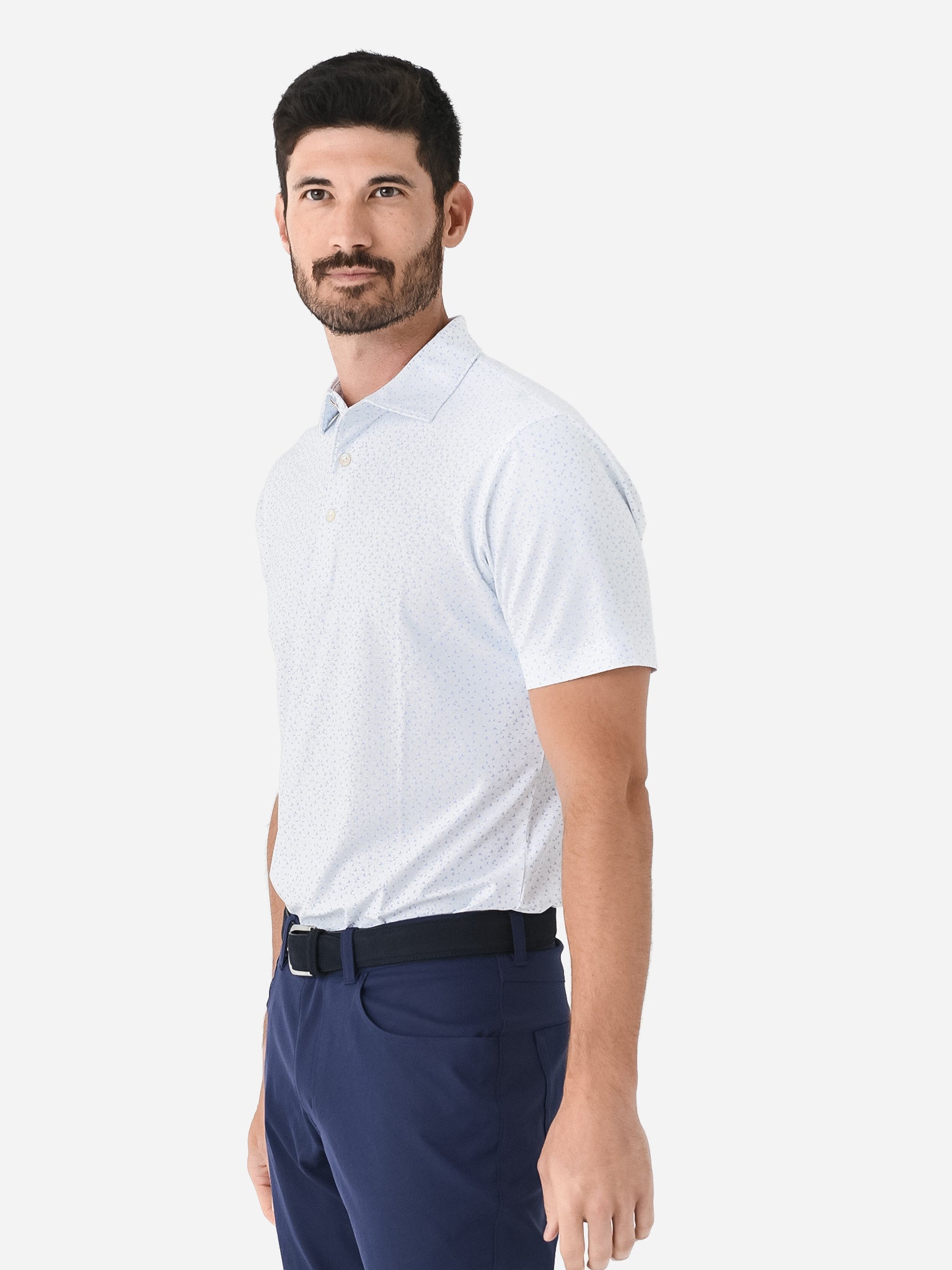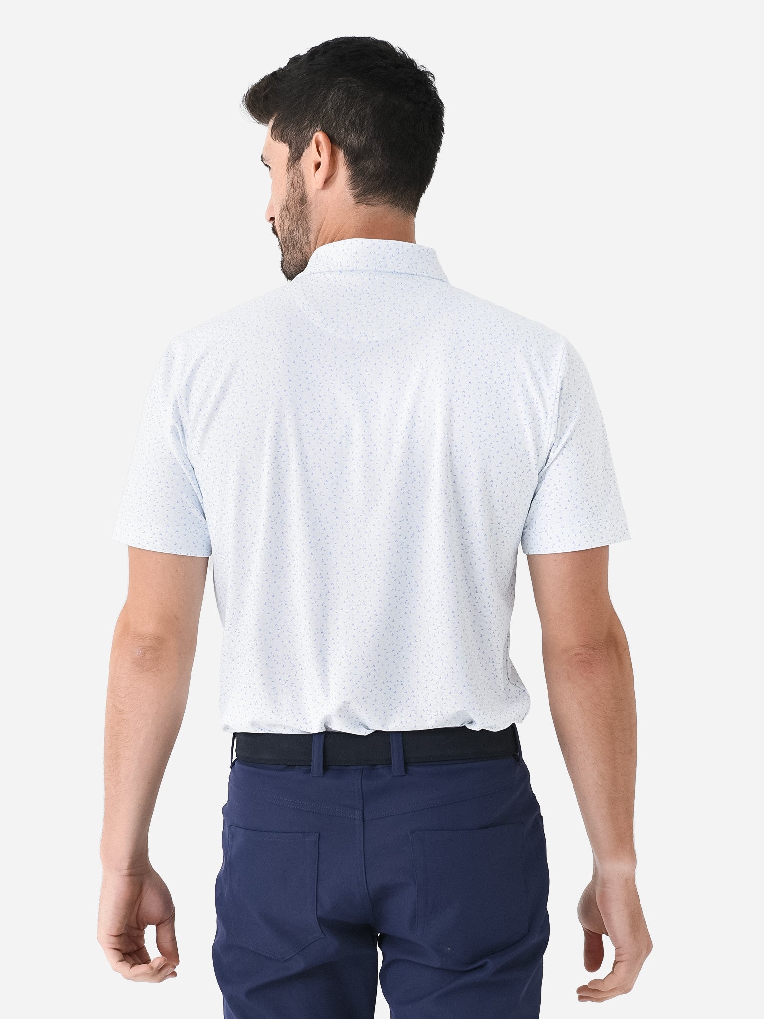 Antimicrobial polo with a three-button placket and custom geometric print.