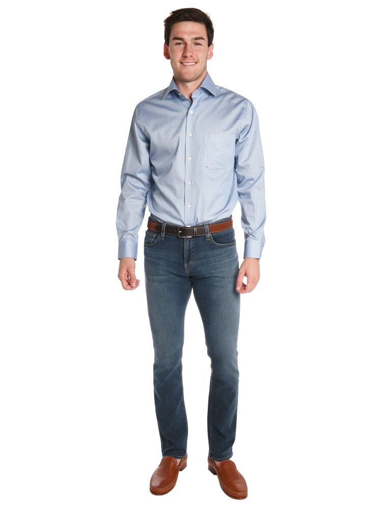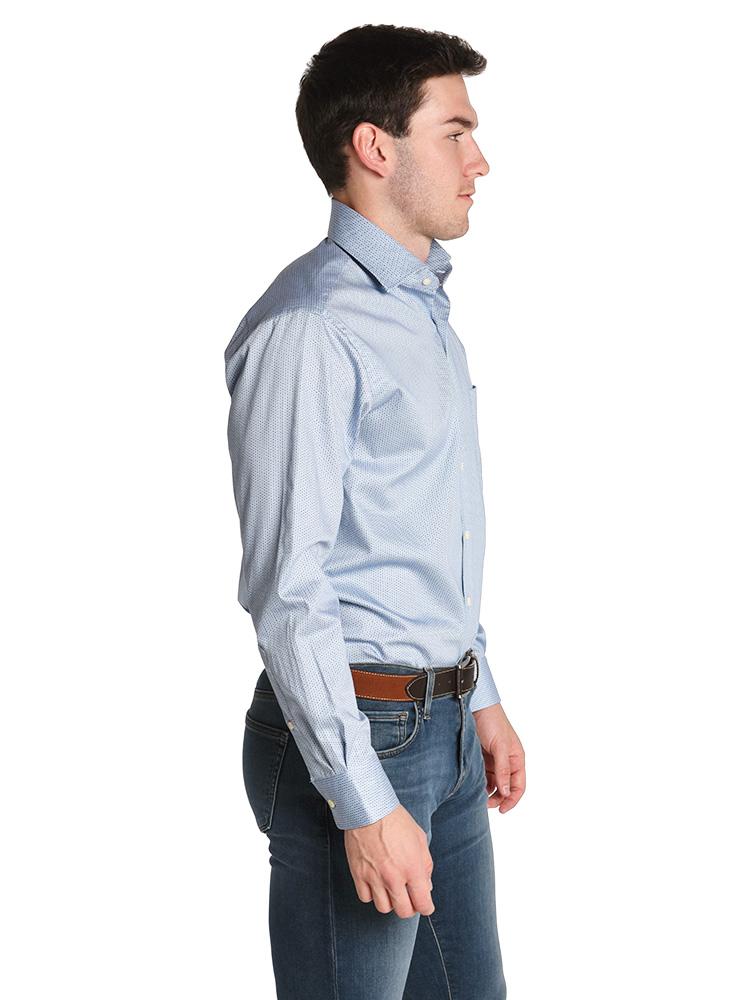 - Spread collar, French-front placket, elongated tail, double-button barrel cuff, box-pleat center back yoke
