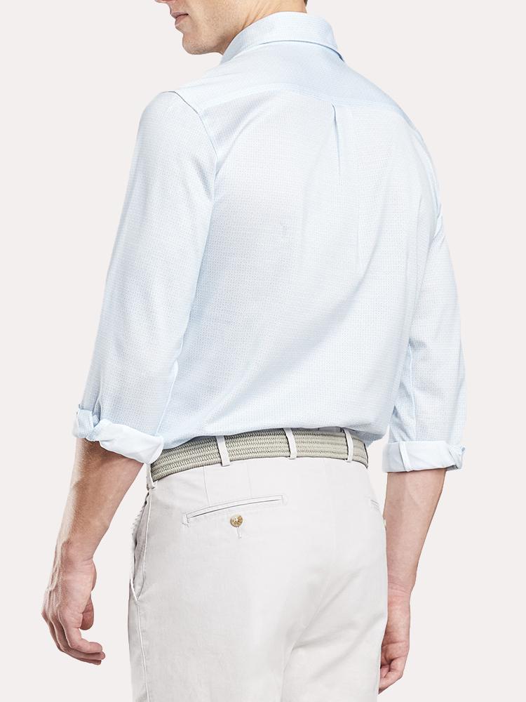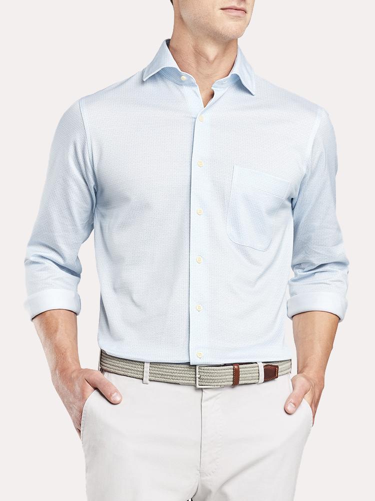 The Peter Millar Ocean Blue Sport Shirt is made of a soft cotton jersey mesh fabric for easy comfort under jackets.